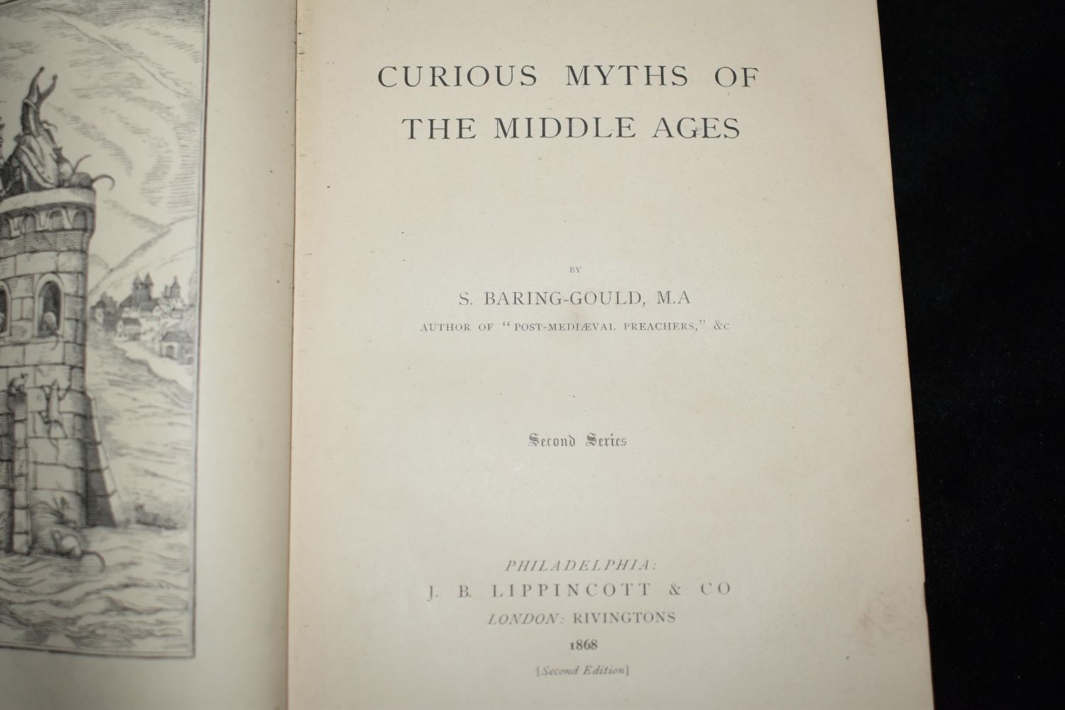 Curious Myths of the Middle Ages, : second series by BARING-GOULD, S. Published by Philadelphia, J. B. Lippincott 1868. Original Black cloth hardback with gold gilt/print. Excellent condition. very minor shelf wear. 374 pgs 7 1/8" by 5 1/4"