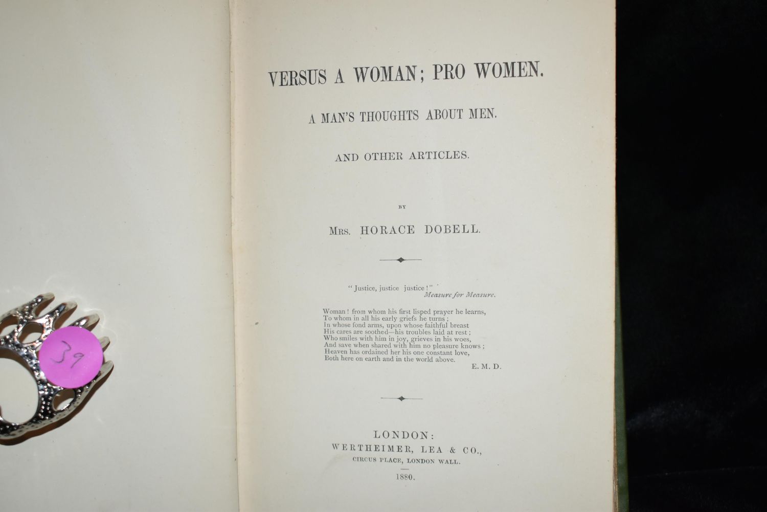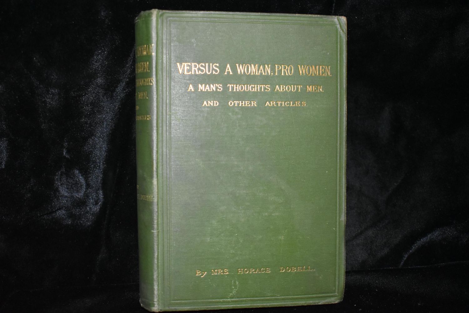 VERSUS A WOMAN, PRO WOMAN. A MAN’S THOUGHTS ABOUT MEN and other articles by Mrs Horace Dobell. London: Wertheimer, Lea Co 1880. Publishers original Green Cloth with Gold gilt. Good Condition with some shelf wear. 304 pgs 7 5/8 by 5 1/2"
