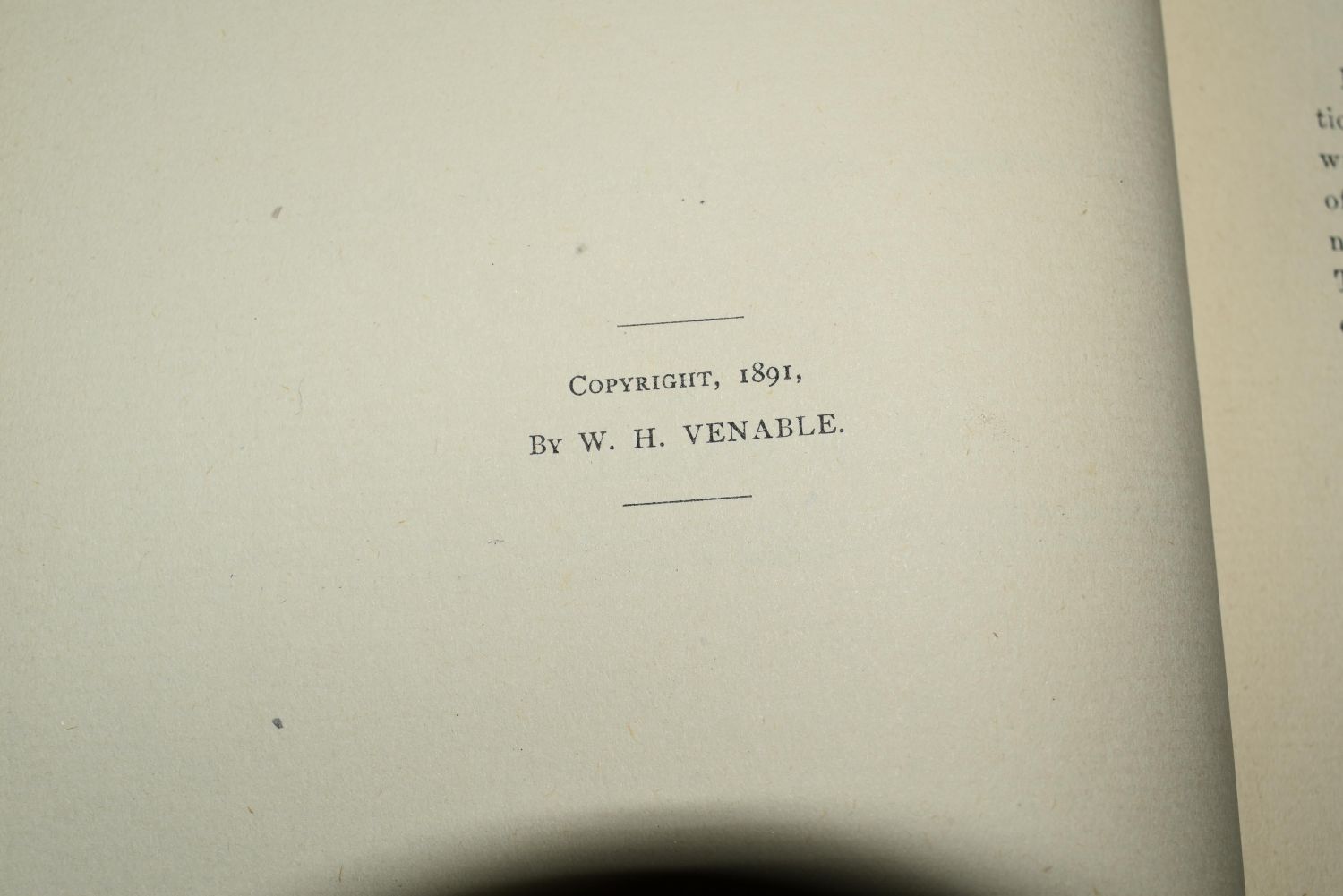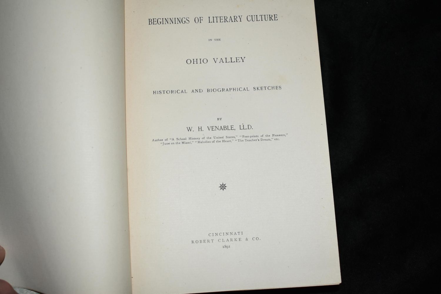 Beginnings of Literary Culture in the Ohio Valley Historical and Biographical Sketches by W. H. Venable. Robert Clarke and Co 1891. Original hardback in blue cloth with gold print. Very Good Condition. Couple small spots of orange paint on the cover. 519 pgs 9 1/2" by 6 1/2"