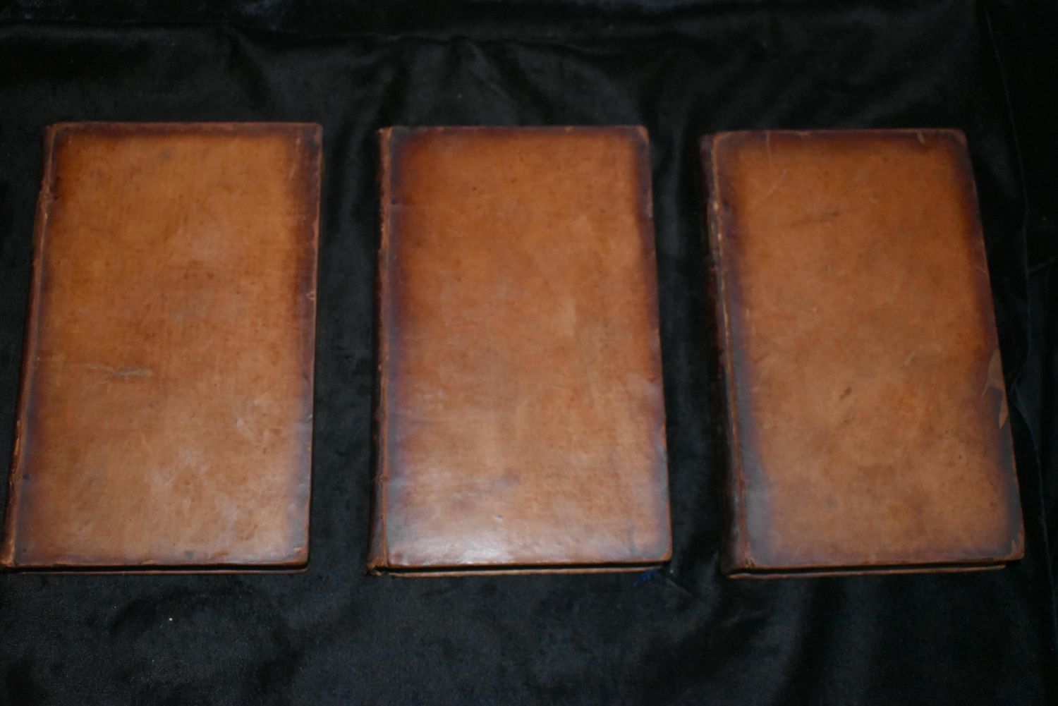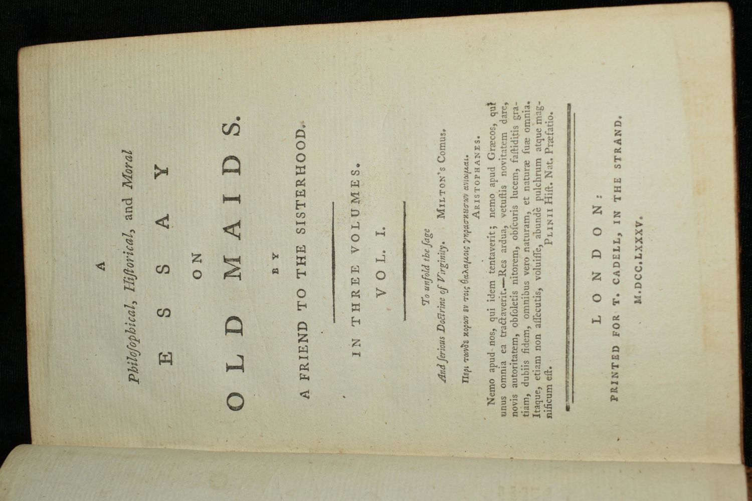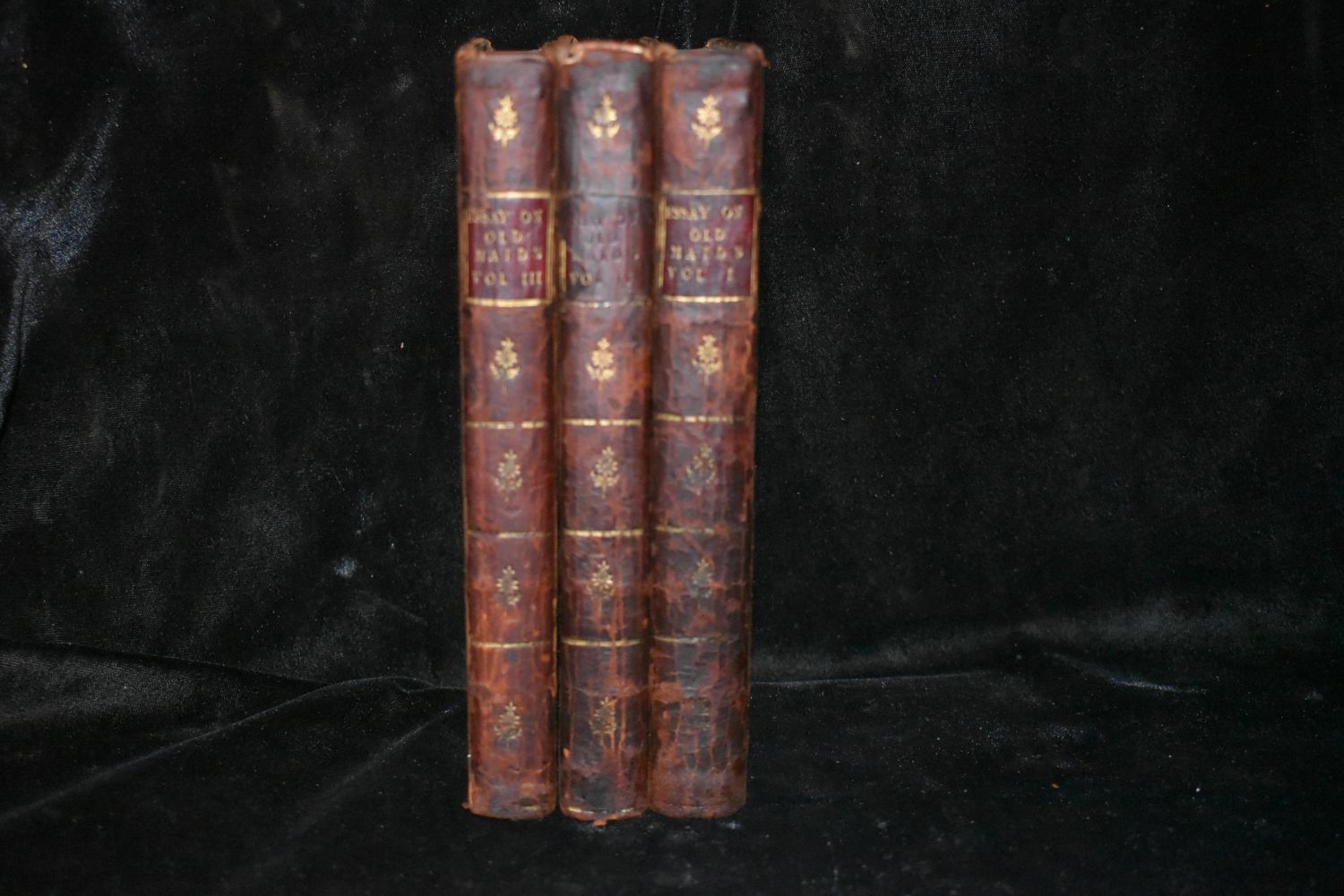 A PHILOSOPHICAL, HISTORICAL AND MORAL ESSAY ON OLD MAIDS, by a Friend to the Sisterhood by William Hayley. Published by T. Cadell: London 1785. 1st Edition. 3 Volume Set. Original Publishers full leather with gold gilt and name plates. Good Condition. Some shelf wear. Volume 2 is missing its label. Very good internally for their age. Very minor foxing with the expected page toning for age. 255, 250,and 261 pgs. 7 3/8" by 4 3/4"