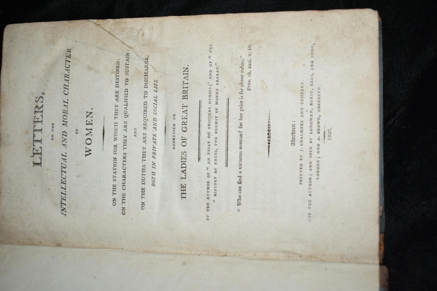Letters, on the Intellectual and Moral Character of Women by William Duff. Printed by J. Chalmers and Company 1807. 1st Edition Original publishers hardback with leather spine and blue cloth boards. Cover is very rough. Pages are all good except 83 which is torn but still in place. Minor foxing here and there but mostly good inside. 306 pgs 8 5/8" by 5 3/8"