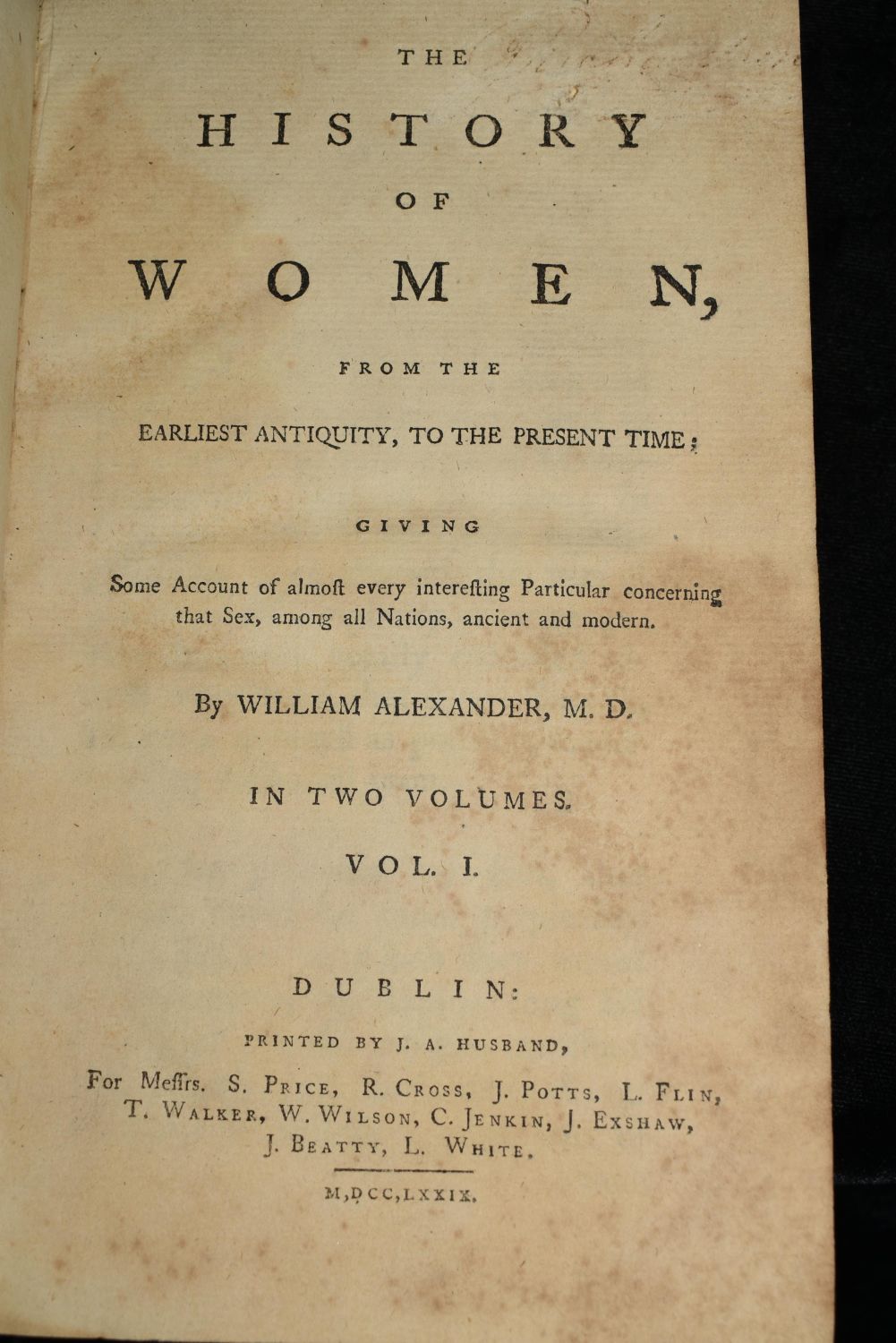 The History of Women, from the Earliest Antiquity, to the Present Time; Giving Some Account of almost every interesting Particular concerning that Sex, among all Nations, ancient and modern by William Alexander. Published by W. Strahan and T. Cadell, London 1779. 1st Edition. Two volume set. Original Publishers half leather with marbled boards. Both are in very good shape for their age. Shelf wear to covers with some foxing to pages. 449 and 448 pages plus many pages of index’s. 8 1/8" by 5 1/4"