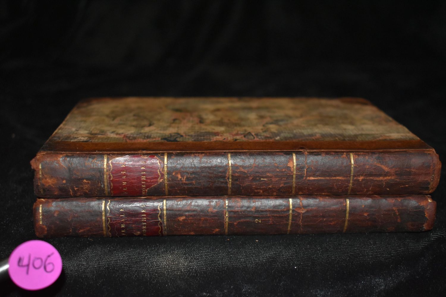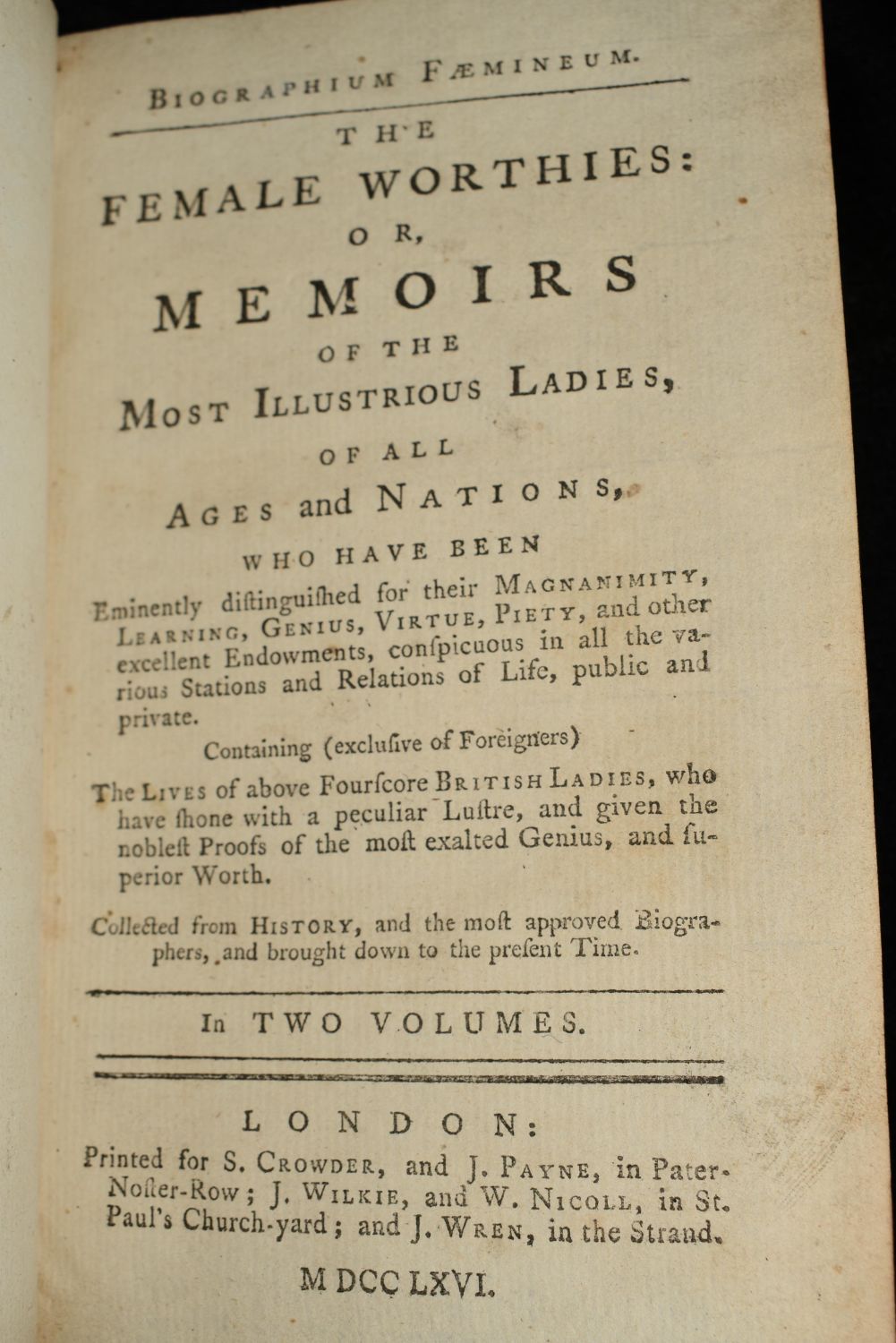 The female worthies or, Memoirs of the most illustrious ladies of all ages and nations by Julia P Wightman. London: Printed for S. Crowder, and J. Payne in Paternofter Row 1766. 1st Edition. 2 Volume Set. Publishers original hardbacks in half leather with marbled boards and gold gilt. Very good + condition for their age. Some shelf wear to covers. 273 and 261 pgs 6 3/4" by 4 3/8"