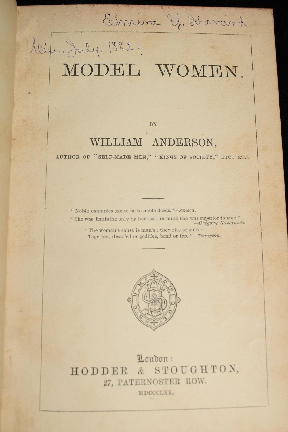Model women by William Anderson. Published by Hoddor and Stoughton 1870. 1st Edition. Original publishers hardback in half leather with decorative boards and gold gilt with name plate. Very Good+ Condition. 351 pgs 6 3/8" by 4 1/2"