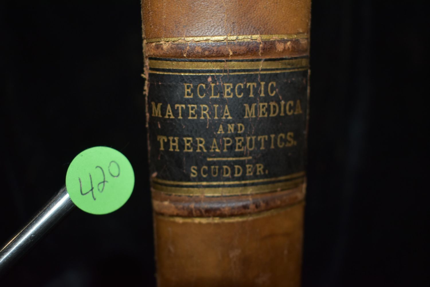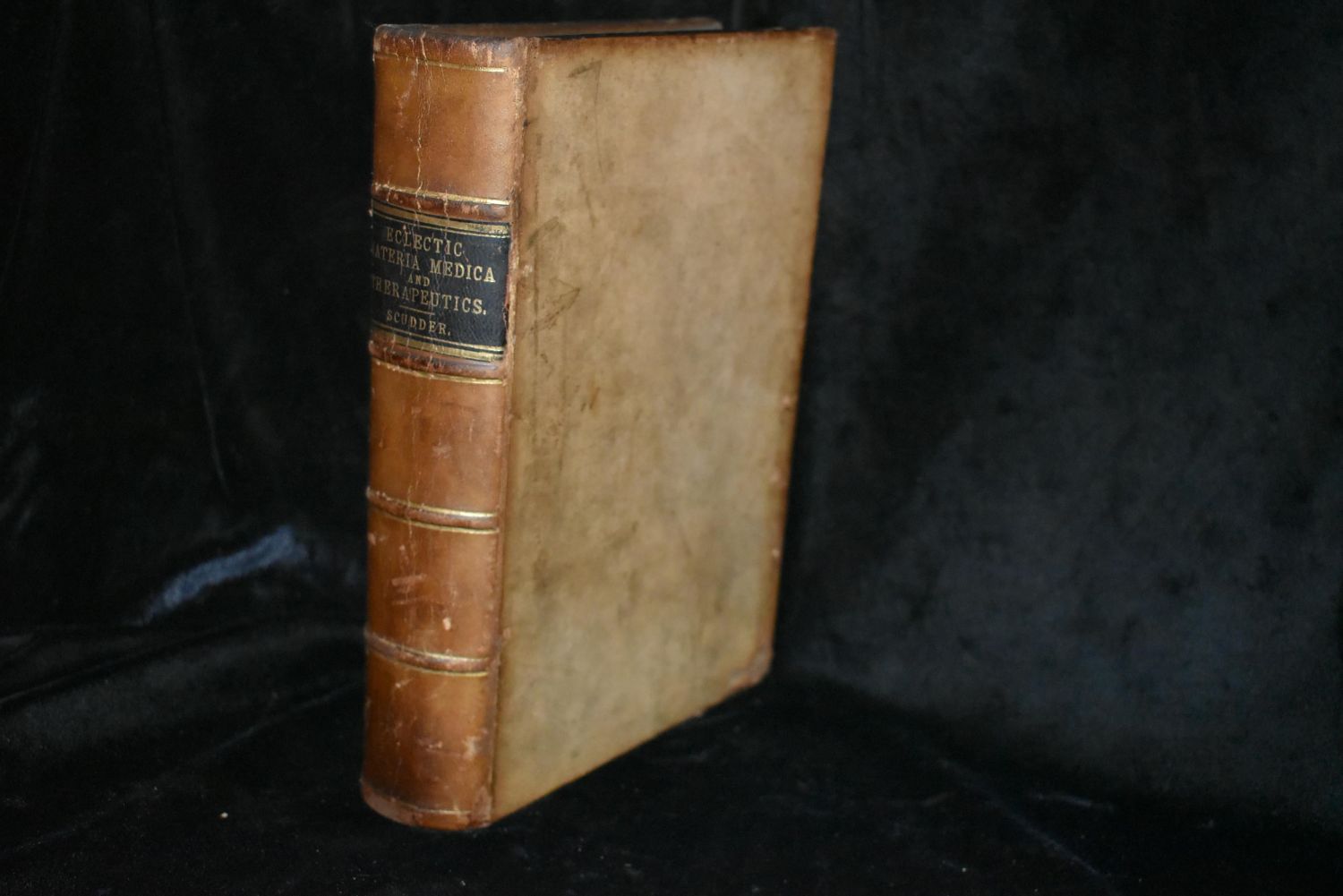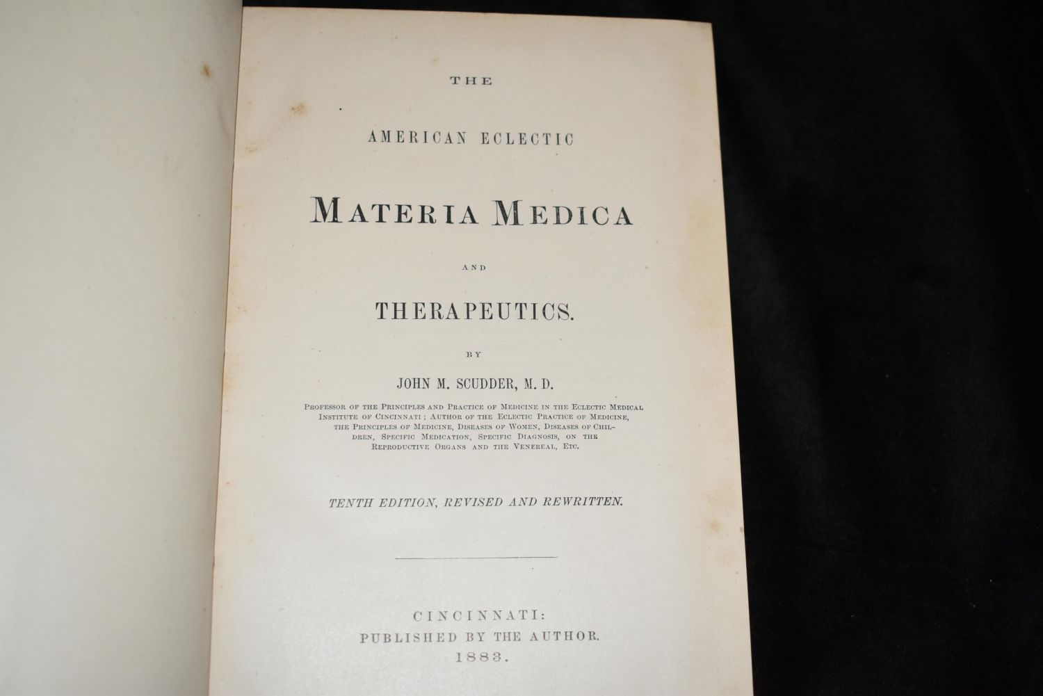 THE AMERICAN ECLECTIC MATERIA MEDICA AND THERAPEUTICS SCUDDER, JOHN M.. Published by John Scudder, Cincinnati (1883). Publishers full leather hardback with gold gilt. Very Good Condition. Shelf wear to corners. 748 pgs 9 3/8" by 6 1/2"