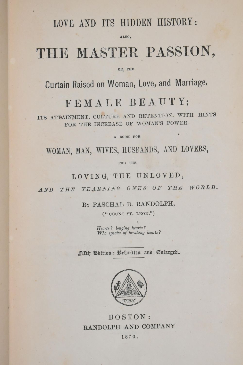 LOVE AND ITS HIDDEN HISTORY 1870 by Paschal B. Randolph. Boston: Randolph and Company 1870. "A Book for woman, man, wives, husbands, and lovers for the loving, the unloved and the yearning of the world". Publishers original Black embossed cloth with gold gilt. Good Condition. Some Shelf wear 178 pgs. 9 1/2" by 6"