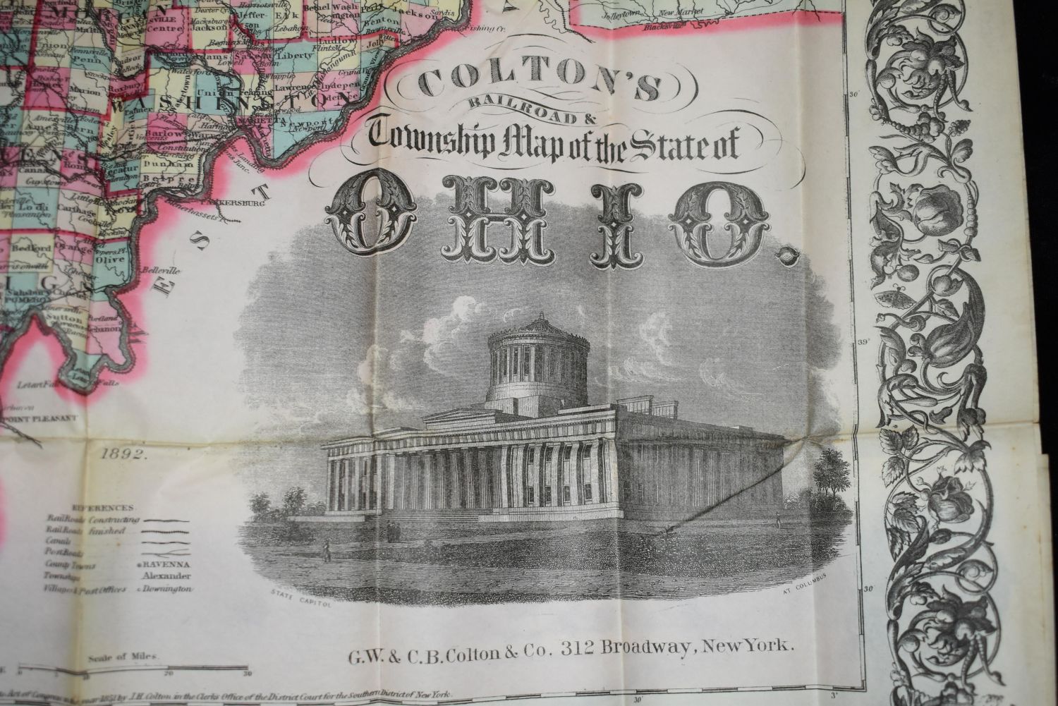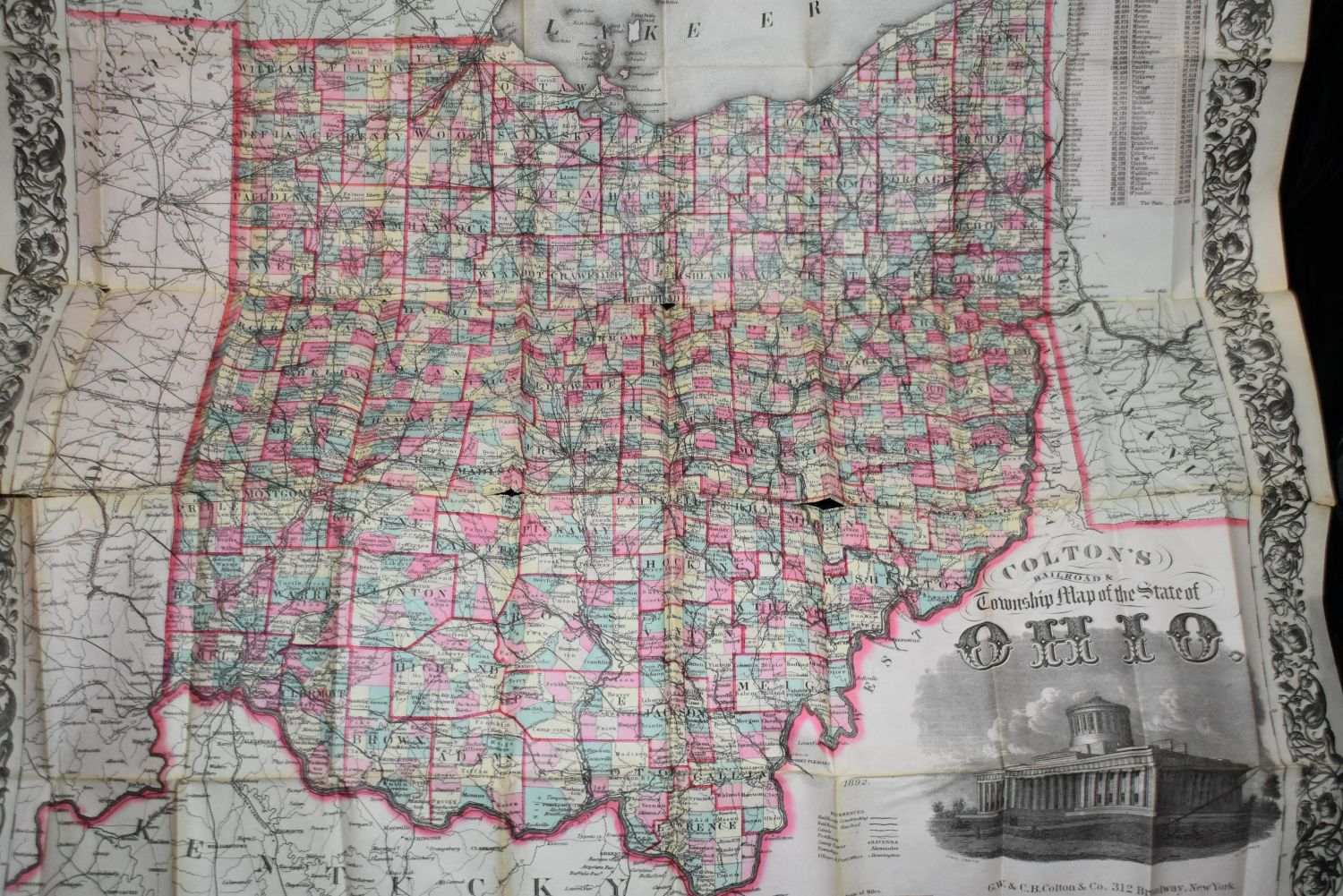 Colton’s Railroad & Township Map of the State of Ohio by G. W. & C. B. Colton & Company 1851. Its in its original cover. The map is a fold out that comes out of the cover. Cover is rough but the map is in really good shape for its age. 25" by 27" 1851 Map