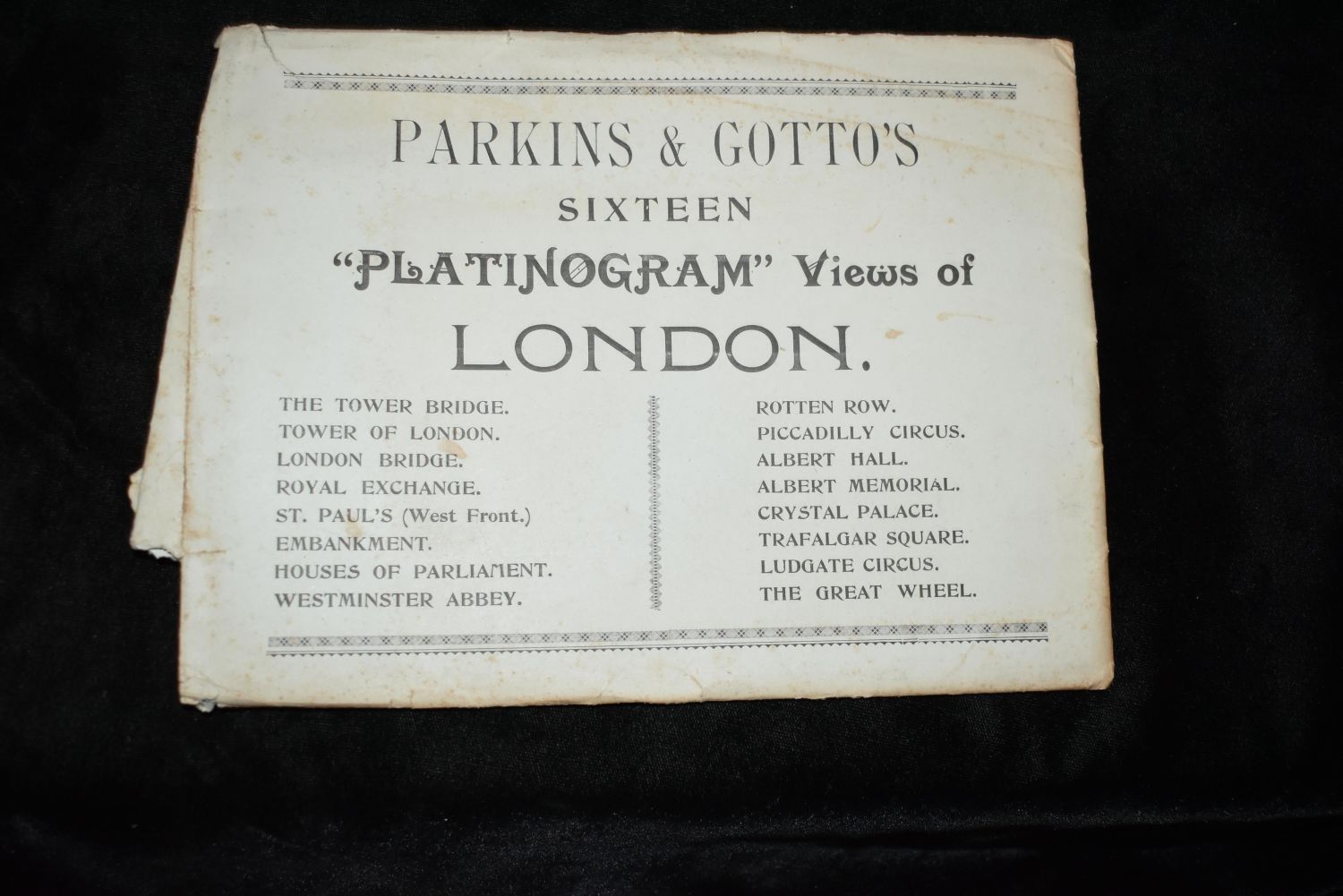 16 "Platinogram’s" of London from the mid to late 1800’s by Parkins & Grotto. Couldn’t find a copy of these on the web. Parkin’s and Grotto were in business from 1852 to 1912. They give a great view of the life and times of London for that period. The pictures are in excellent condition and still in their original envelope.