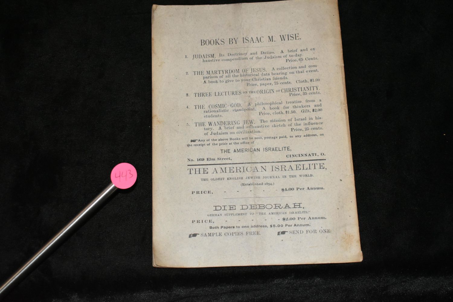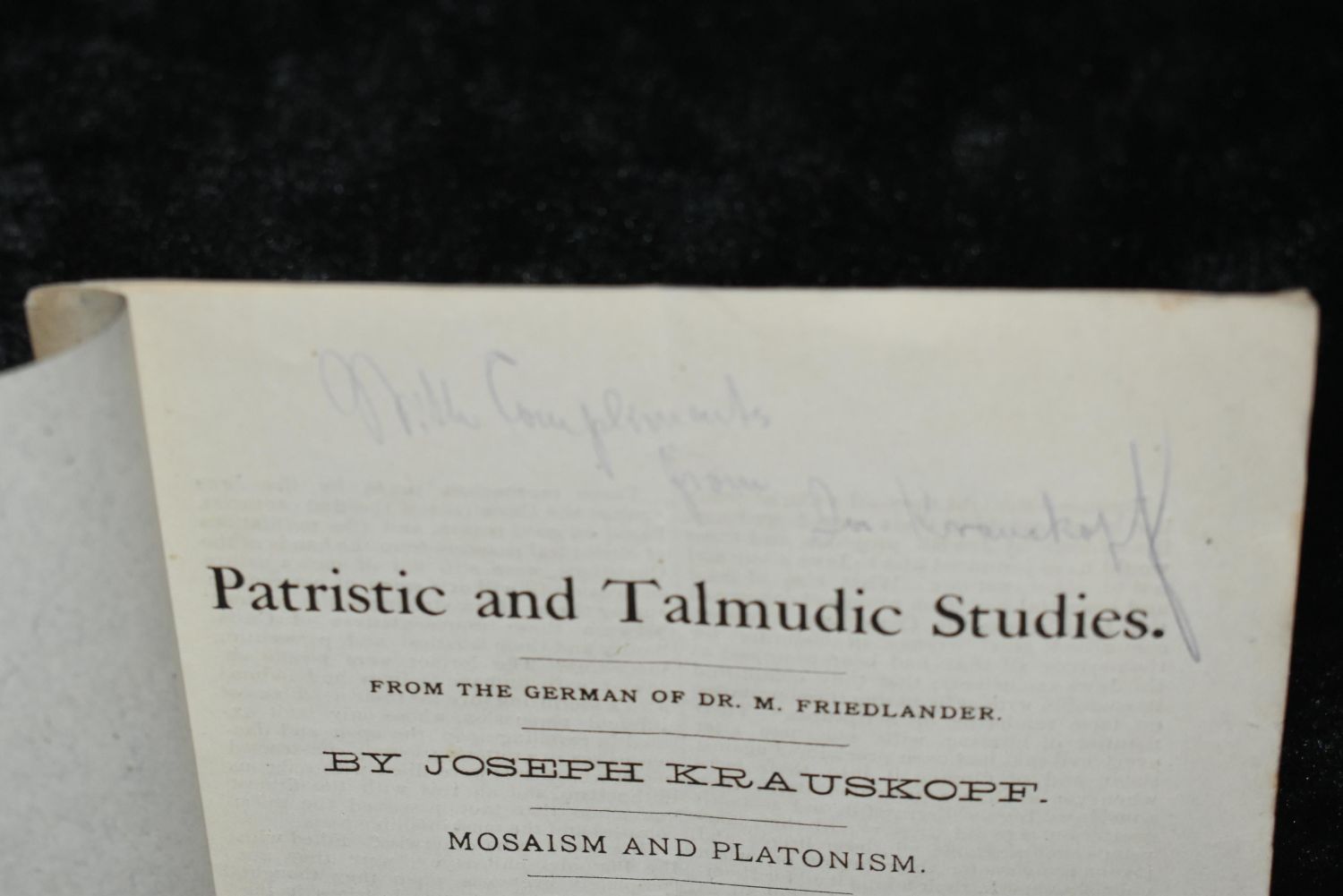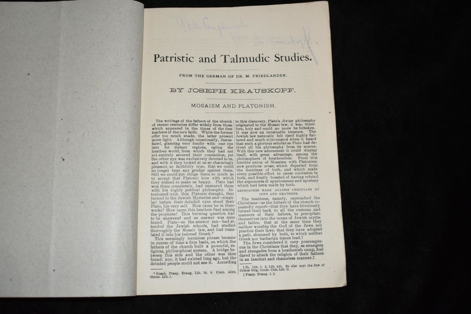 Patristic and Talmudic studies From the German of Dr. M Friedlaander by Joseph Krauskopf 1880’s. No Publisher or date in this softback. On the Back it advertises The American Israelite Est 1854. First page is signed by Joseph-"Joseph Krauskopf (1858 1923) was a prominent American rabbi, author, leader of Reform Judaism, founder of the National Farm School (now Delaware Valley University) , and long-time (1887-1923) rabbi at Reform Congregation Keneseth Israel (KI) , the oldest reform synagogue in Philadelphia which under Krauskopf, became the largest reform congregation in the nation. " (Wikipedia, 2016). Very Good Condition. 21 pages 8 3/8" by 6"