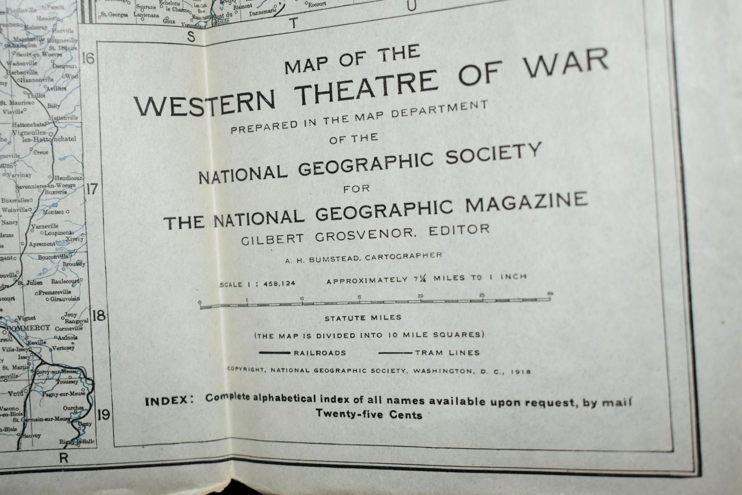 Map of the Western Theatre of War by National Geographic. Published by National Geographic (1918) Original 1918 Published Map of the Western theatre of the first World War. Very Good condition for its age. One minor tear mid left side of the map shown in photo. 32 1/2" by 27"