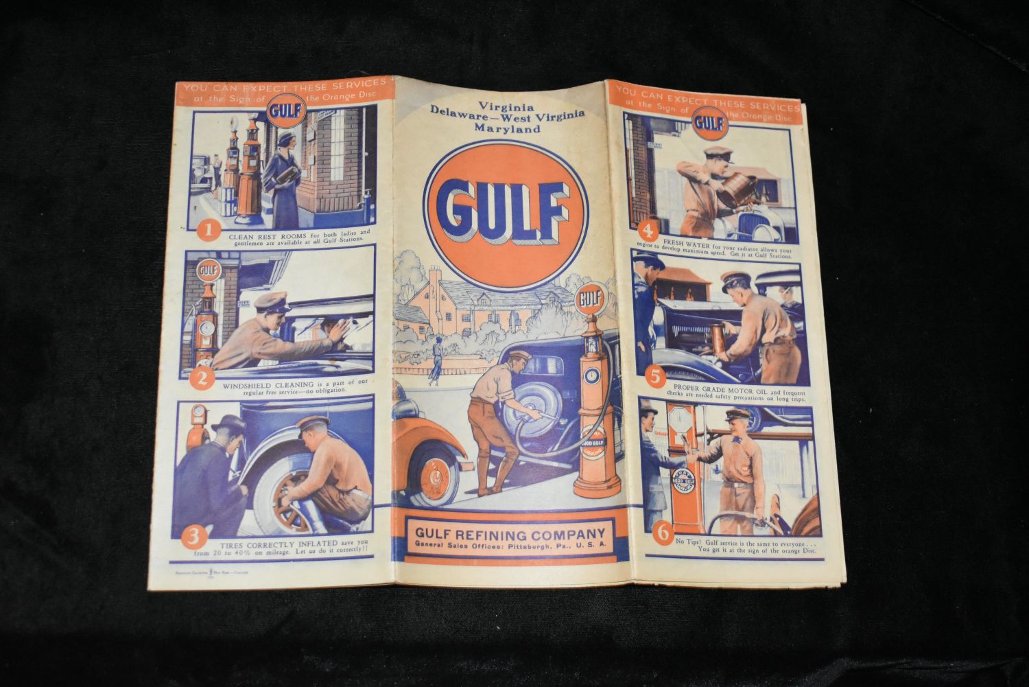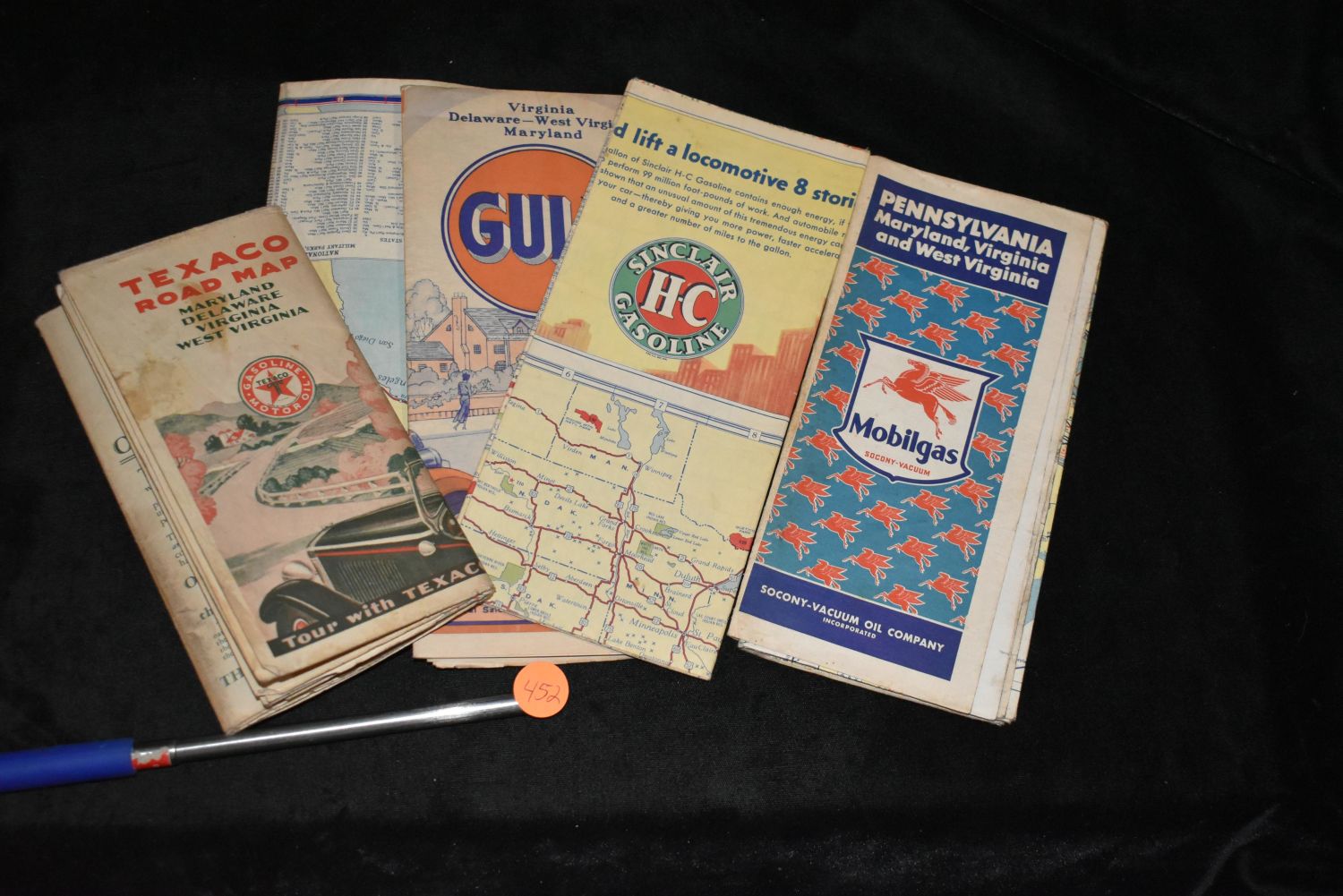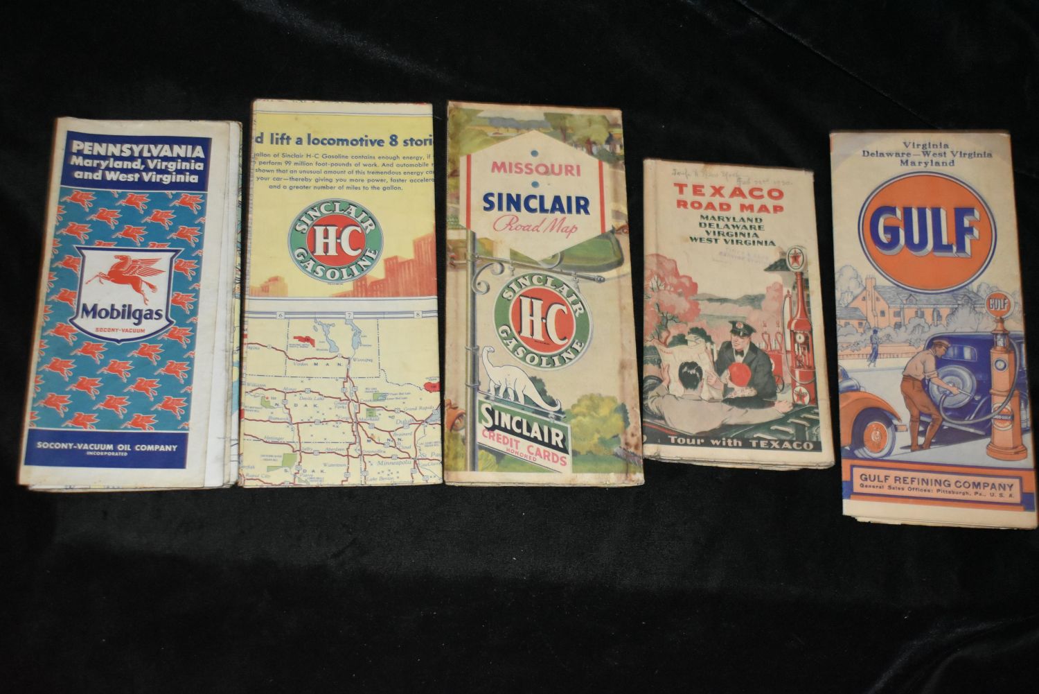 2 Sinclair Maps of Missouri 1930’s; Texaco Road Map 1929 or 1930 of Maryland, Delaware, Virginia and West Virginia; Mobilgas road map of Maryland, Virginia and West Virginia and One Gulf Gas Station map of Virginia, Delaware-West Virginia and Maryland. All are in very good condition for their age. Pictures show off the cool marketing illustrations used in that era.