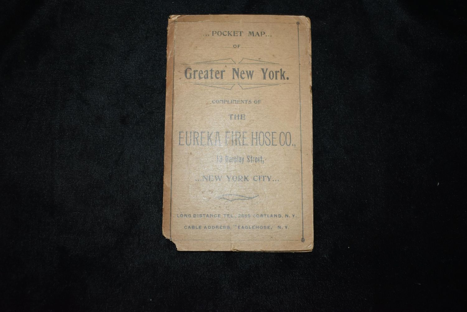 Pocket Map of Greater New York 1898 Compliments of The Eureka Fire Hose Co., 13 Barclay Street, New York City. Very Good Condition for its age. Cover has a couple dings to it but the map is very nice. 21" by 14 1/2"