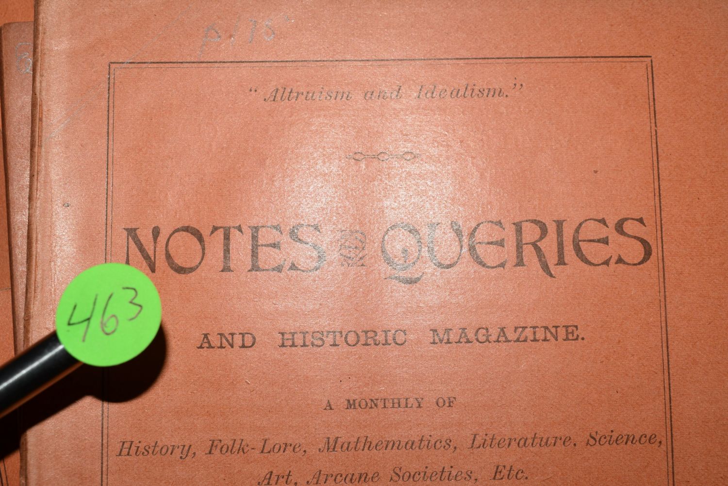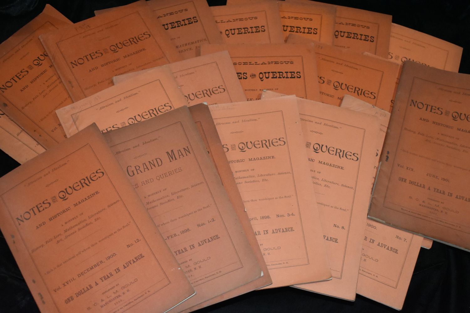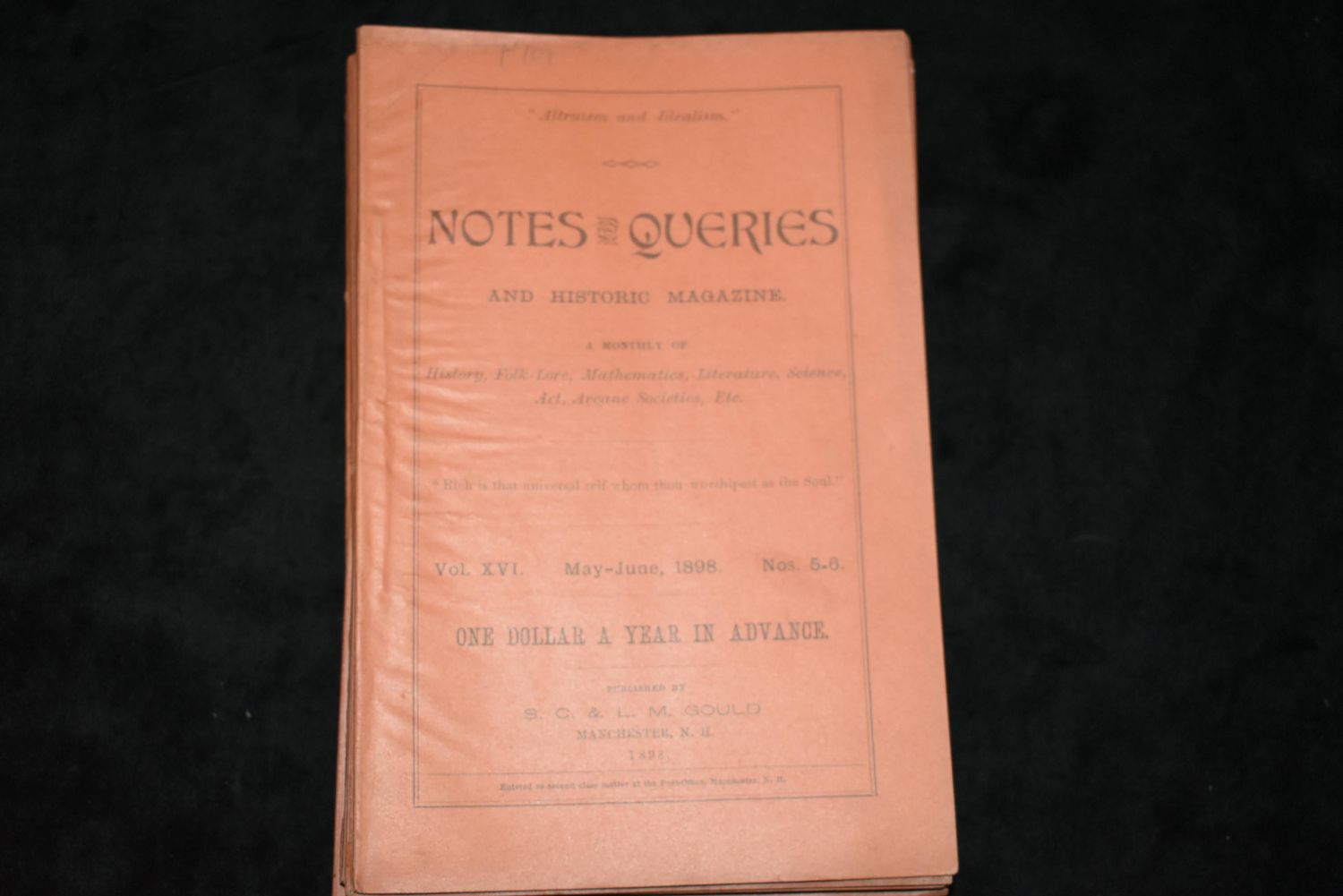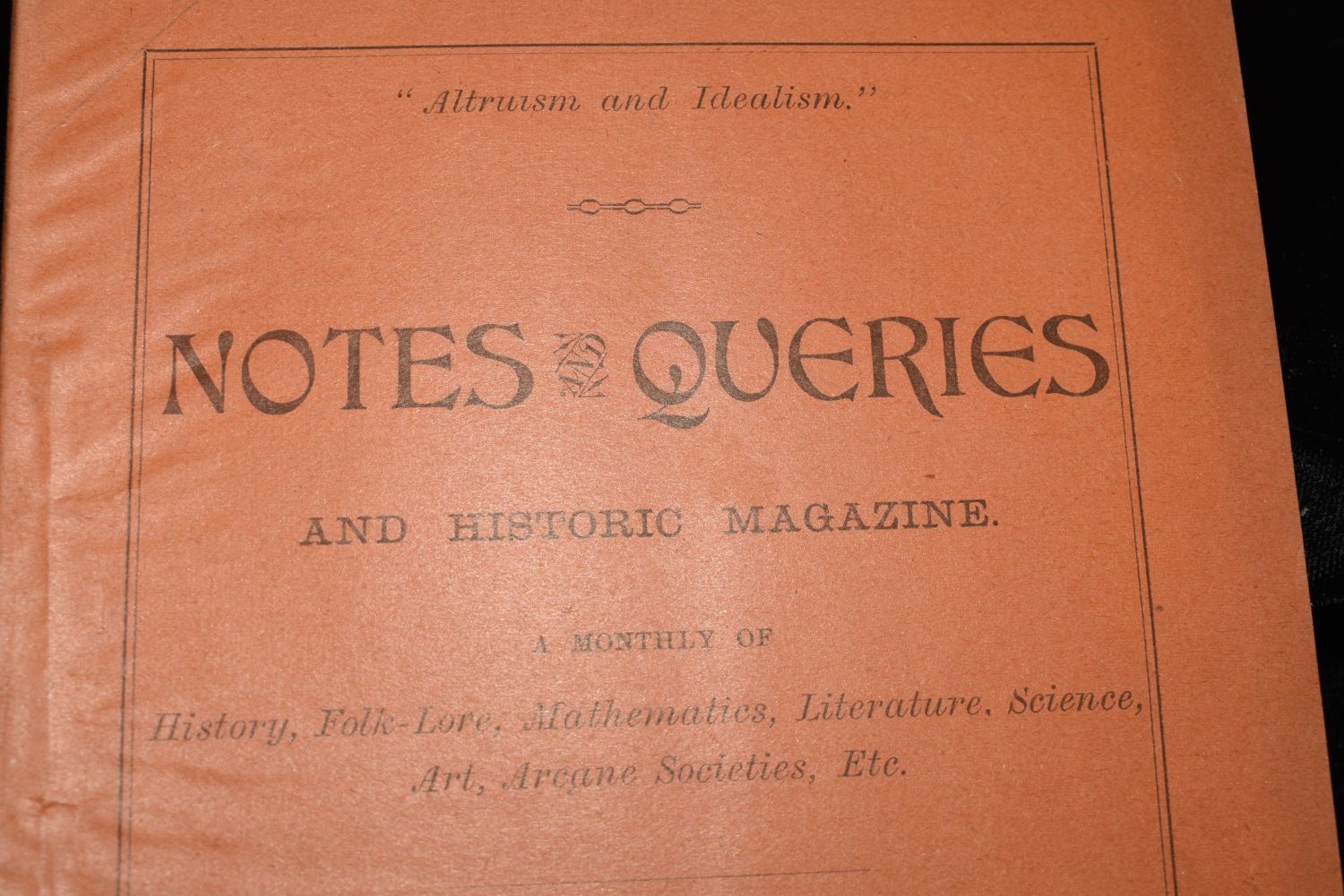 20 Volumes of Notes and Queries Magazine 1896-1901. Published by S. C. & L. M. Gould 1896-1901. This magazine covered issues of History, Folk-Lore, Mysticism, Art, Science, Arcane Societies, altruism and idealism etc . 20 volumes paperback all in good to very good condition. 9 by 5 7/8"