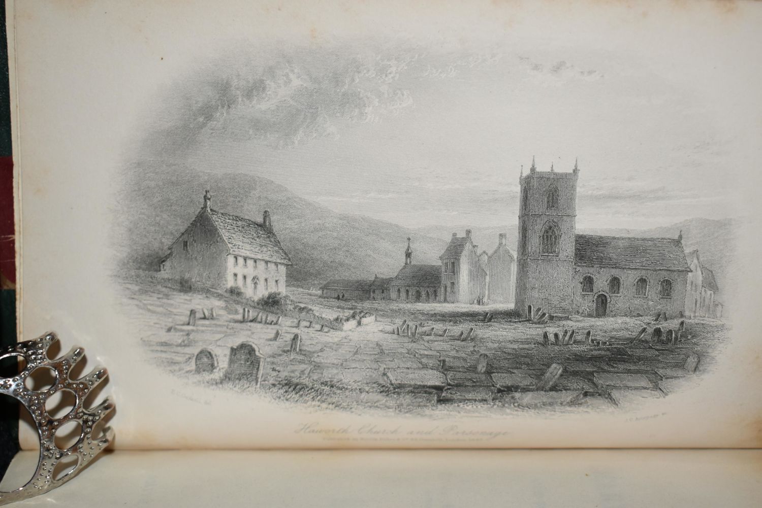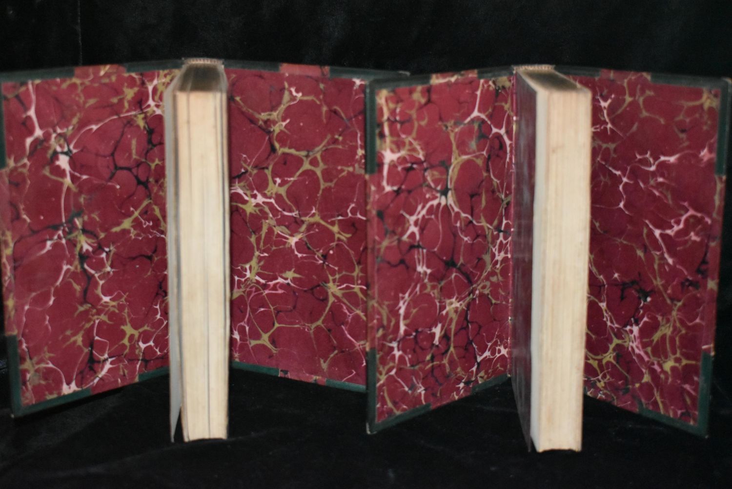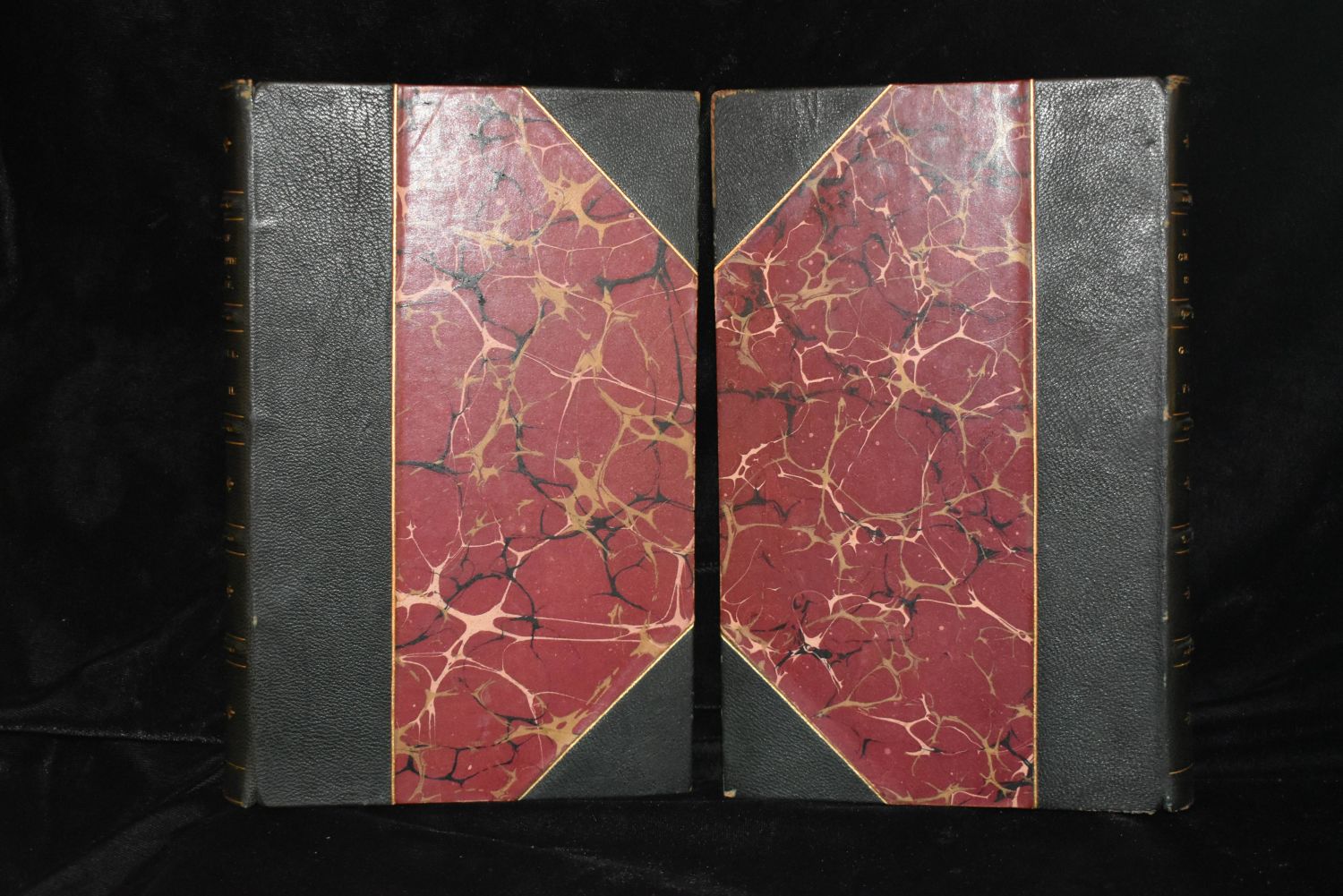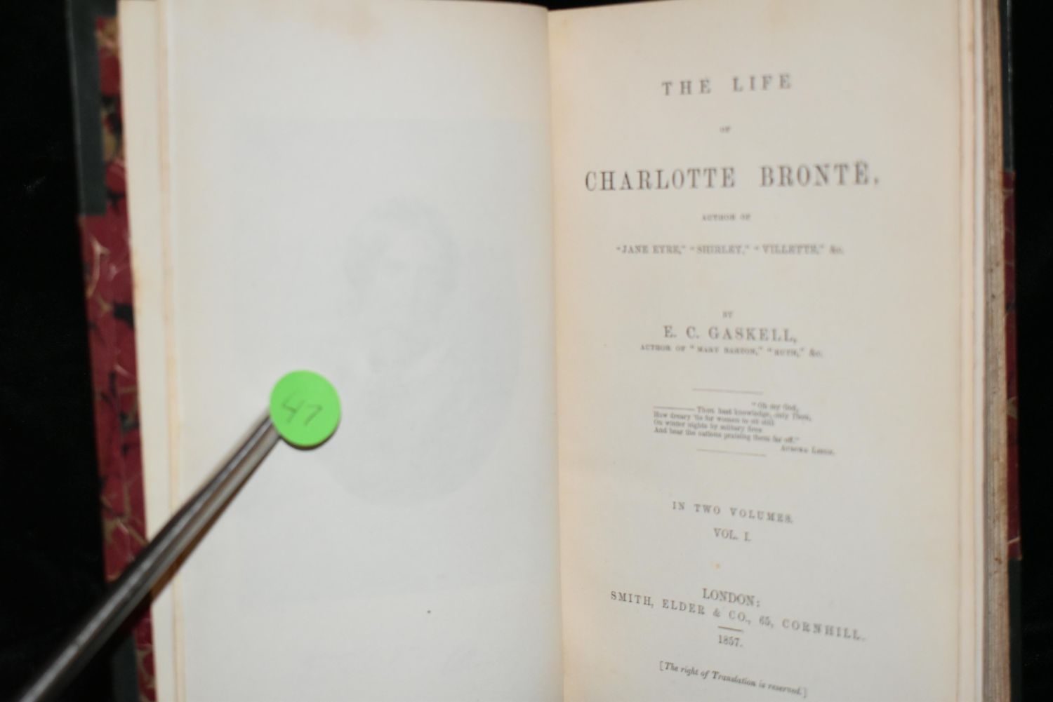 Life of Charlotte Bronte by E. C. Gaskell 1857. Published in London: by Smith, Elder and Co 1857. Volumes 1 and 2. Publishers Hardback half leather with decorative boards. Inside covers are decorative as well. Very Good Condition with a little shelf wear to corners. 358 pgs and 328 pgs. 8 1/8" by 5 1/4"