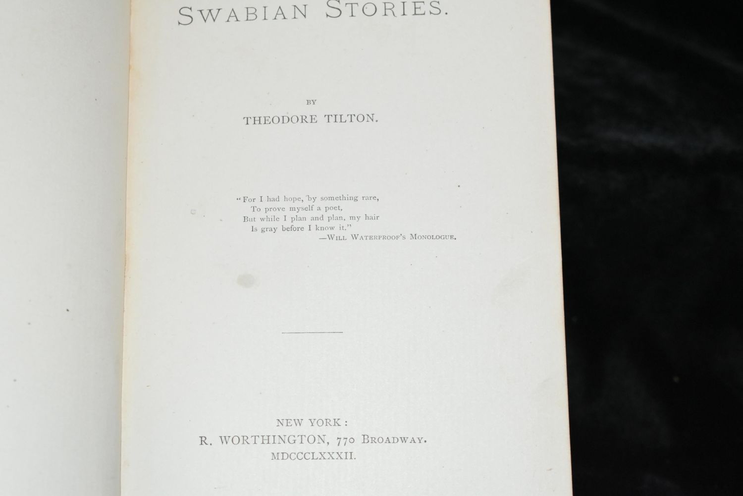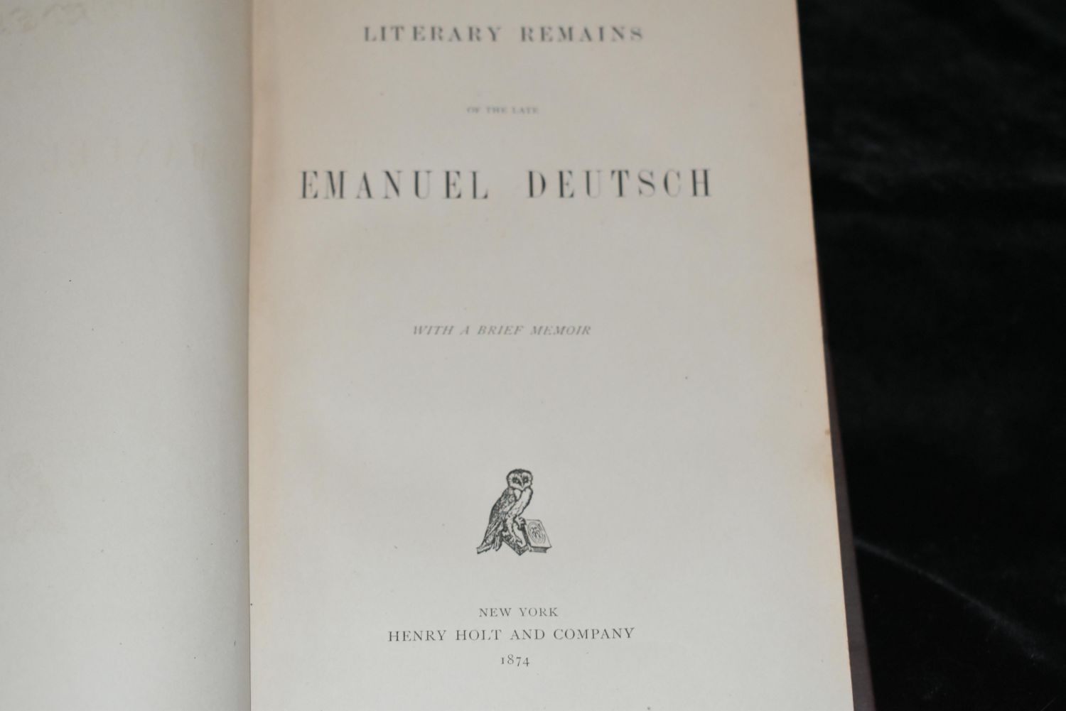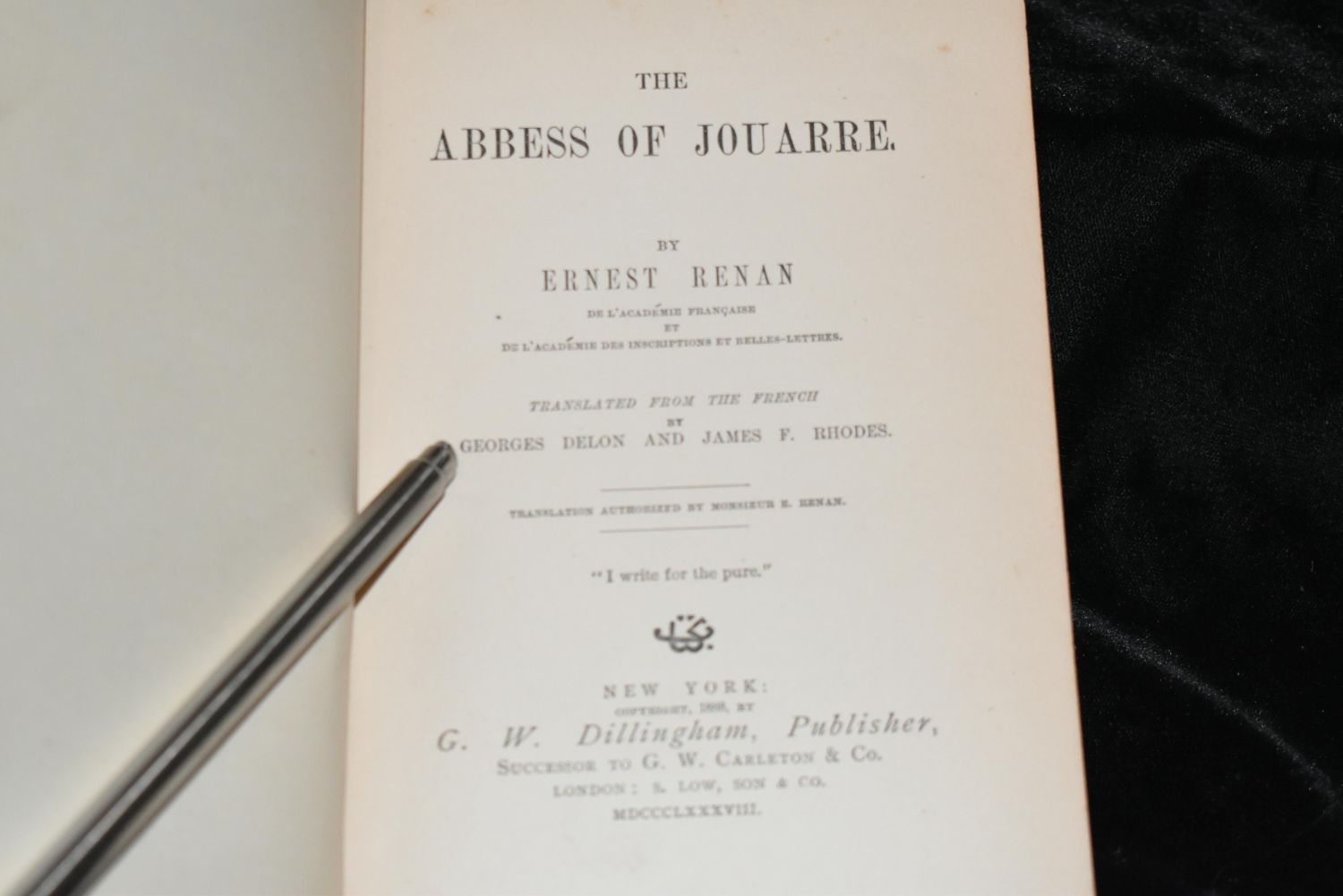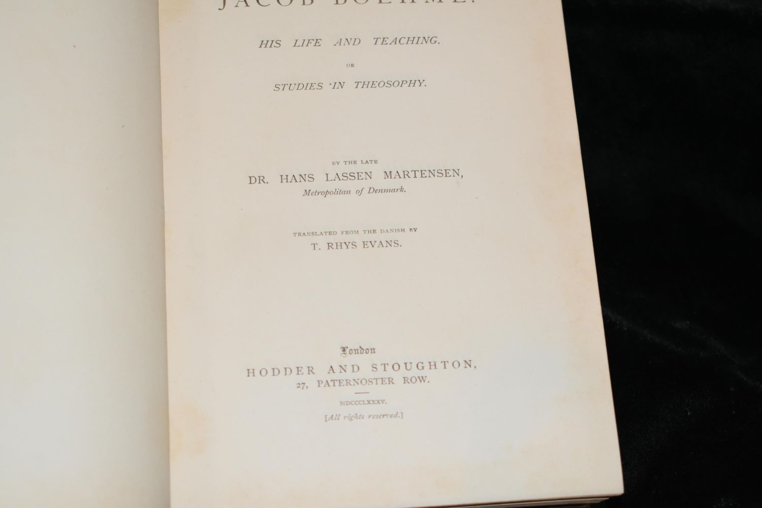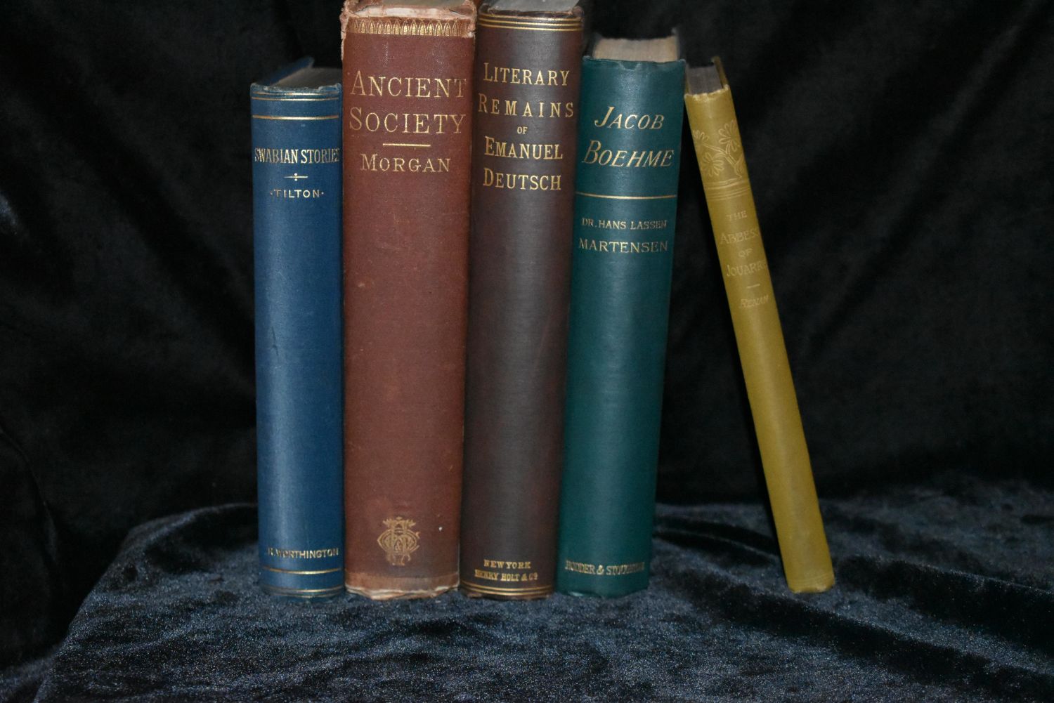 Swabian Stories by Theodore Tilton 1882 1st ed; The Abbess of Jouarre by Ernest Renan; Georges Delon 1888 1st Ed; Literary Remains of the Late Emanuel Deutsch 1874 1st Ed; Ancient society or researches in the lines of human progress from savagery, through barbarism to civilization by MORGAN, Lewis Henry 1877 1st Ed; Jacob Boehme: his life and teaching. Or, studies in theosophy by Hans Lassen Martensen 1885 1st English Edition translated from German. All Books are in good to very good condition. Tallest book is 8 3/4" by 6 1/4"