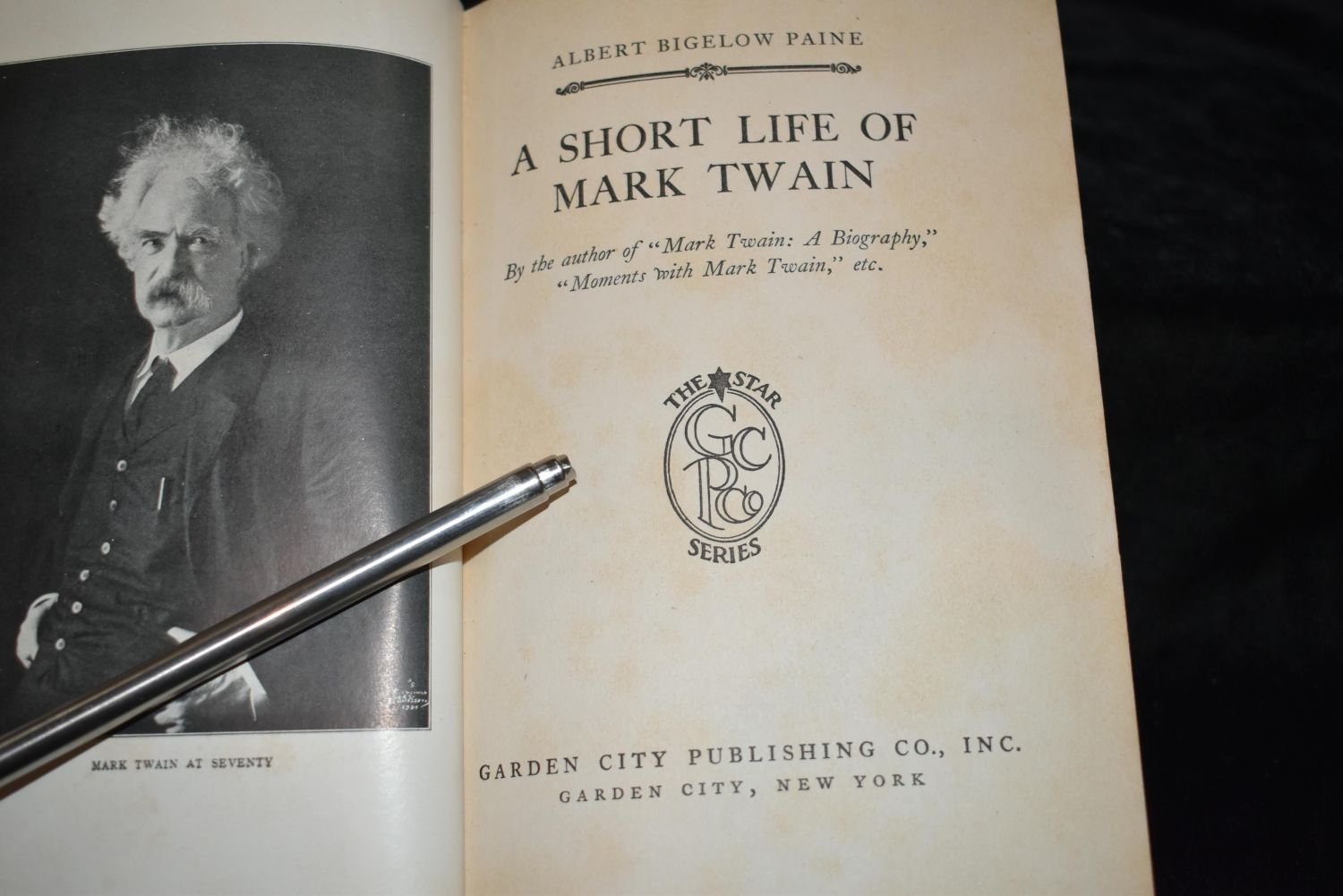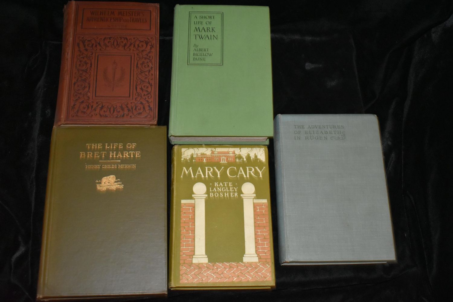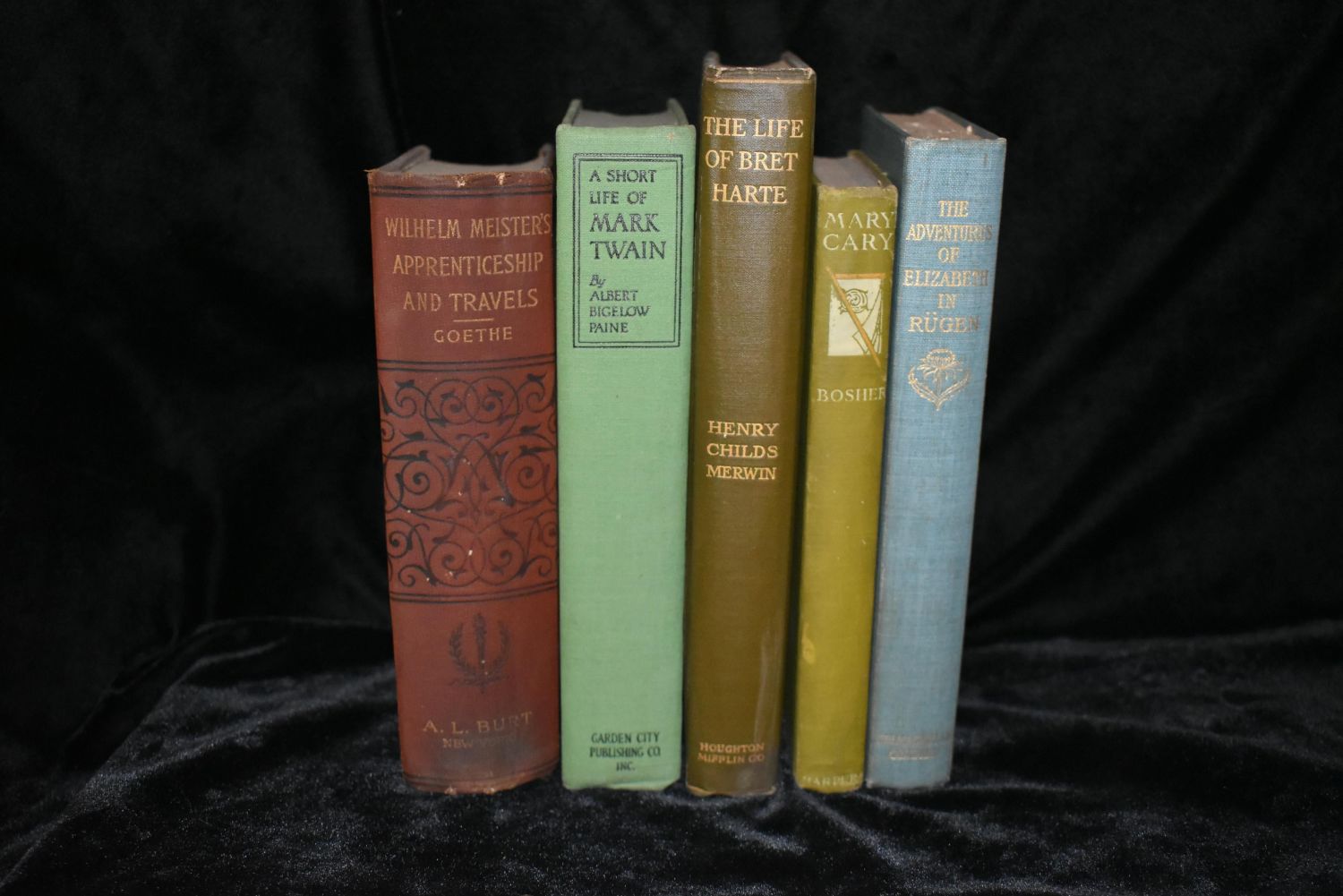 Wilhelm Meister’s Apprenticeship and Travels by Johann Wolfgang von Goethe 1900; A Short Life of Mark Twain by Albert Paine 1920; The Adventure’s of Elizabeth in Rugen by Elizabeth von Arnim 1904; Mary Cary by Kate Langsley Bosher 1910; and the Life of Bret Harte by Henry Merwin 1911. All books in good to very good condition. Tallest book is 8 7/8" by 6 1/8"
