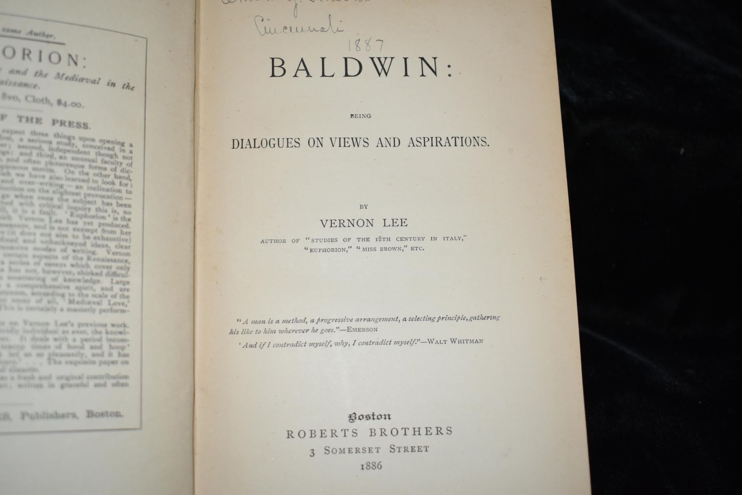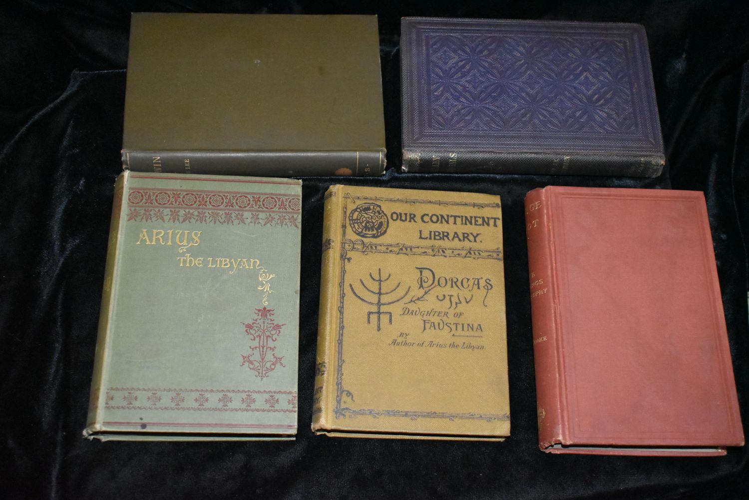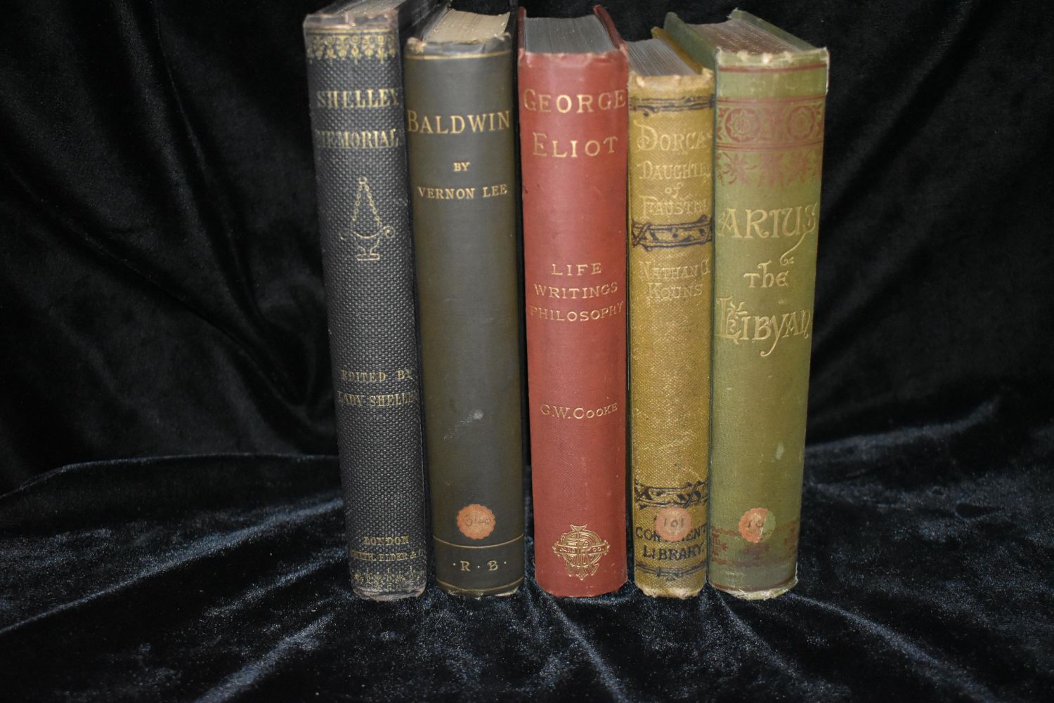 Baldwin: Dialogues on Views and Aspirations by Vernon Lee 1886 1st Ed; Dorcus: The Daughter of Faustina by Nathan Kouns 1884 1st Ed; Arius the Libyan : an idyl of the primitive church by Nathan C Kouns 1884 1st Ed; Shelley Memorials: From Authentic Sources. To which is added an essay on Christianity. Now first reprinted. SHELLEY, Lady. (editor) 1859 1st Edition; and George Elliot by George Cooke 1883 1st ed. All books in good to very good condition. Some shelf wear some foxing to some pages. Tallest book is 7 3/4" by 5 3/8"