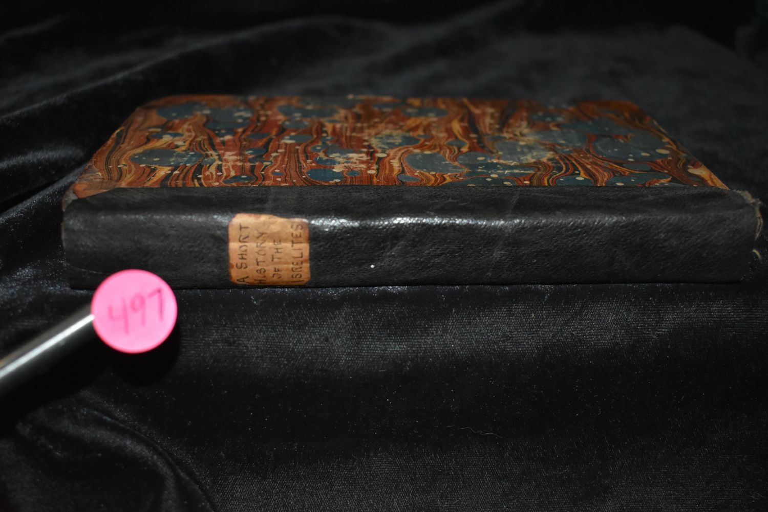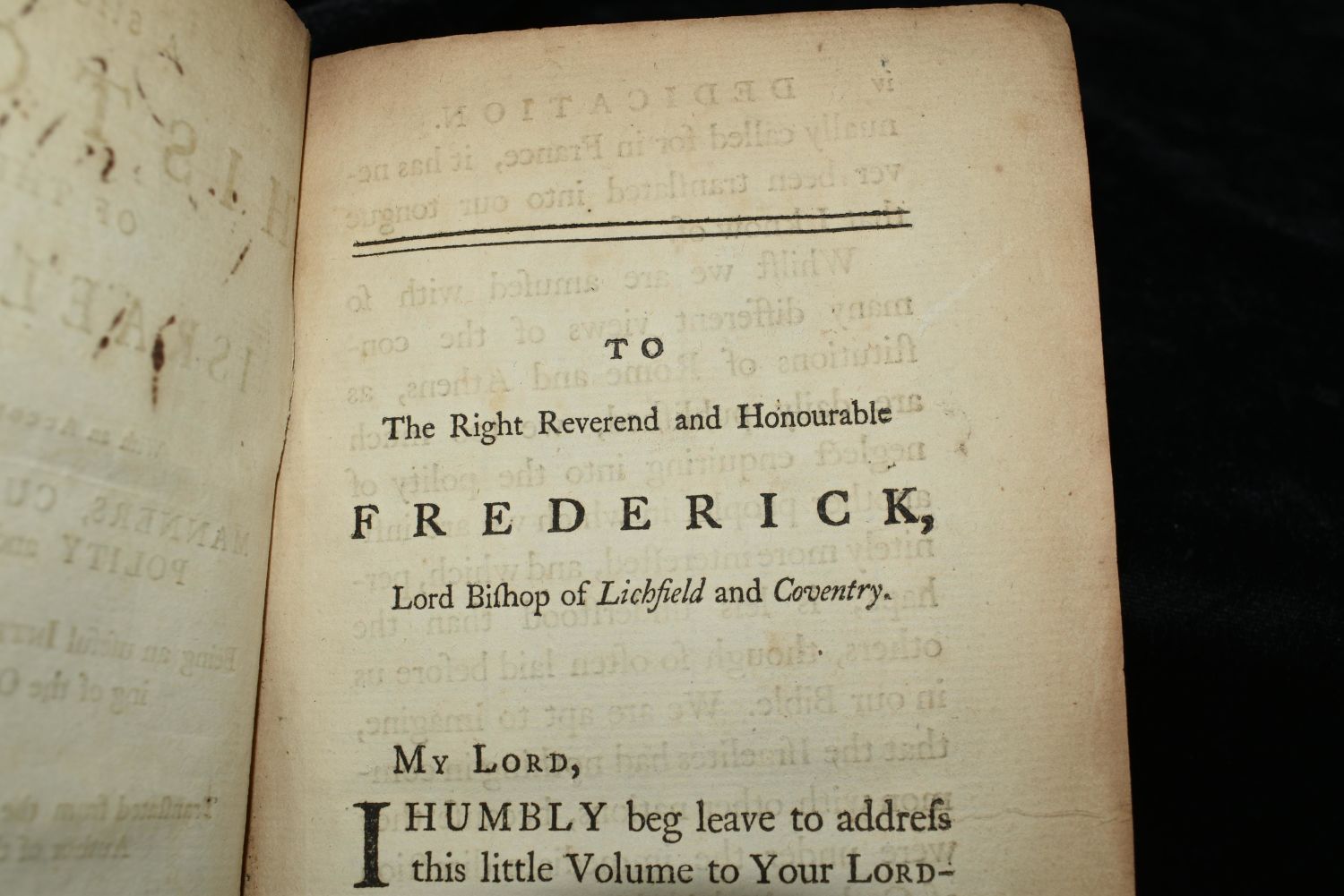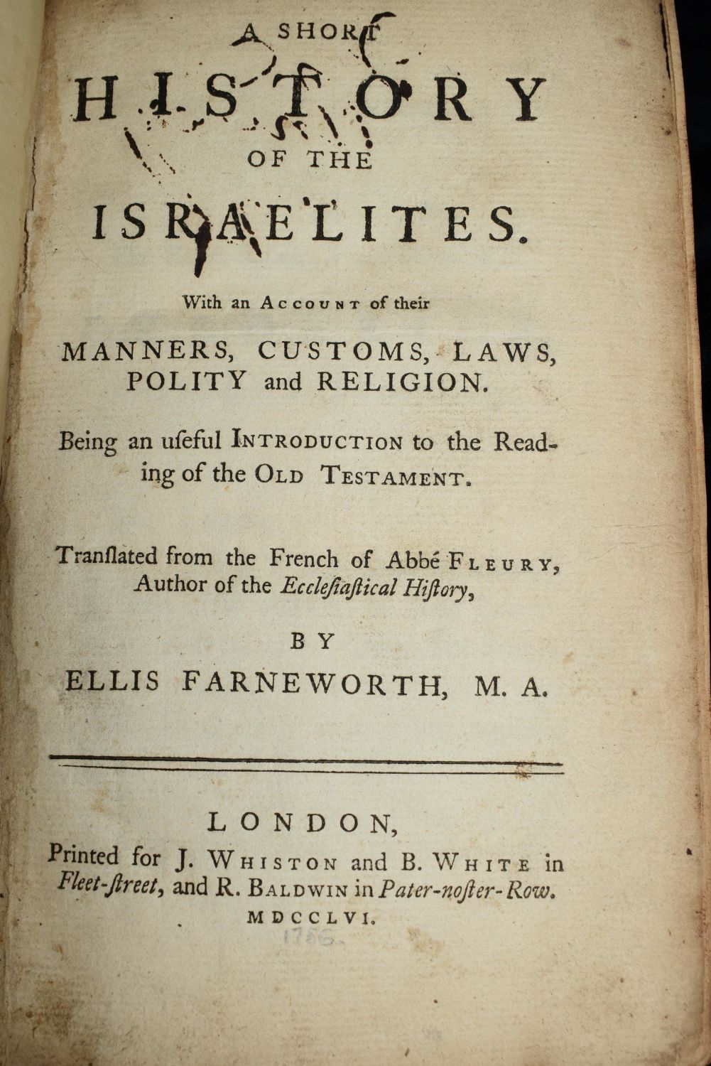 A Short History of the Israelites : With an account of their manners, customs, laws, polity and religion. Being an useful Introduction to the Reading of the Old Testament. Translated from the French of Abbe Fleury, Author of the Ecclesiastical History, by Ellis Farneworth, M.A. Witten by Claude Fleury. Printed in London for J. Whiston 1756. 1st Edition. Original Publishers hardback with marbled boards and half leather. At some point in the books life a new Leather Spine was added. Its still in fair condition. A very old book! Pages have very little foxing but there are ancient ink marks shown in photo of the title page. Considerable shelf wear to boards. All pages are intact. 240 pgs 8 3/4" by 5 1/8"