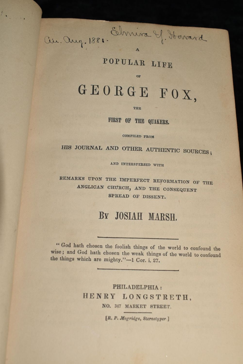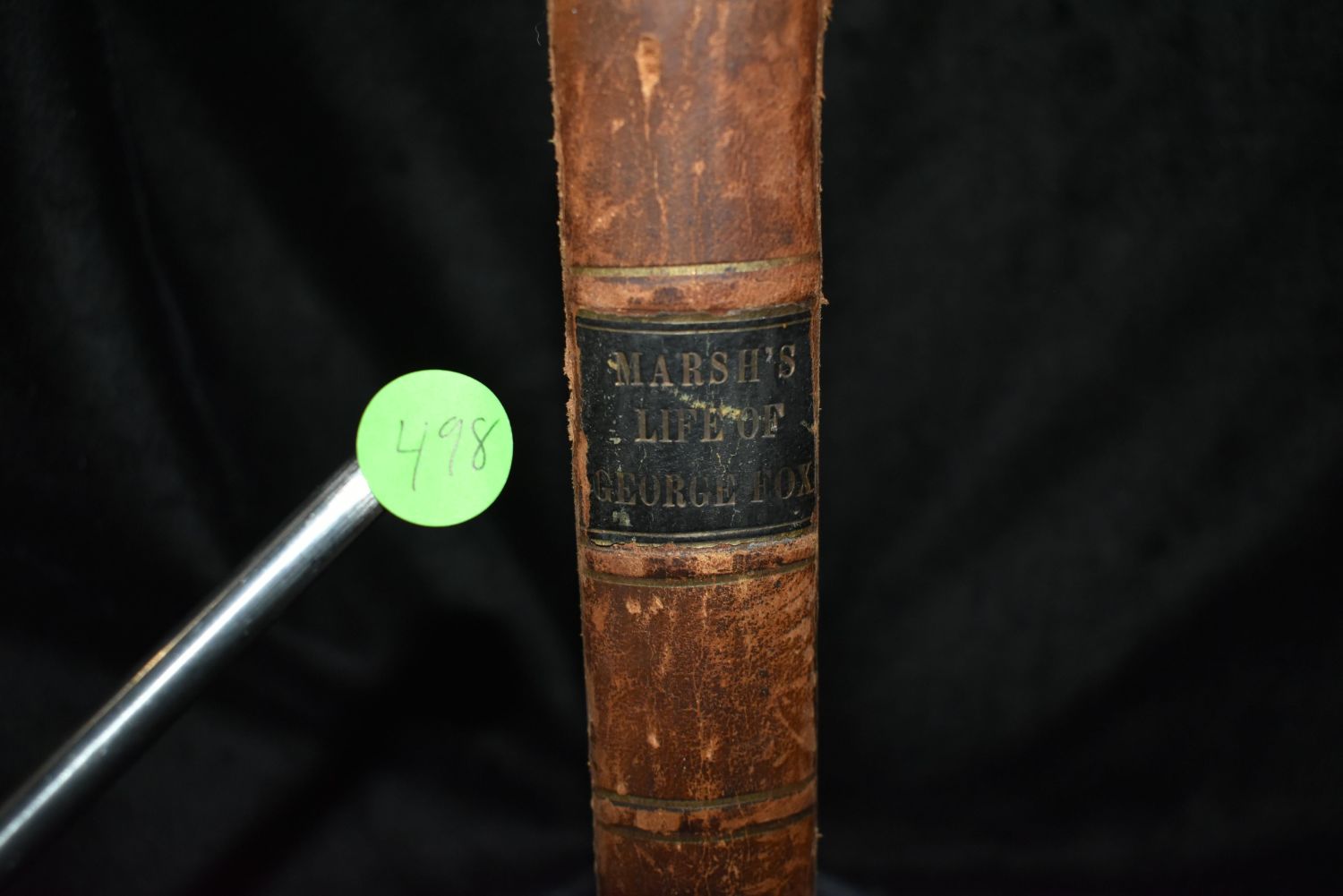A Popular Life of George Fox, The First of the Quakers, Compiled From His Journal and Other Authentic Sources by Josiah Marsh. Published by Henry Longstreth, Philadelphia 1840’s. 1st Edition. Date isn’t with the publishers info thus pre 1847 publication and 1st edition. Publishers original hardback in full leather with gold gilt to the board edges and with name plate. Overall good condition. Has a fair amount of shelf wear to the corners and cover. Foxing to first and last couple pages and inner cover. 446 pgs 8" by 5 1/8"