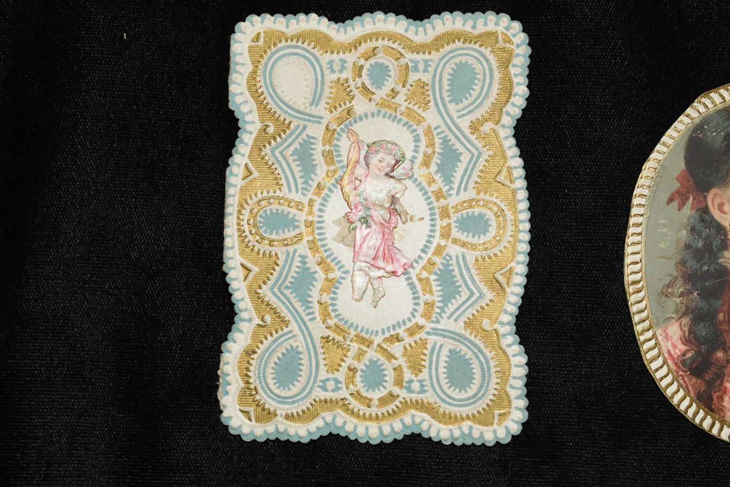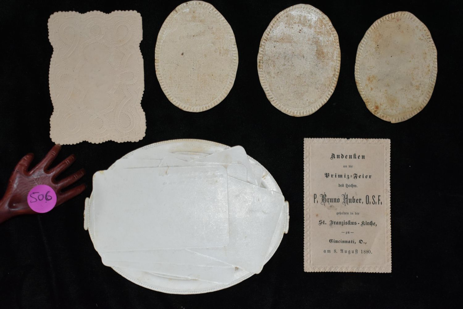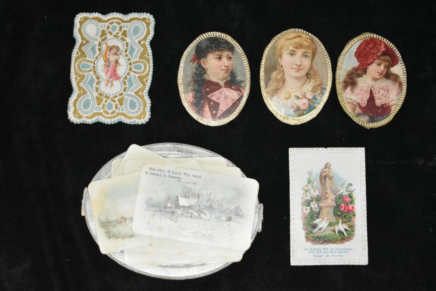 1889 Lithograph representing a stack of cards that reads "For ever, O Lord, Thy Word in Settled Heavens, Statue with doves in German 1880 from Cincinnati, Ohio, 3 oval lithographs of women, and the fifth is a ultilayer production with an Angel on the front. The last 4 are likely 1880’s give or take a few years. Largest one is 5 3/8" by 4"