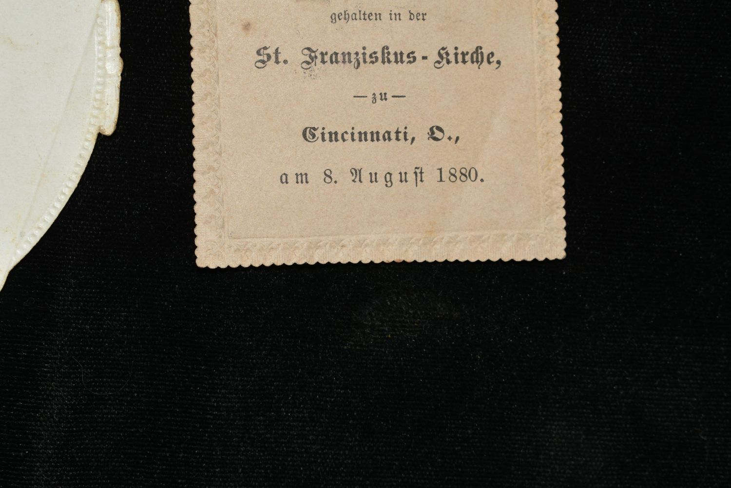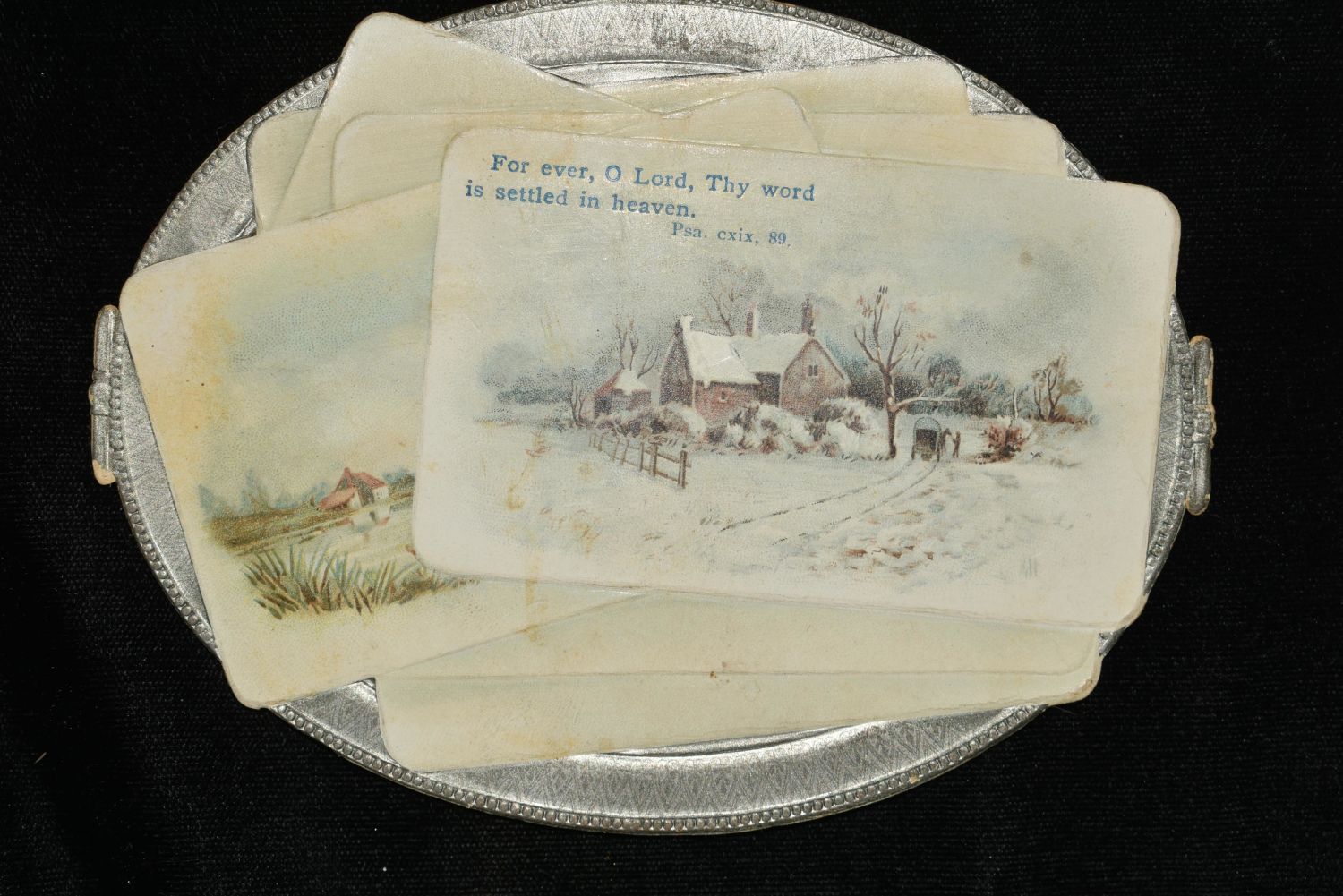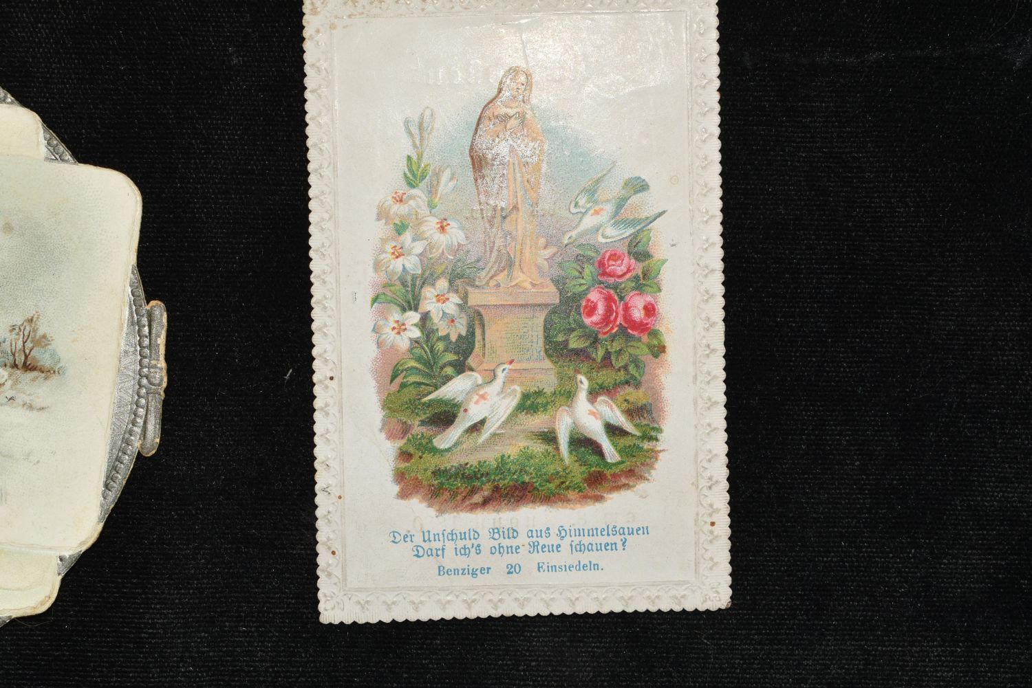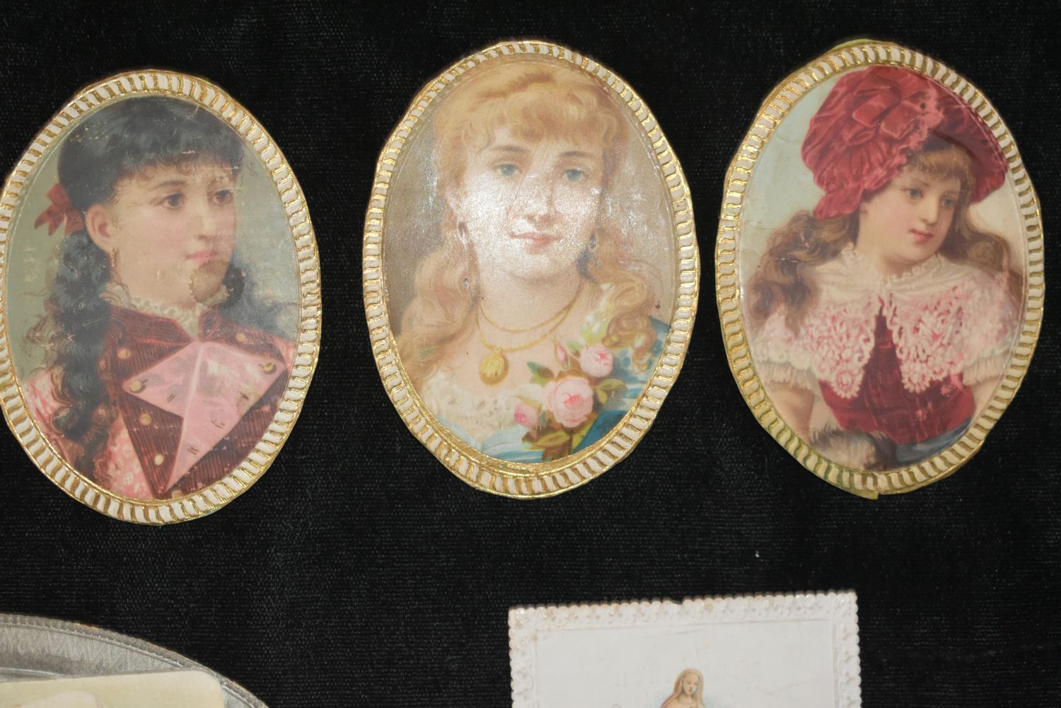 1889 Lithograph representing a stack of cards that reads "For ever, O Lord, Thy Word in Settled Heavens, Statue with doves in German 1880 from Cincinnati, Ohio, 3 oval lithographs of women, and the fifth is a ultilayer production with an Angel on the front. The last 4 are likely 1880’s give or take a few years. Largest one is 5 3/8" by 4"