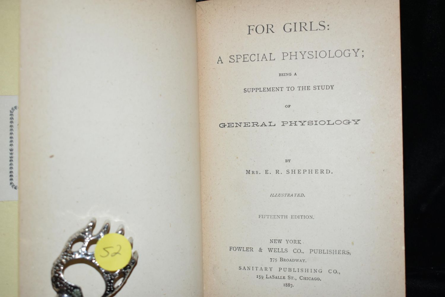 FOR GIRLS; A SPECIAL PHYSIOLOGY 1887 by Mrs. E. R, Shepherd. New York: Fowler & Wells Co., Publishers 1887. Publishers Original Brown Cloth with Black embossing and gold gilt. Good Condition with some shelf wear. 225 pgs 7 1/2" by 5"