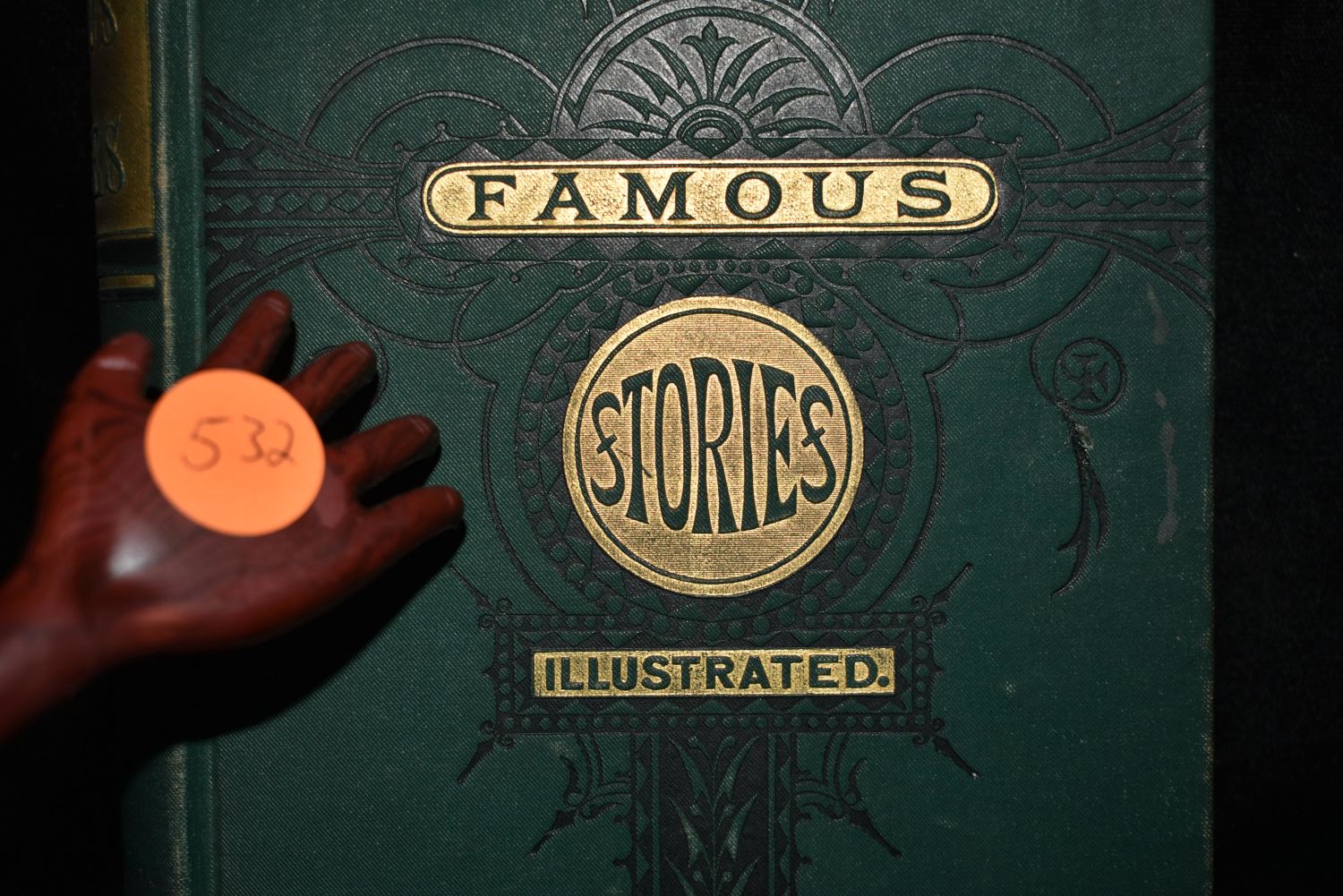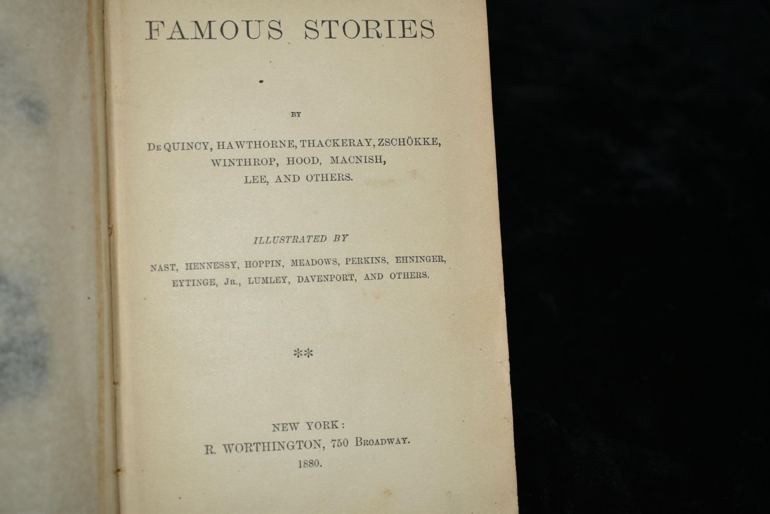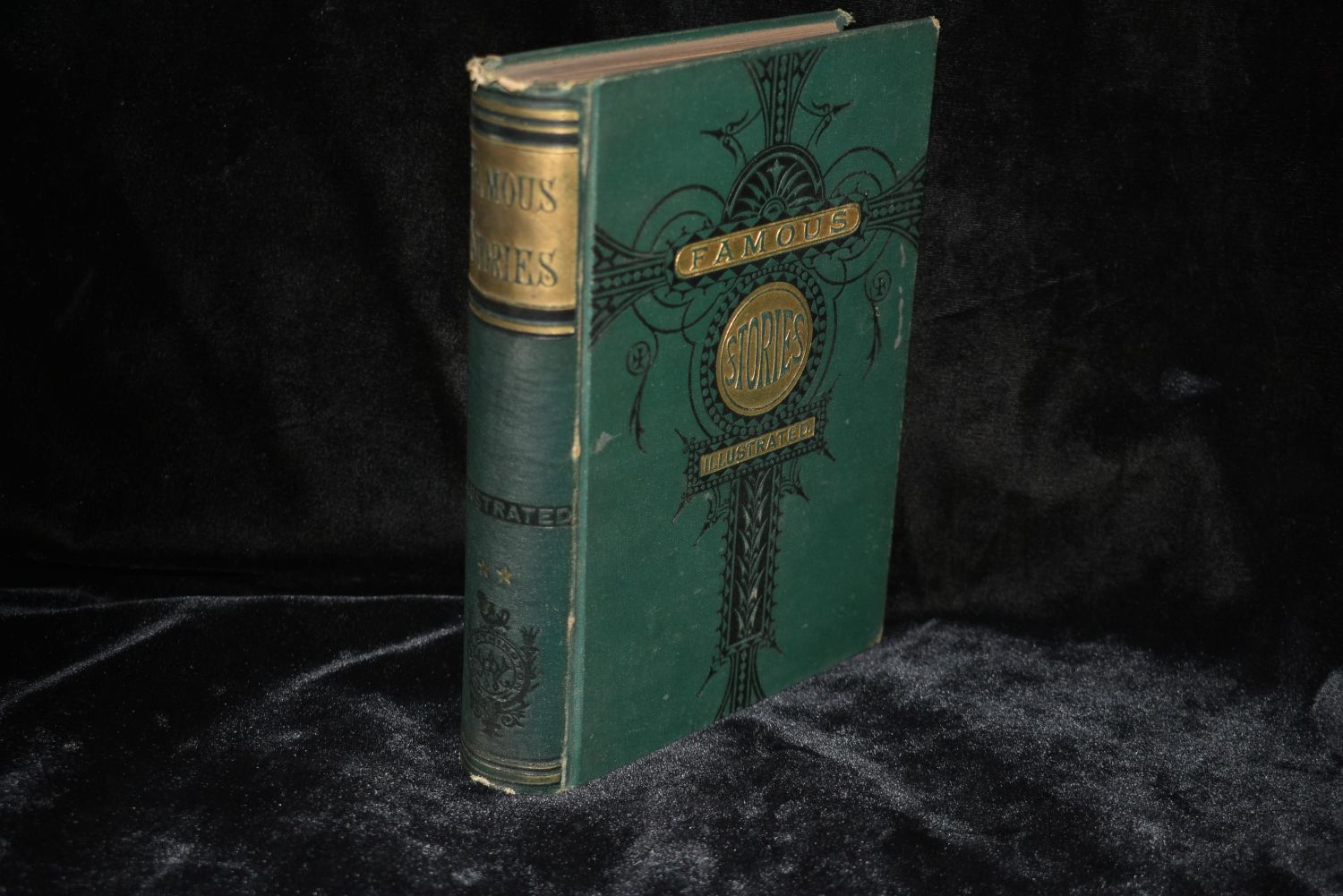 Famous Stories by De Quincy, Hawethorne, Thackeray, Zschokke, Winthrop, Hood, Macnish, Lee and Others. Published by New York: R. Worthington 1880. Original Publishers Green Cloth Hardback with gold and black embossed print/gilt. Good Condition. Has some shelf wear to cover and very minor foxing/age spots. 432 pgs 7 1/2" by 5 1/2".