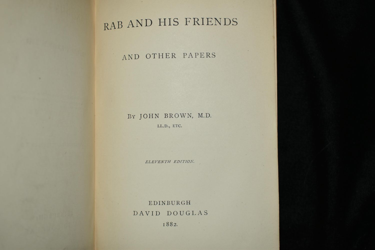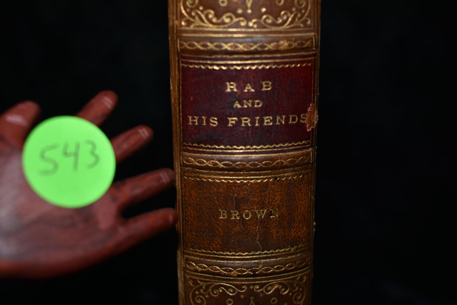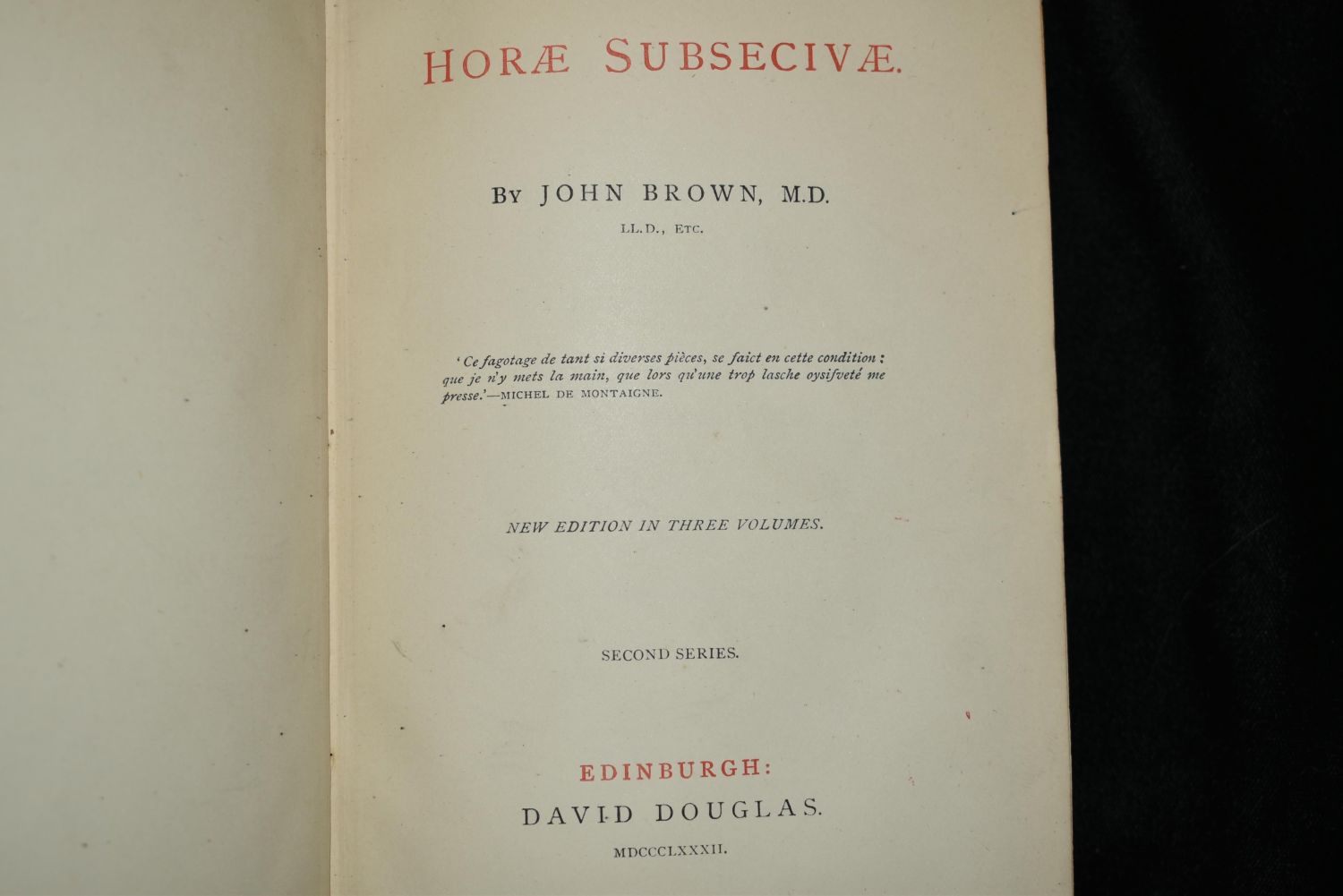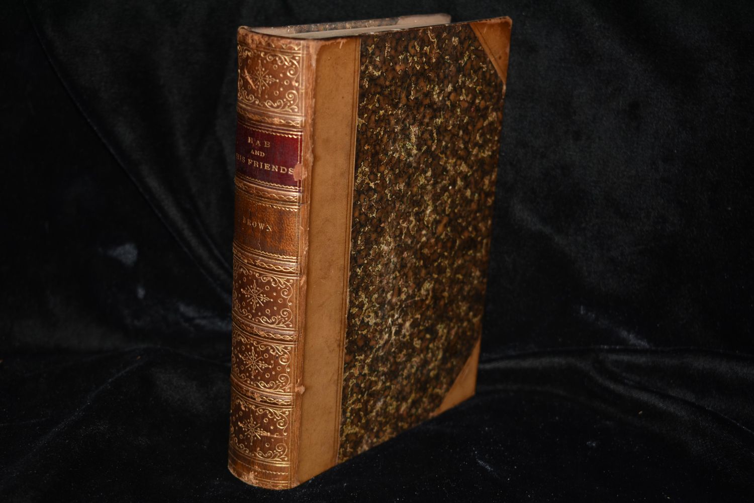 Horae Subsecivae: Rab and His Friends, and Other Papers by John Brown. Published by David Douglas, Edinburgh 1882. Half Leather with marbled boards and gold gilt. Good condition with some shelf wear to corners and spine. 486 pgs 7 1/4 by 5 1/4" 1 of a 3 volume set. Didnt catch that before the listing. One of the other 3 volumes is lot 143.