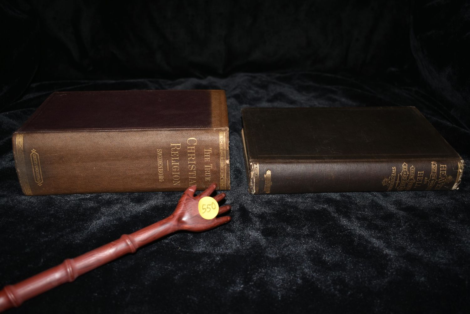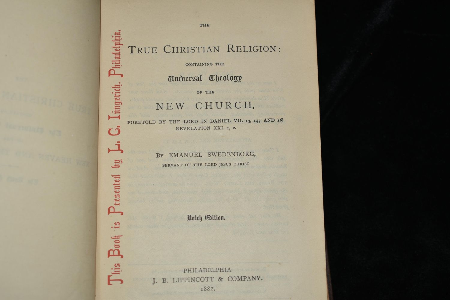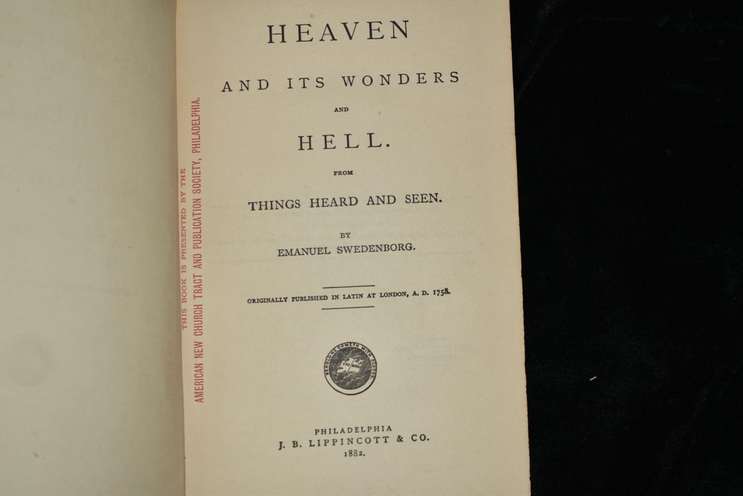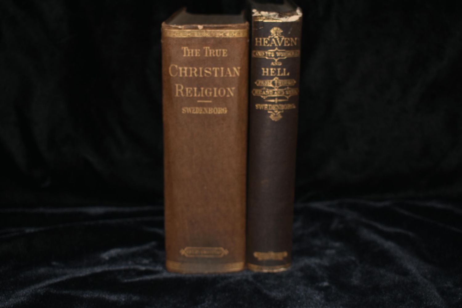 2 Books by Emanuel Swedenborg: Heaven and its Wonders and Hell from Things Seen and Heard 1882 and True Christian Religion: Containing the Universal Theology of the New Church. 1882. Both published by J. B. Lippincott & Company, Philadelphia 1882. Both have some shelf wear otherwise in very good condition. Both are original brown publishers hardbacks with gold gilt. 453 and 1244 pgs.8" by 5 1/2"