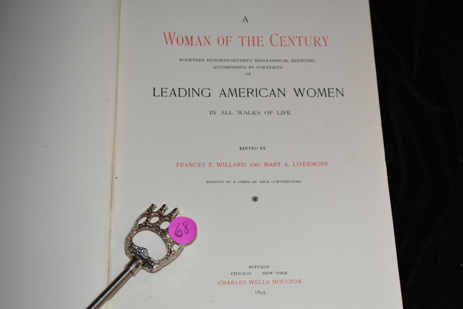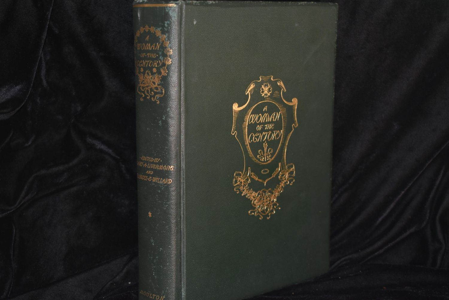 A Woman of the Century 1893 Frances Willard. A Woman of the Century: Fourteen Hundred-Seventy Biographical Sketches Accompanied by Portraits of Leading American Women in All Walks of Life. Edited by Frances Willard and Mary Livermore. Published by Charles Wells Moulton 1893. 1st Edition. Publishers Large Hardback Green Cloth with decorative gold gilt on the cover and spine. Gold gilt to all page edges. Excellent condition for its age. Famous women’s pictures and their stories throughout. 812 pgs 11 by 8 1/8"