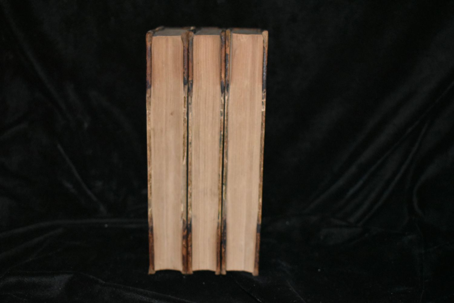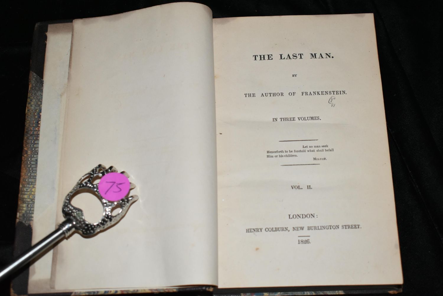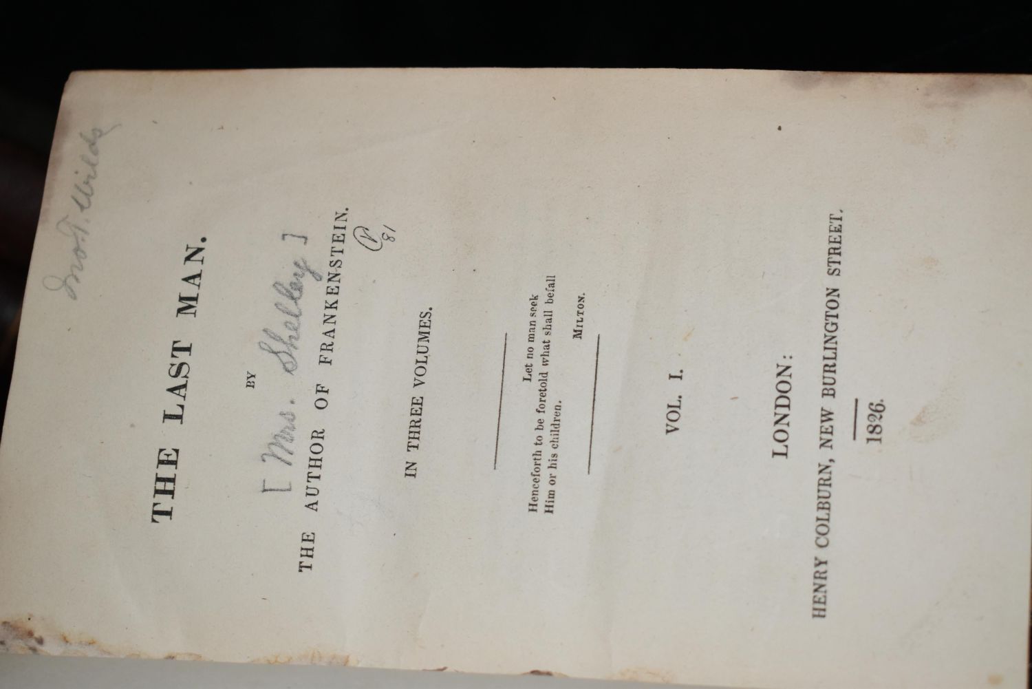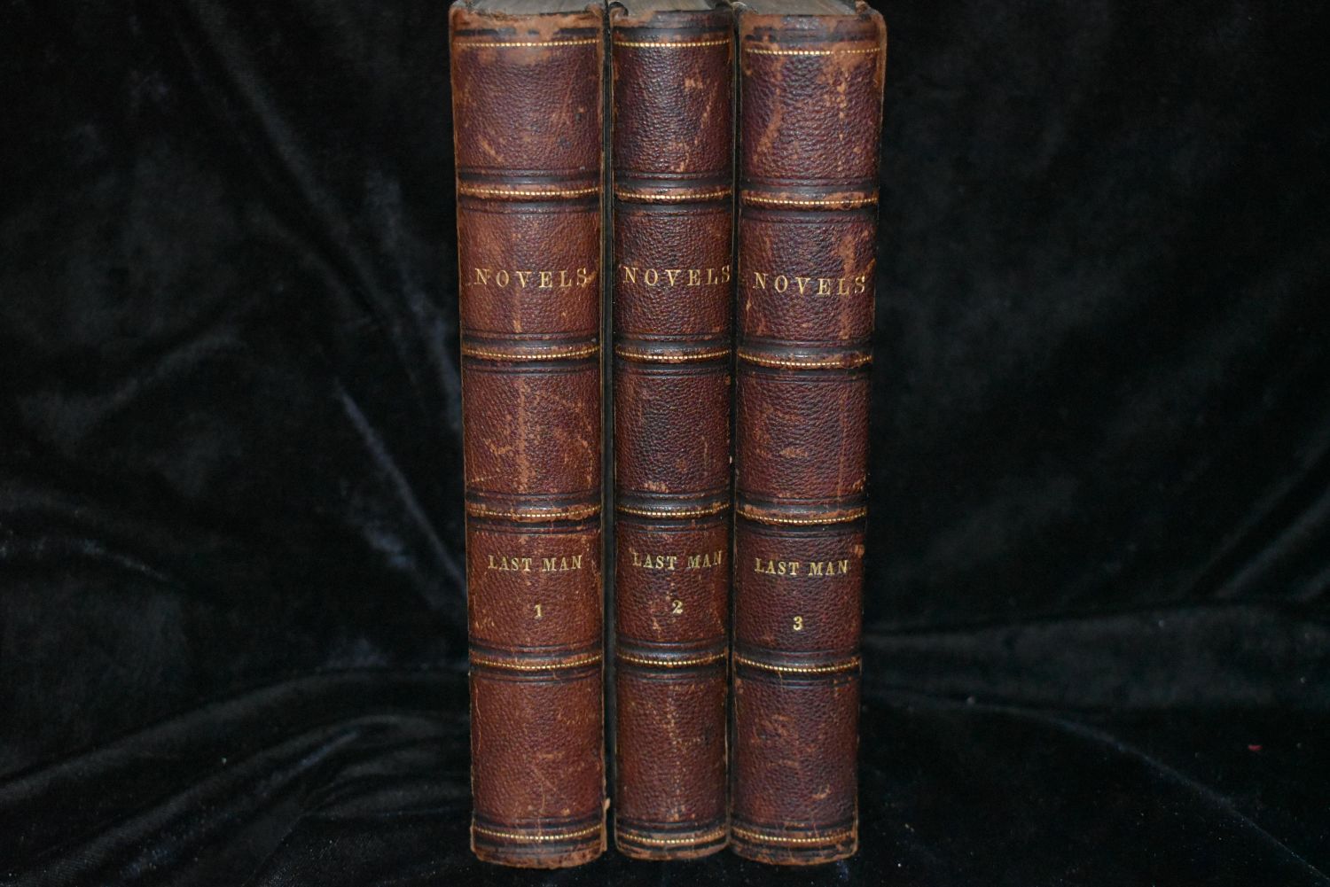 THE LAST MAN by Mary Shelley 1826. London: Henry Coulbourn, New Burlington Street 1826. 1st Edition. Mary Shelley’s great apocalyptic novel, set at the end of the 21st century among the last survivors of a global pandemic. Very Good Condition for their Age. Publishers ORIGINAL Half Leather with colored boards. Shelf wear to boards and corners and spine. Volume 1 has started to separate at the top of the spine. Bindings are tight. Pages are mostly fine with very little foxing or faults. Adds are still perfectly intact in the back of volume 1. Volume one has author’s name written in. Not sure if she was the one that did that or not. 1st owners signature in volume 1 on title page in pencil. Overall they are very good. 358pgs (and adds) + 328 pgs + 352 pages. 7 3/8" by 5"