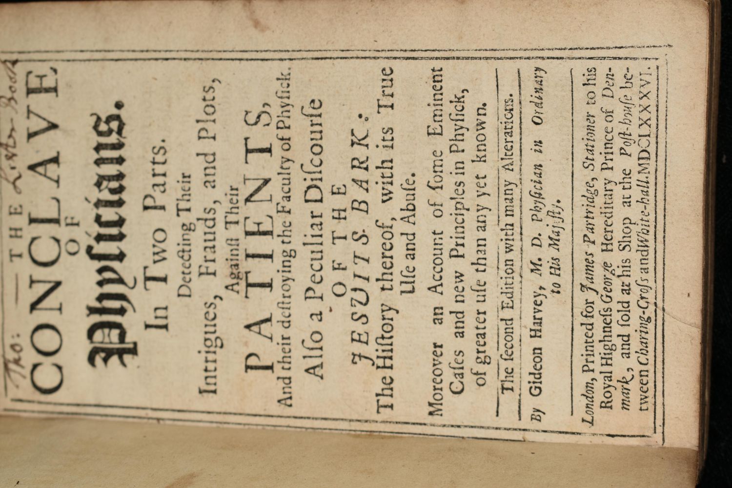 The Conclave of Physicians 1686 Gideon Harvey. The Conclave of Physicians. In Two Parts Detecting Their Intrigues, Frauds, and Plots, Against Their Patients, And their destroying the Faculty of Physick by Gideon Harvey 1686. Full Leather. The Cover is shot. Both boards are separated from the book. Pages are all there and its still bound. Overall rough condition but it could be given a new cover. 5 7/8" by 3 1/2"
