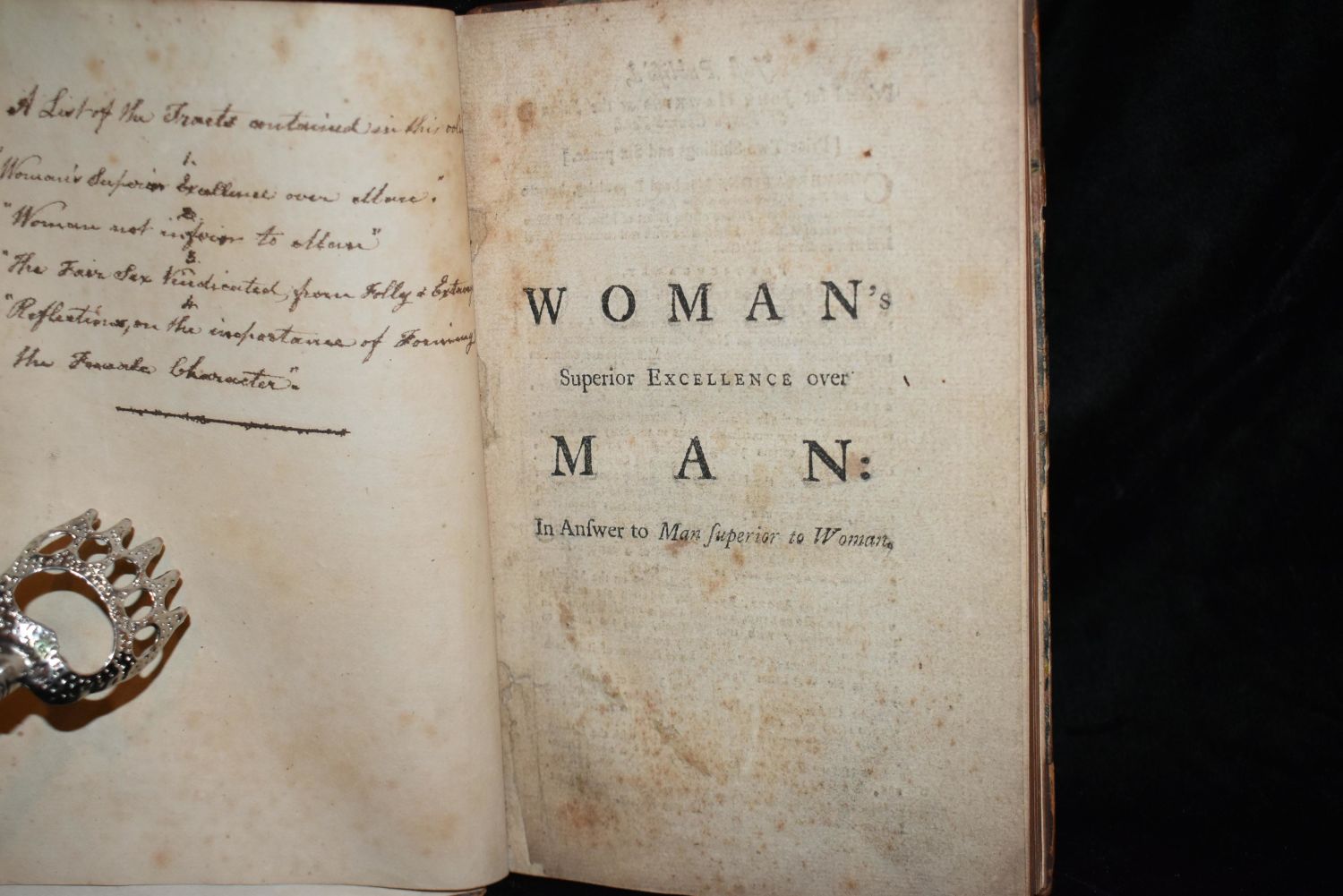 1740 WOMAN’s SUPERIOR EXCELLENCE OVER MAN: IN ANSWER TO MAN SUPERIOR TO WOMAN London : printed for John Hawkins, 1740. Presumed first Edition. For a Nearly 300 year old book its in pretty good shape. Half Leather with Floral Pattern (I think its floral). It is a VERY RARE book. There is a little foxing on some pages but overall the internal part of the book is very good. The Cover Still is still admirable however the front cover is partially loose and will need a bit of TLC. 8" by 5 1/4"