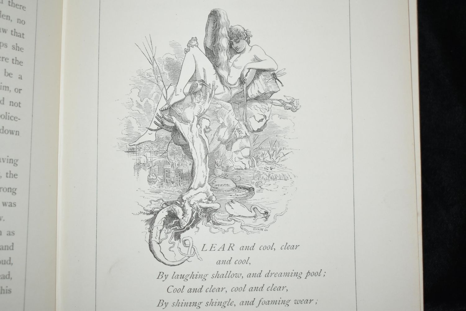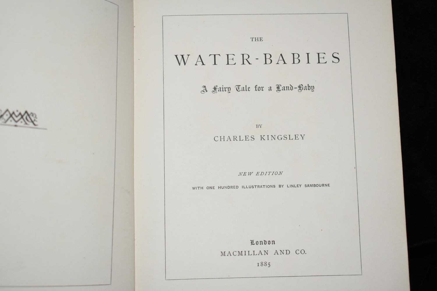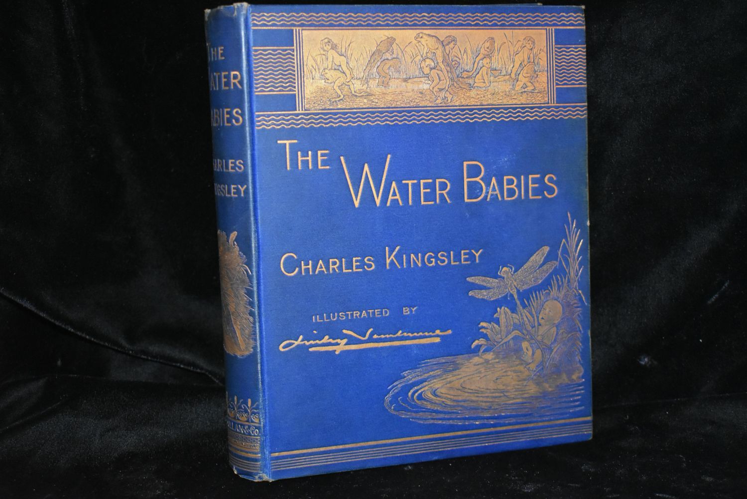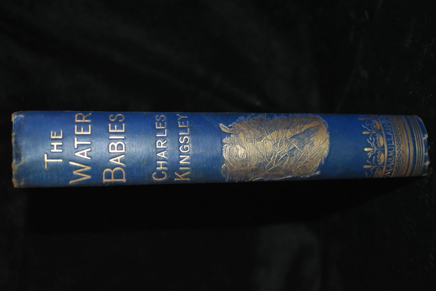 The Water Babies by Charles Kingsley 1885. The Water-Babies A fairy-tale for a land-baby Charles Kingsley Published by Macmillan, London (1885). Hardback in full blue cloth and gilt decoration to the spine and cover. Pages are gold gilt all around edges. Very Good Condition. Some Shelf wear and a little staining on the back cover. 371 pgs 8 1/2" by 7"