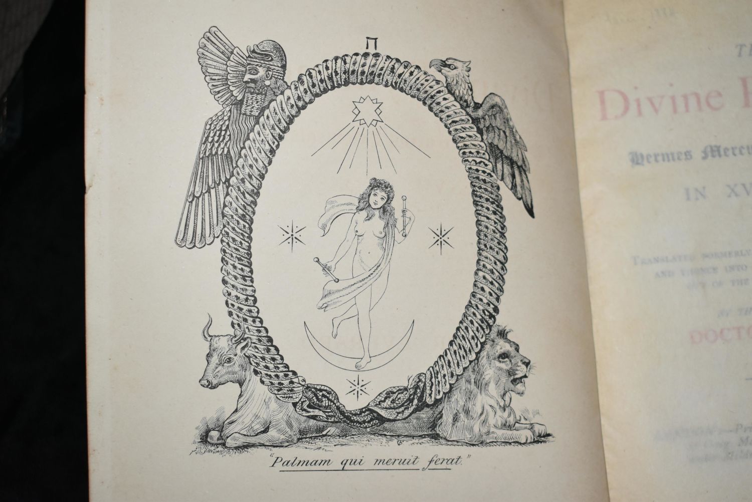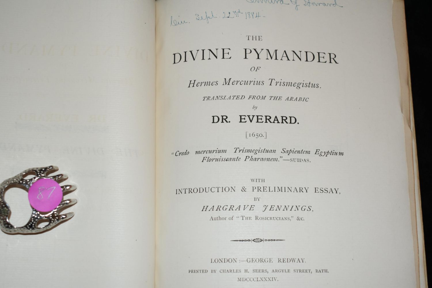 The Divine Pymander 1884 Dr. Evarard, 1 of 200 copies printed. London: George Redway Publisher. The Divine Pymander of Hermes Mercurious Trismegistus Translated by Dr. Everard in 1650. This was a 200 book printing of the 1650 version in 1884. Publishers white cloth with red and black. Very Good Condition for its age. 112 pgs 8 7/8" by 7"