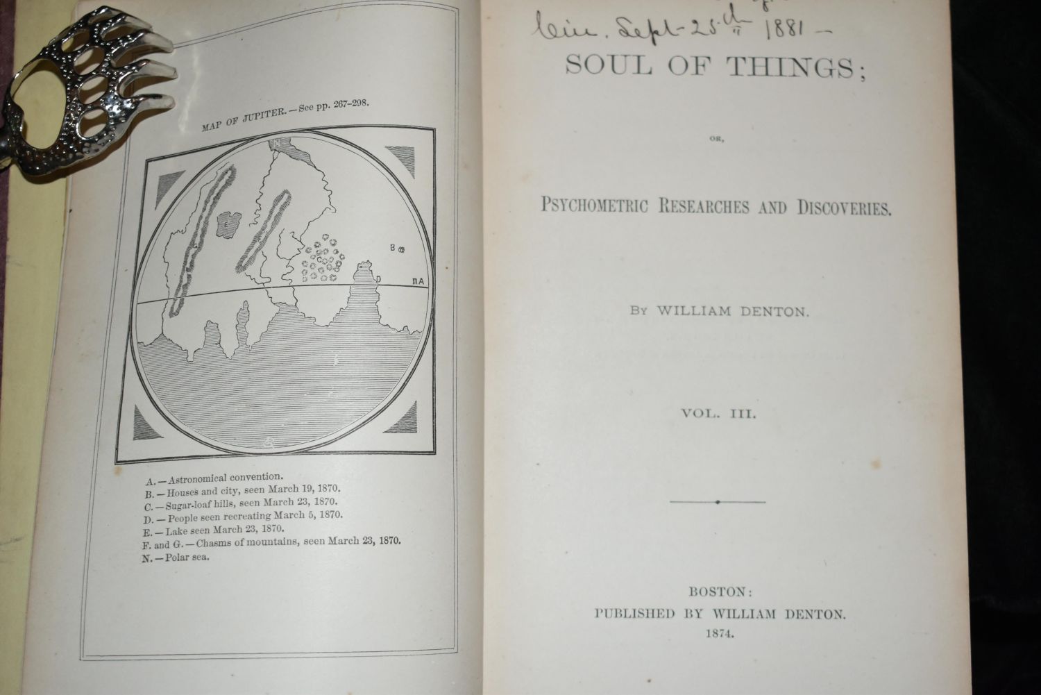 The Soul of Things 1st Ed. 1863. The Soul of Things Or, Psychometric Researches and Discoveries by Denton, William and Elizabeth M. F. Published by Walker, Wise and Company (1863). "The Soul of Things or Psychometric" is an 1866 work by William and Elizabeth M. F. Denton on the subject of Psychometrics, which refers a field of study that deals with the purported ability to learn about someone or something simply by touching inanimate objects related to them. Many Illustrations. Original publishers brown cloth. Good condition for their age. Covers are faded with some shelf wear. 7 5/8" by 5"
