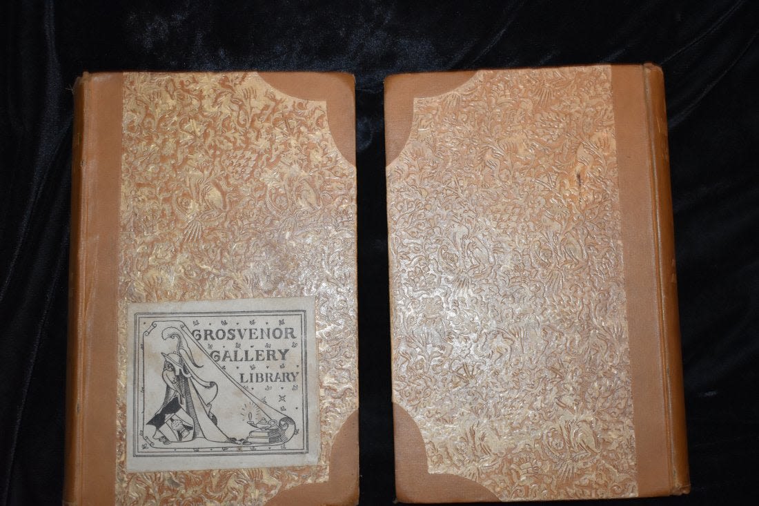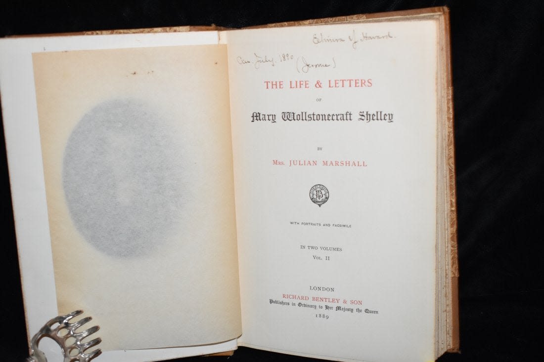 The Life and Letters if Mary Wollstonecraft Shelley by Julian Marshal. Published in London by Richard Bentley & Son 1889. 1st Edition. Volumes 1 and 2. Publishers original hardback in decorative yellow cloth with gold gilt to the spine. Covers are a bit worn but both books are still intact. Both have the Grosvenor Gallery Library Sticker on their front covers. Some foxing with first owners name written on the title pages. Overall Good condition for their age. 325 pgs and 369 pgs. 9" by 6"