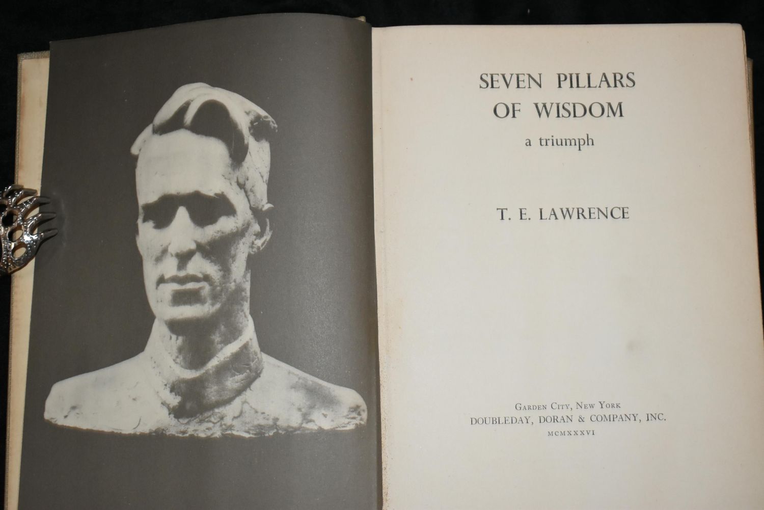Seven Pillars of Wisdom by T. E. Lawrence 1st Ed. Published by Doubleday, Doran and Company 1935. 1st Public Edition. It was privately printed in 1926 with only 750 copies. Publishers hardback white cloth with gold. Good Condition with some fading to the cover. 672 pgs 8" by 10 1/4"