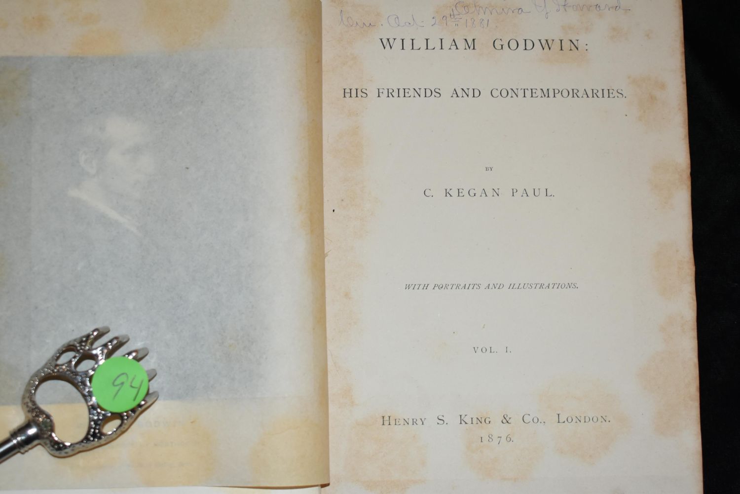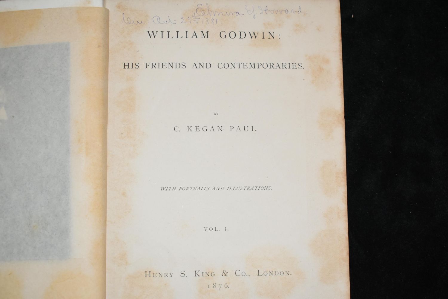 WILLIAM GODWIN by C. Kegan Paul 1876. London: Henry S. King & Co. 1876. 2 Volumes. Paul writes about the life of William Godwin and his friends such as Mary Wolfstonecraft, Charles Lamb etc . Original Publishers Hardback in Black Cloth with Gilt. Both are in very good condition for their age. Some Foxing mainly on the first few pages of each book. 387 and 340 pgs. 8 1/8" by 6"