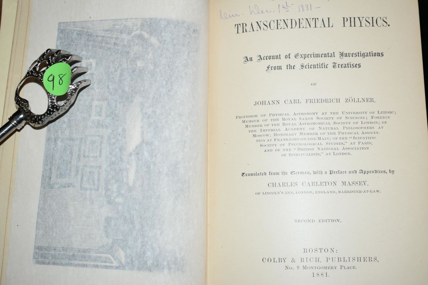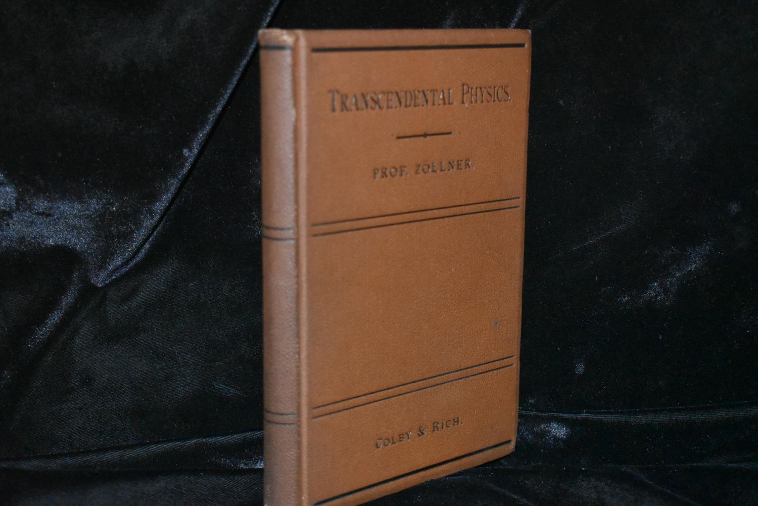 Transcendental Physics 1881 of Carl Friedrich Zollner. Boston: Colby and Rich. An Account of experimental investigations from the scientific treatises. Hardback in very good condition. 217 pgs 7 5/6 by 5 3/8"