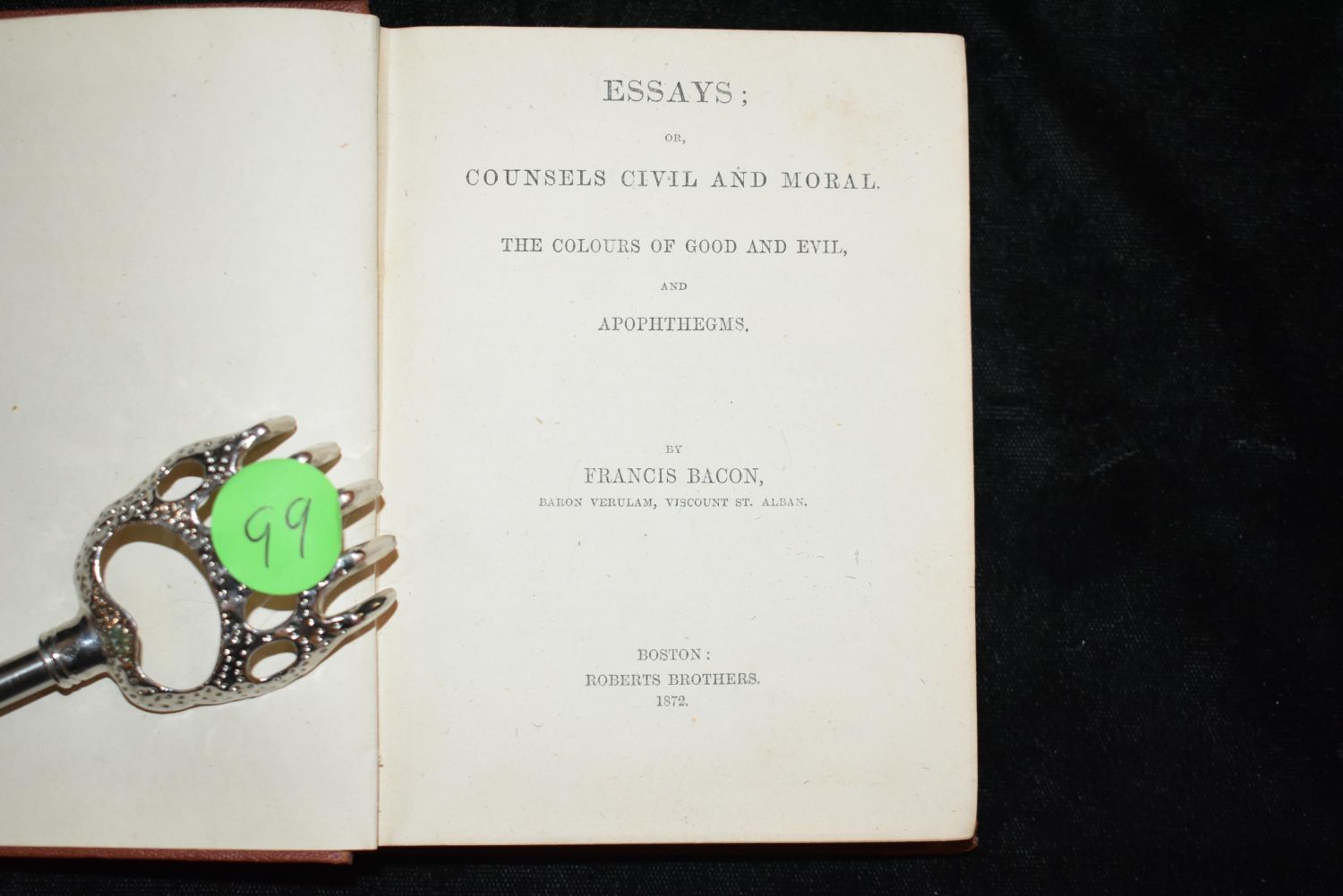 ESSAYS AND APOTHEGHMS by Francis Bacon 1872. Boston: Roberts Brothers 1872. Counsels Civil and Moral, The Colours of Good and Evil. Publishers Hardback original brown cloth with plack and gold gilt or print. Very Good Condition. 247 pgs 4 7/8" by 3 3/4"