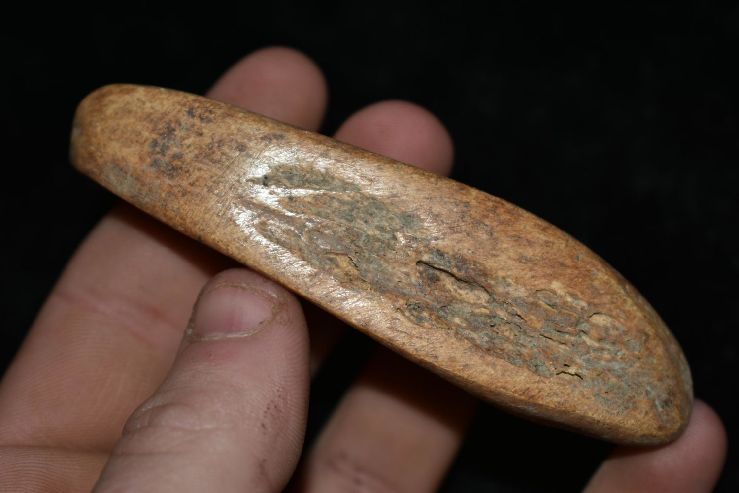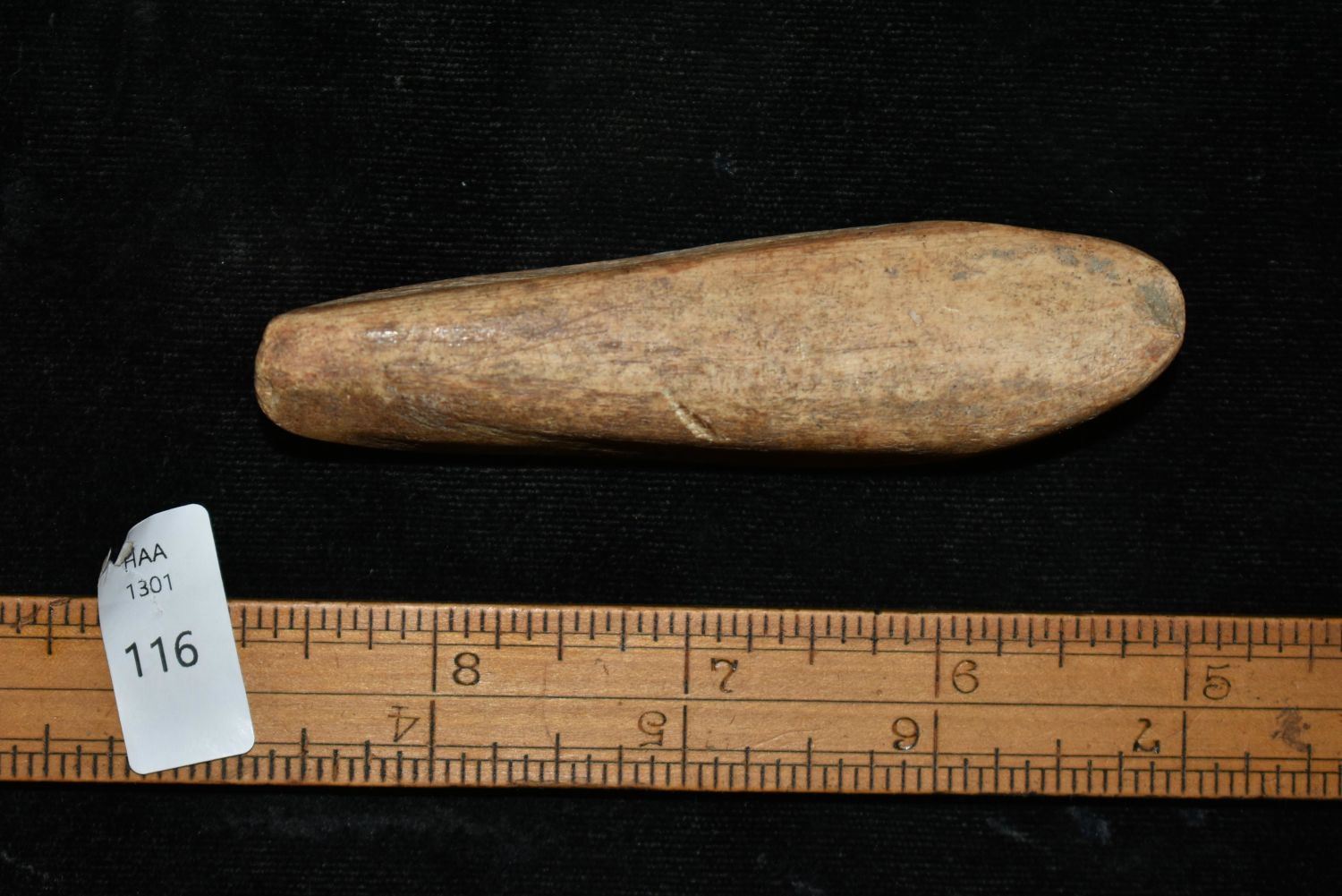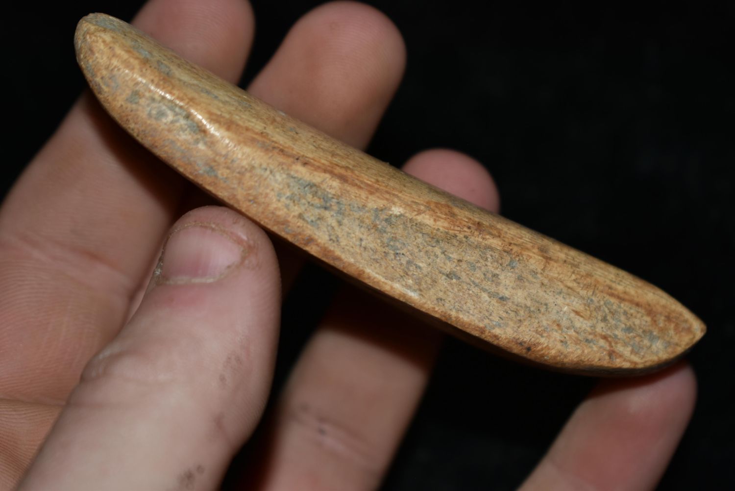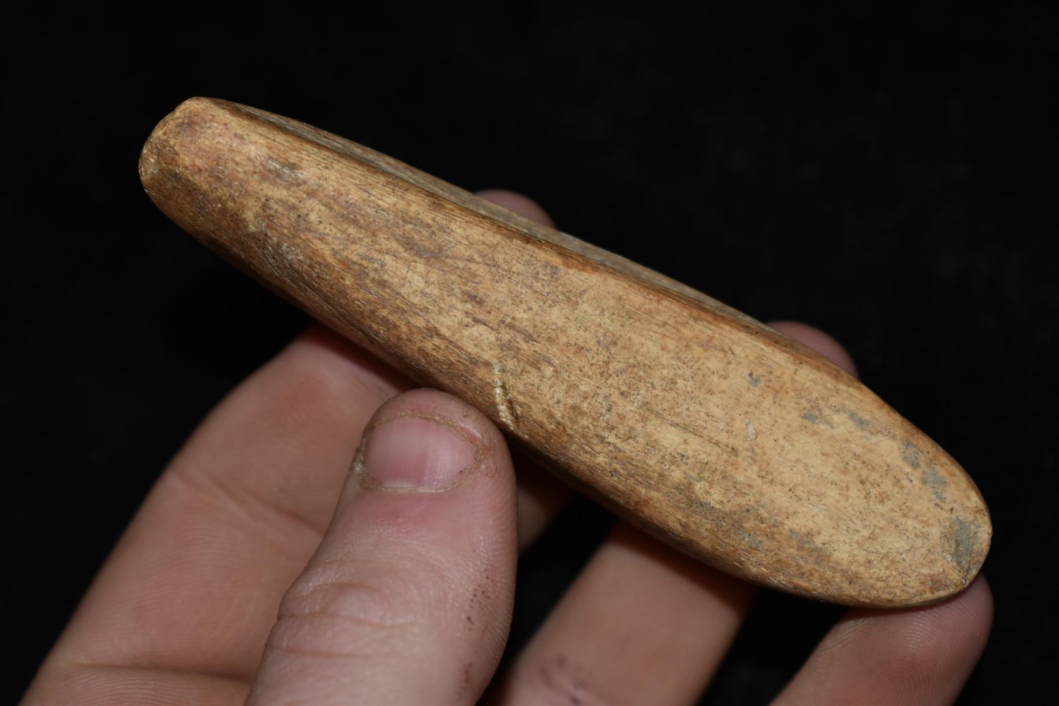3 1/2" Bone tool. With great use wear and polish. Found in Musselshell, Montana. Creel Poore was born and raised in Musselshell, Montana where he found his first arrowhead at a very early age. This led Creel on a lifetime search for Montana’s prehistoric past. Creel owned a ranch in Musselshell and collected from sites and in and around the Musselshell River and tributaries. Every piece in Creel’s collection is personally found. He did not purchase pieces, nor did he accept pieces as gifts. He took pride in the fact he found every piece. He also made the cedar frames from cedar trees that were cut on his ranch. Many of the pieces were collected from the buffalo jumps which were plentiful nearby