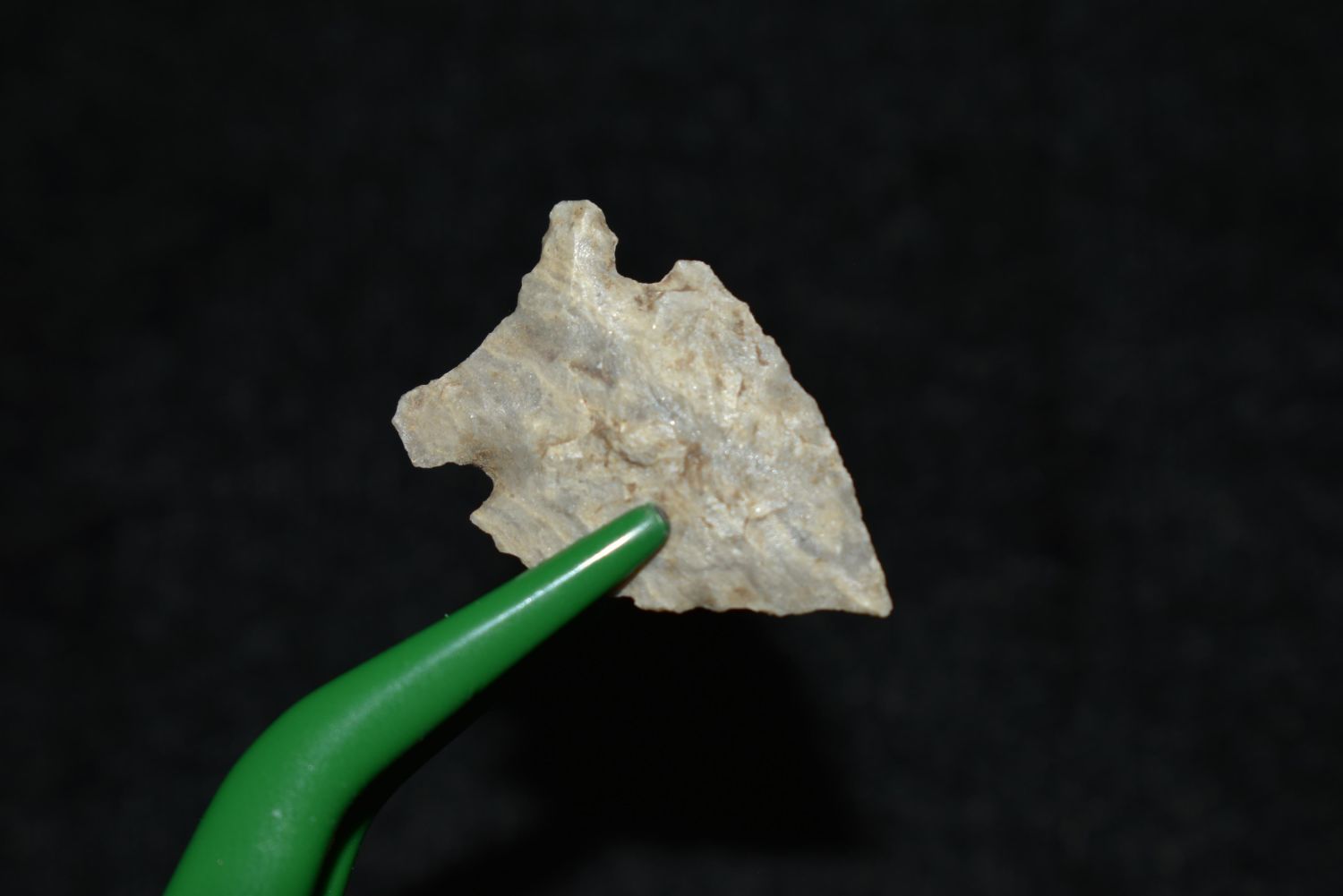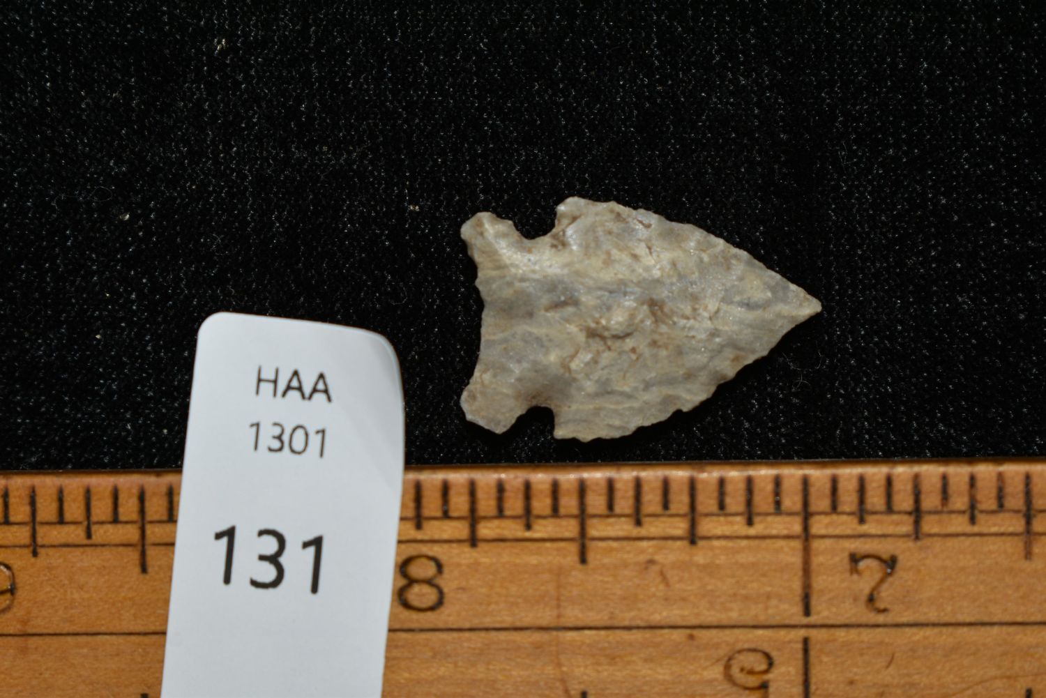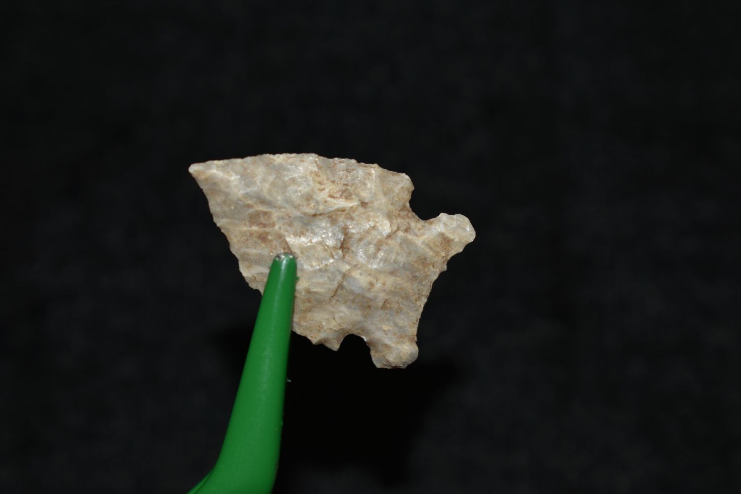 7/8" Avonlea point. Found in Musselshell, Montana. Creel Poore was born and raised in Musselshell, Montana where he found his first arrowhead at a very early age. This led Creel on a lifetime search for Montana’s prehistoric past. Creel owned a ranch in Musselshell and collected from sites and in and around the Musselshell River and tributaries. Every piece in Creel’s collection is personally found. He did not purchase pieces, nor did he accept pieces as gifts. He took pride in the fact he found every piece. He also made the cedar frames from cedar trees that were cut on his ranch. Many of the pieces were collected from the buffalo jumps which were plentiful nearby