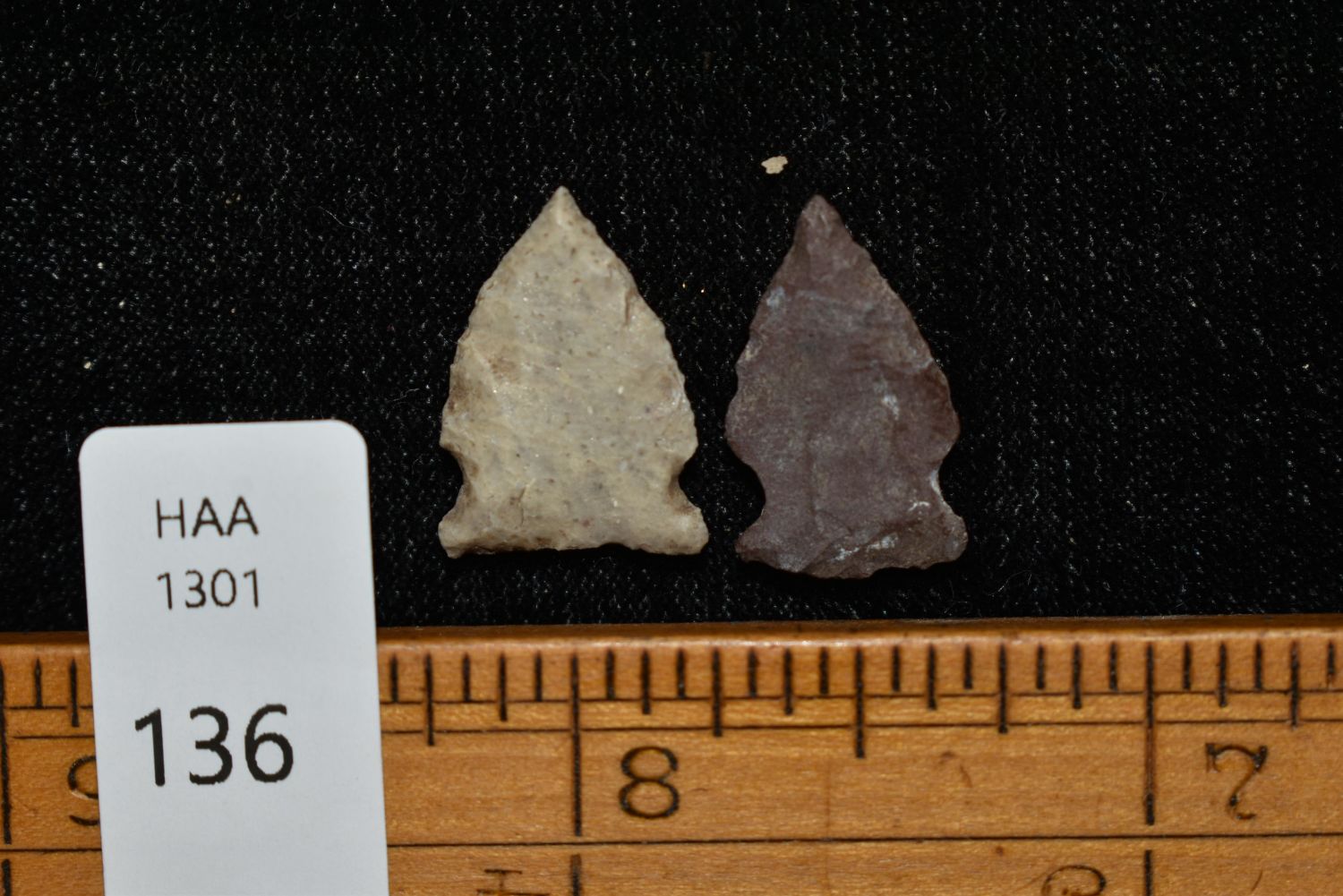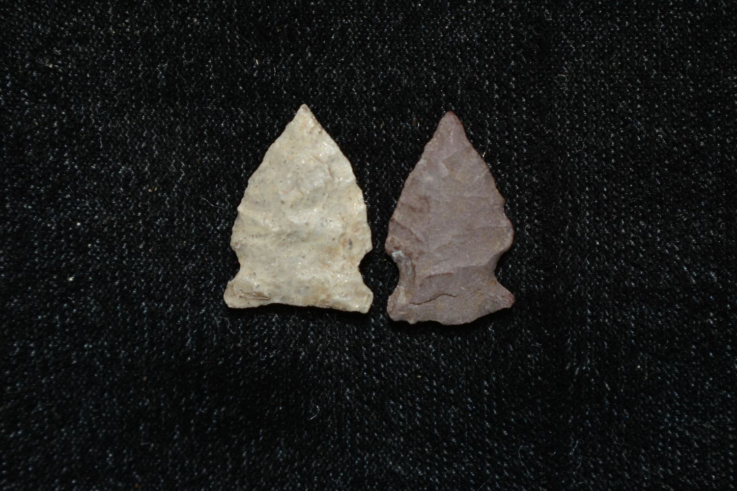 Lot of 2 Glendo arrows, largest is 5/8". Found in Musselshell, Montana. Creel Poore was born and raised in Musselshell, Montana where he found his first arrowhead at a very early age. This led Creel on a lifetime search for Montana’s prehistoric past. Creel owned a ranch in Musselshell and collected from sites and in and around the Musselshell River and tributaries. Every piece in Creel’s collection is personally found. He did not purchase pieces, nor did he accept pieces as gifts. He took pride in the fact he found every piece. He also made the cedar frames from cedar trees that were cut on his ranch. Many of the pieces were collected from the buffalo jumps which were plentiful nearby