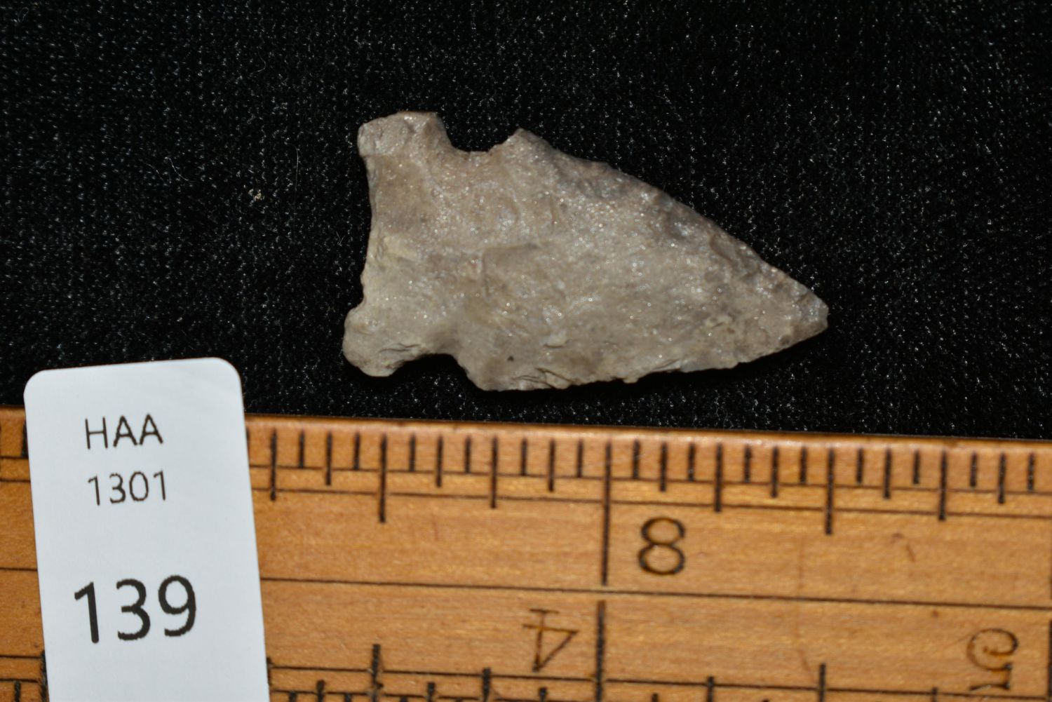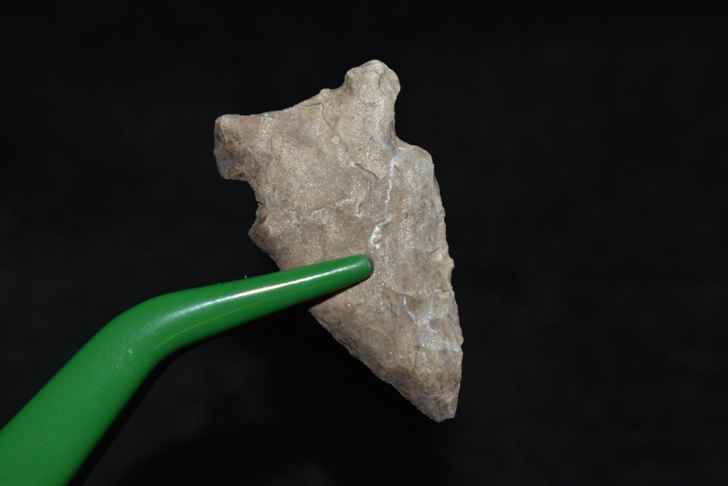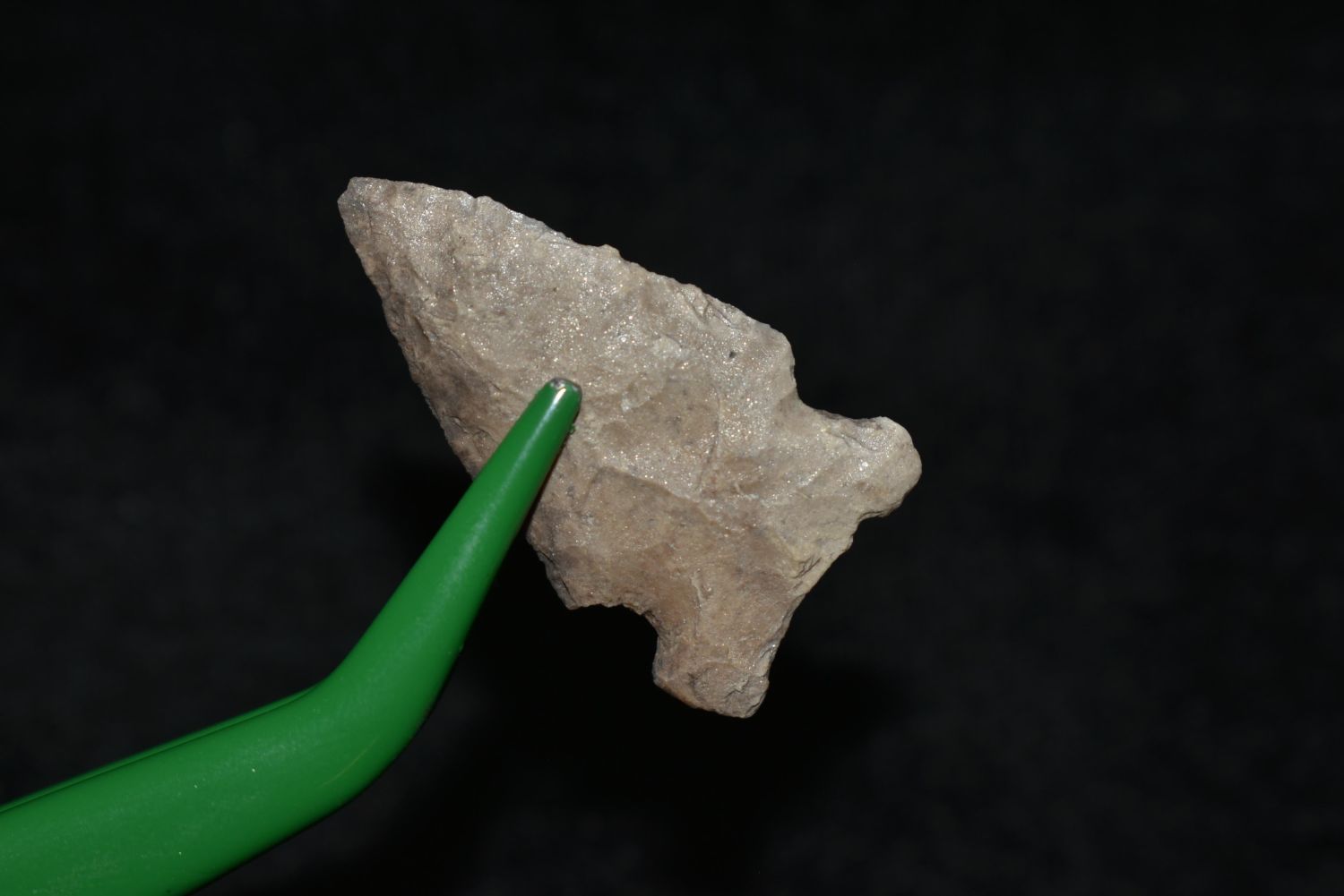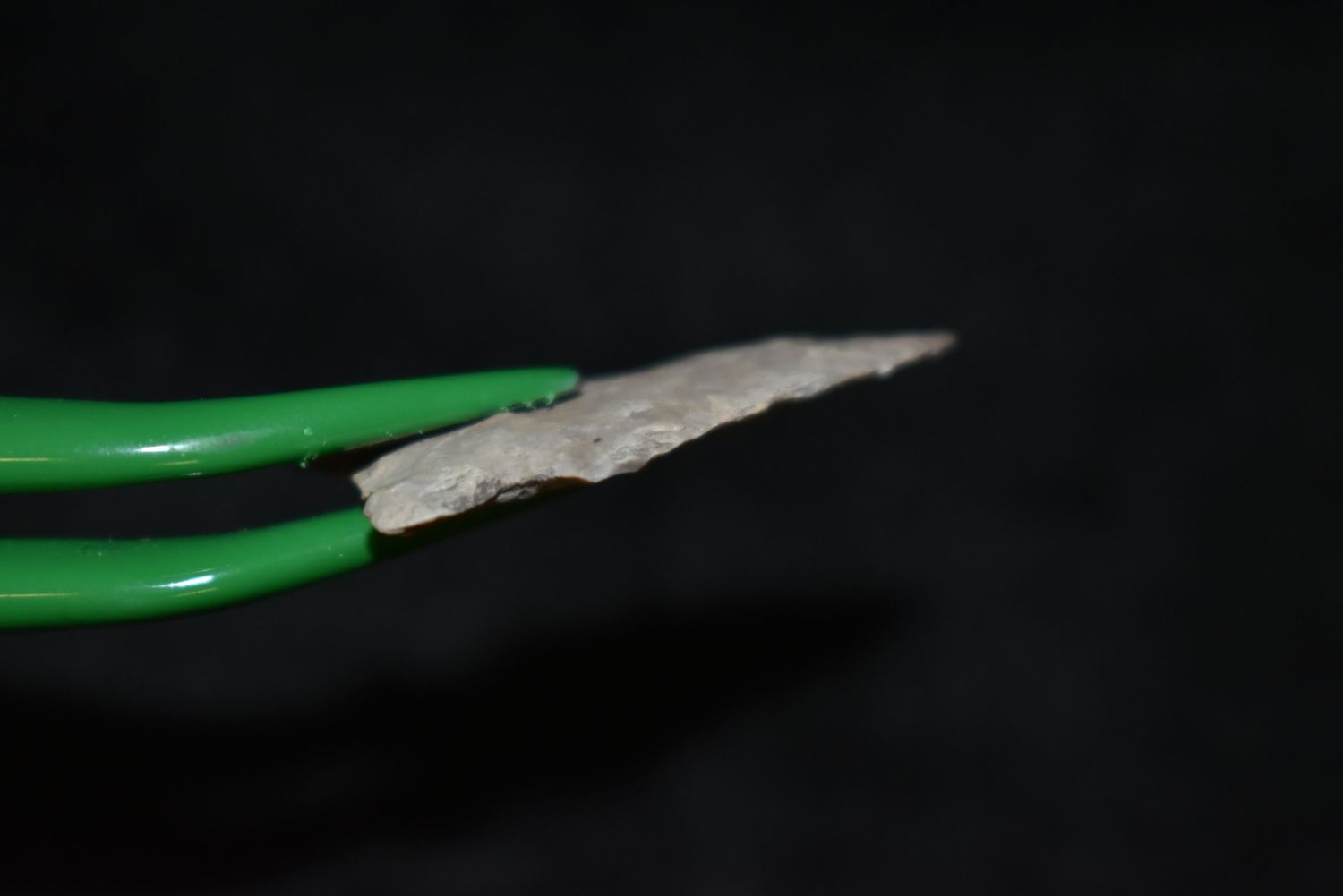 1" Avonlea point. Found in Musselshell, Montana. Creel Poore was born and raised in Musselshell, Montana where he found his first arrowhead at a very early age. This led Creel on a lifetime search for Montana’s prehistoric past. Creel owned a ranch in Musselshell and collected from sites and in and around the Musselshell River and tributaries. Every piece in Creel’s collection is personally found. He did not purchase pieces, nor did he accept pieces as gifts. He took pride in the fact he found every piece. He also made the cedar frames from cedar trees that were cut on his ranch. Many of the pieces were collected from the buffalo jumps which were plentiful nearby
