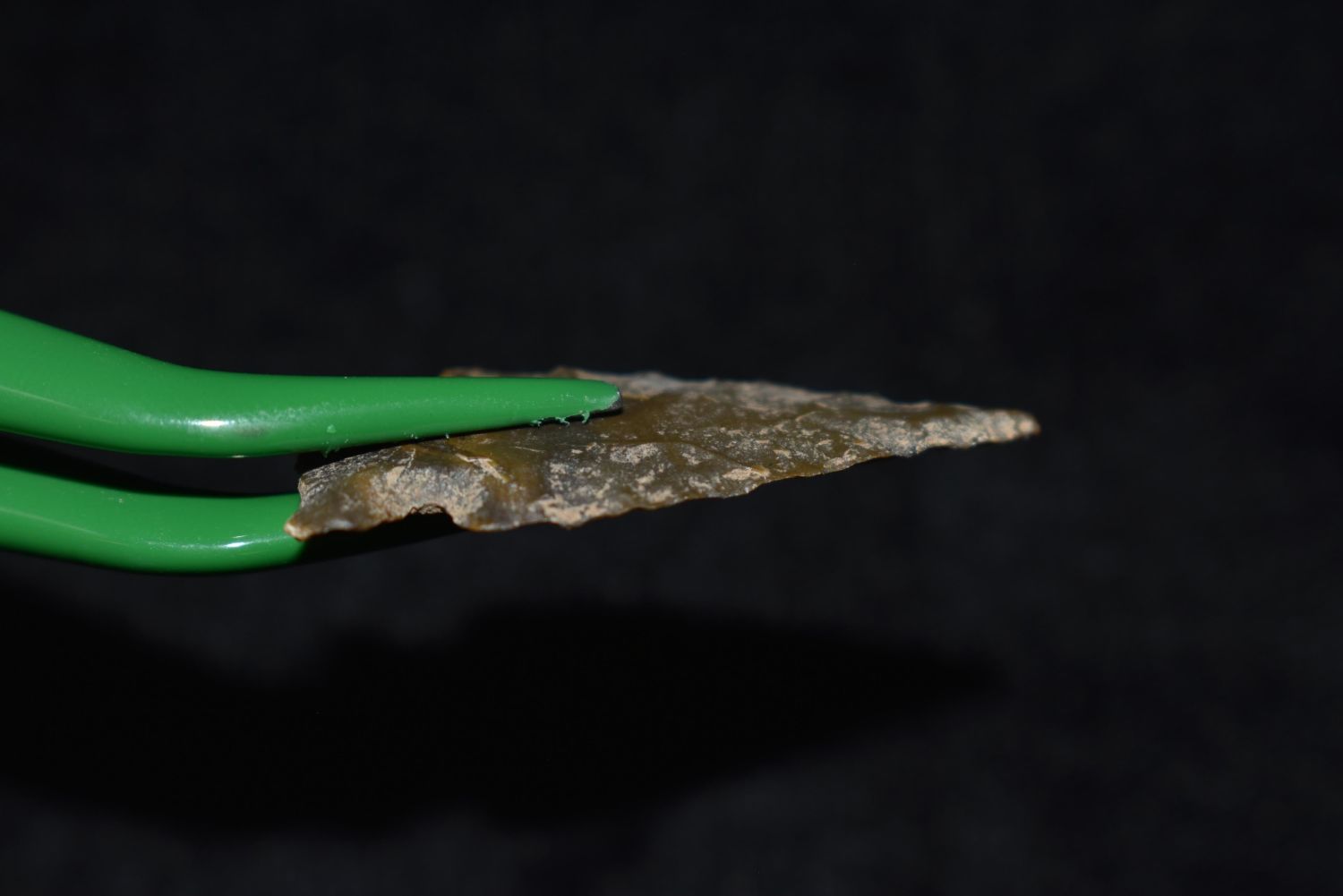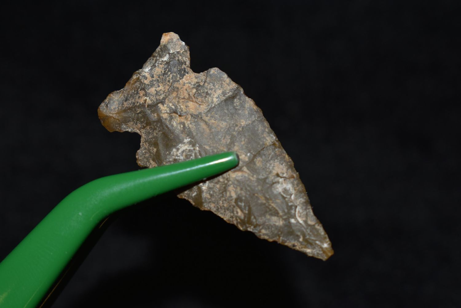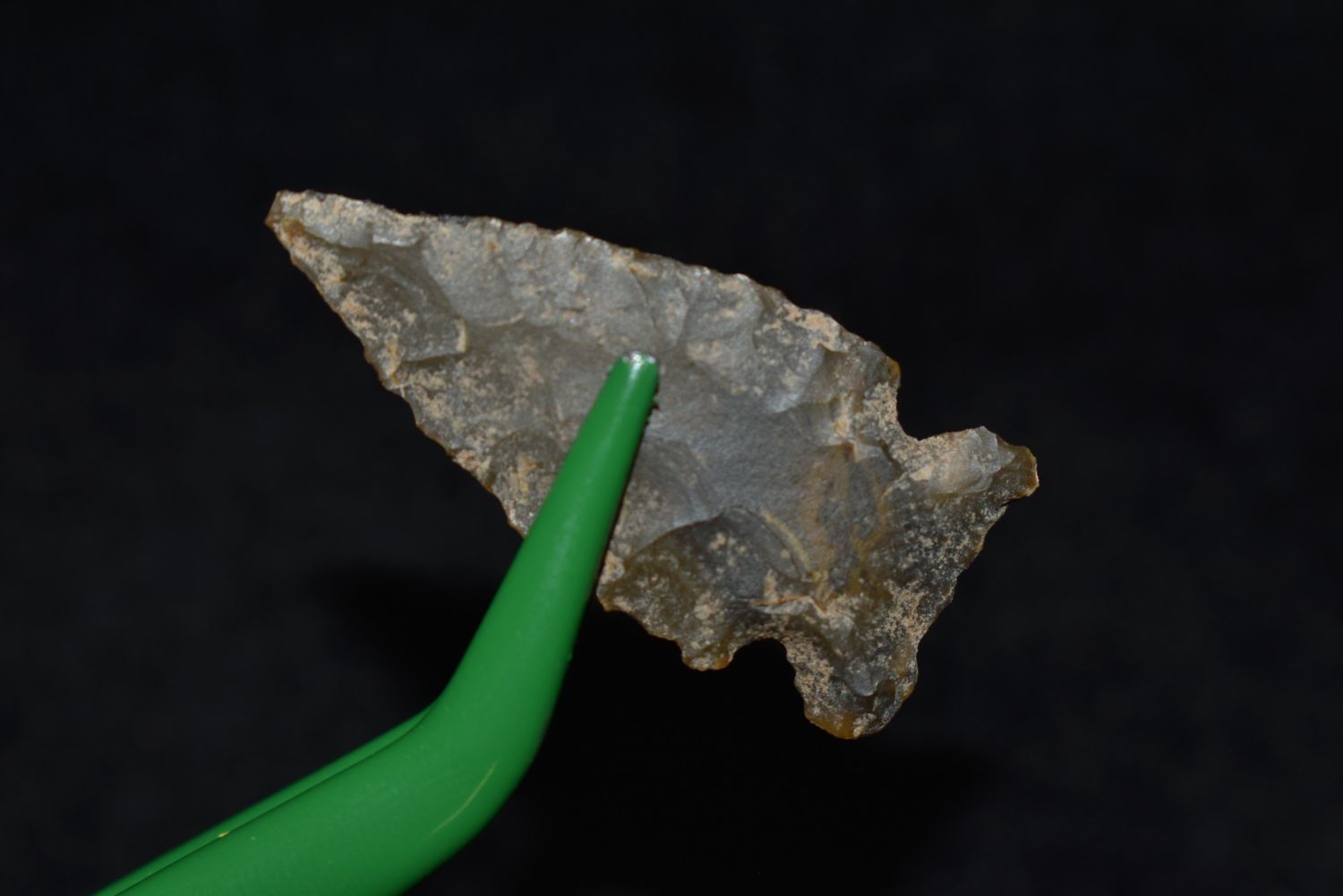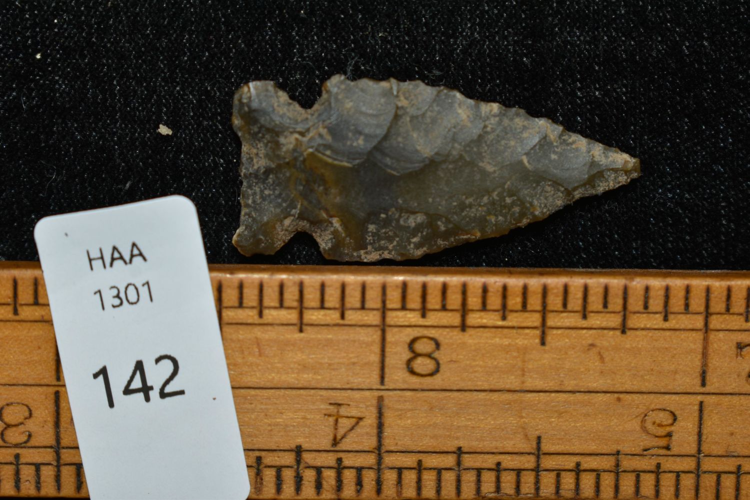 1 1/4" Avonlea point. Found in Musselshell, Montana. Creel Poore was born and raised in Musselshell, Montana where he found his first arrowhead at a very early age. This led Creel on a lifetime search for Montana’s prehistoric past. Creel owned a ranch in Musselshell and collected from sites and in and around the Musselshell River and tributaries. Every piece in Creel’s collection is personally found. He did not purchase pieces, nor did he accept pieces as gifts. He took pride in the fact he found every piece. He also made the cedar frames from cedar trees that were cut on his ranch. Many of the pieces were collected from the buffalo jumps which were plentiful nearby