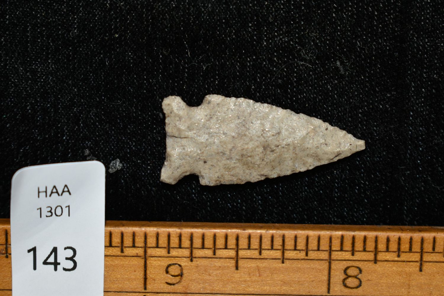 1" Avonlea point. Found in Musselshell, Montana. Creel Poore was born and raised in Musselshell, Montana where he found his first arrowhead at a very early age. This led Creel on a lifetime search for Montana’s prehistoric past. Creel owned a ranch in Musselshell and collected from sites and in and around the Musselshell River and tributaries. Every piece in Creel’s collection is personally found. He did not purchase pieces, nor did he accept pieces as gifts. He took pride in the fact he found every piece. He also made the cedar frames from cedar trees that were cut on his ranch. Many of the pieces were collected from the buffalo jumps which were plentiful nearby