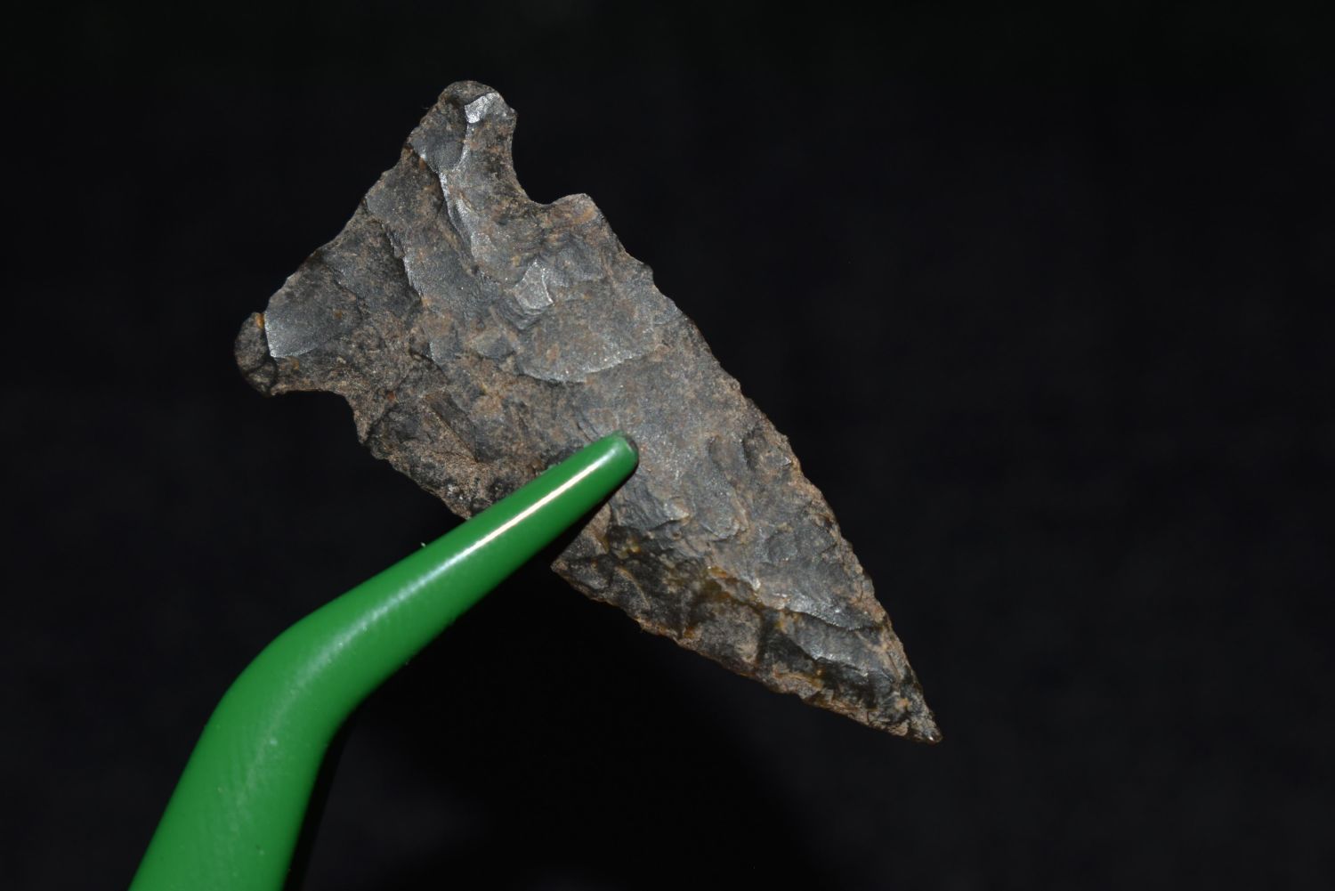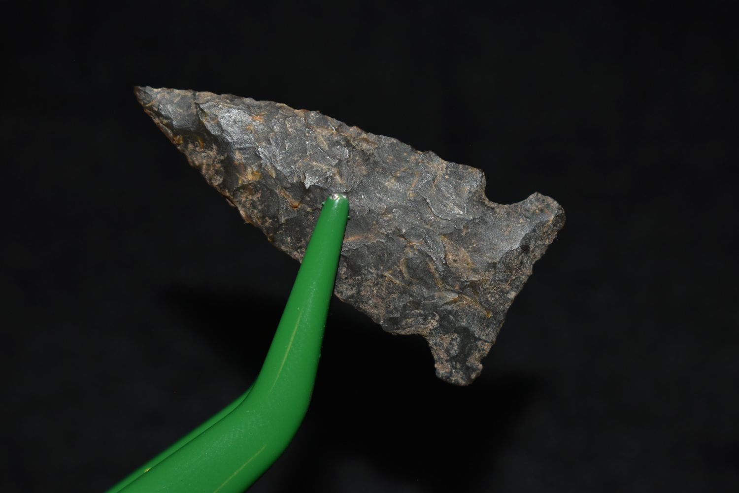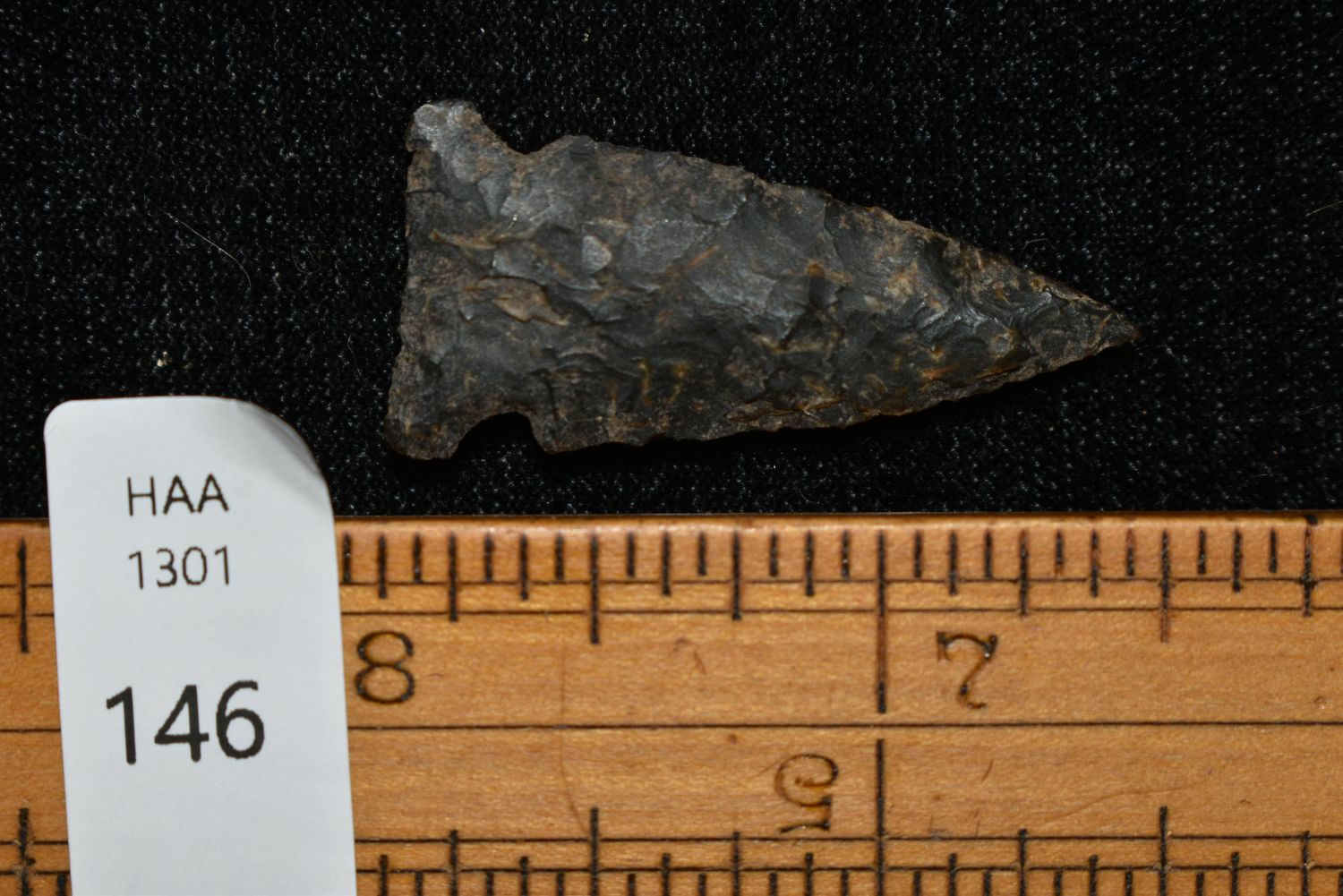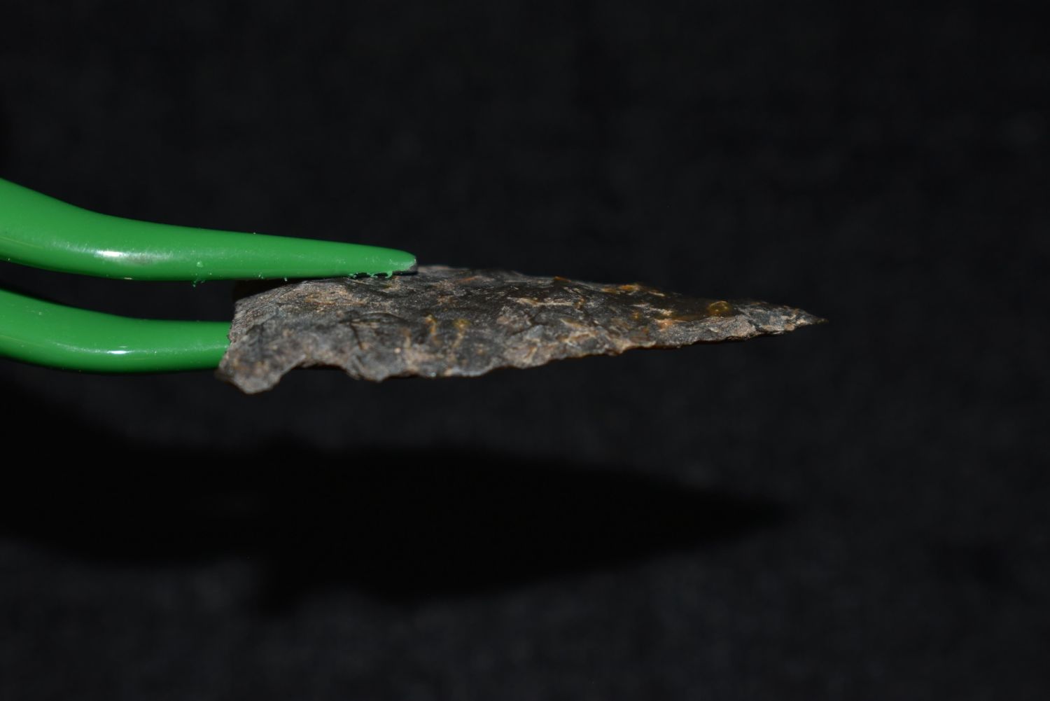 1 3/8" Avonlea point. Found in Musselshell, Montana. Creel Poore was born and raised in Musselshell, Montana where he found his first arrowhead at a very early age. This led Creel on a lifetime search for Montana’s prehistoric past. Creel owned a ranch in Musselshell and collected from sites and in and around the Musselshell River and tributaries. Every piece in Creel’s collection is personally found. He did not purchase pieces, nor did he accept pieces as gifts. He took pride in the fact he found every piece. He also made the cedar frames from cedar trees that were cut on his ranch. Many of the pieces were collected from the buffalo jumps which were plentiful nearby