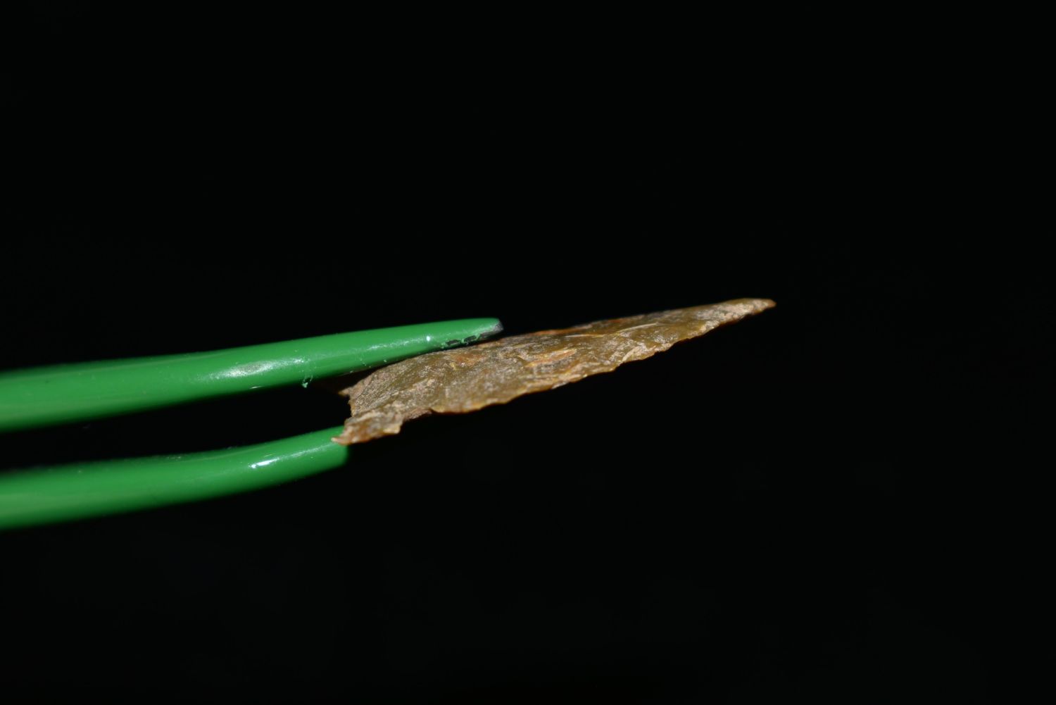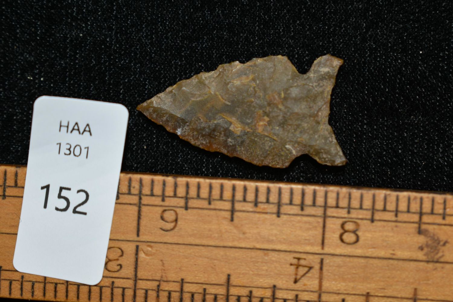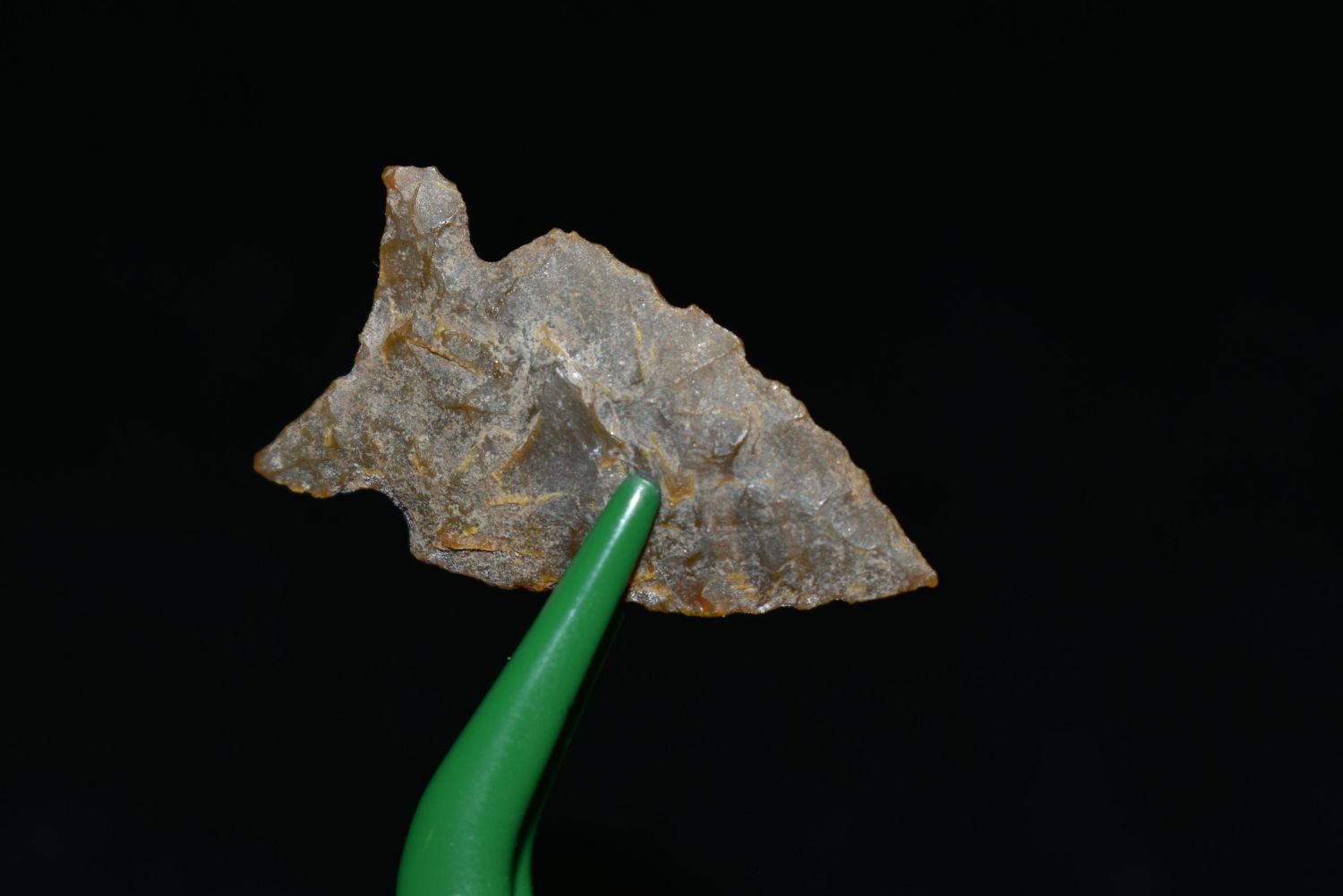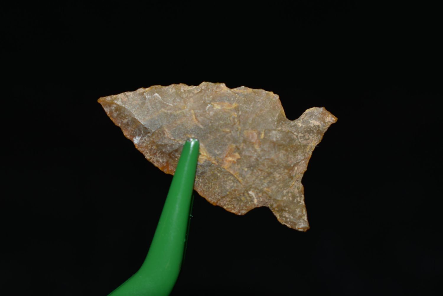 1 1/8" Long creek point. Found in Musselshell, Montana. Creel Poore was born and raised in Musselshell, Montana where he found his first arrowhead at a very early age. This led Creel on a lifetime search for Montana’s prehistoric past. Creel owned a ranch in Musselshell and collected from sites and in and around the Musselshell River and tributaries. Every piece in Creel’s collection is personally found. He did not purchase pieces, nor did he accept pieces as gifts. He took pride in the fact he found every piece. He also made the cedar frames from cedar trees that were cut on his ranch. Many of the pieces were collected from the buffalo jumps which were plentiful nearby