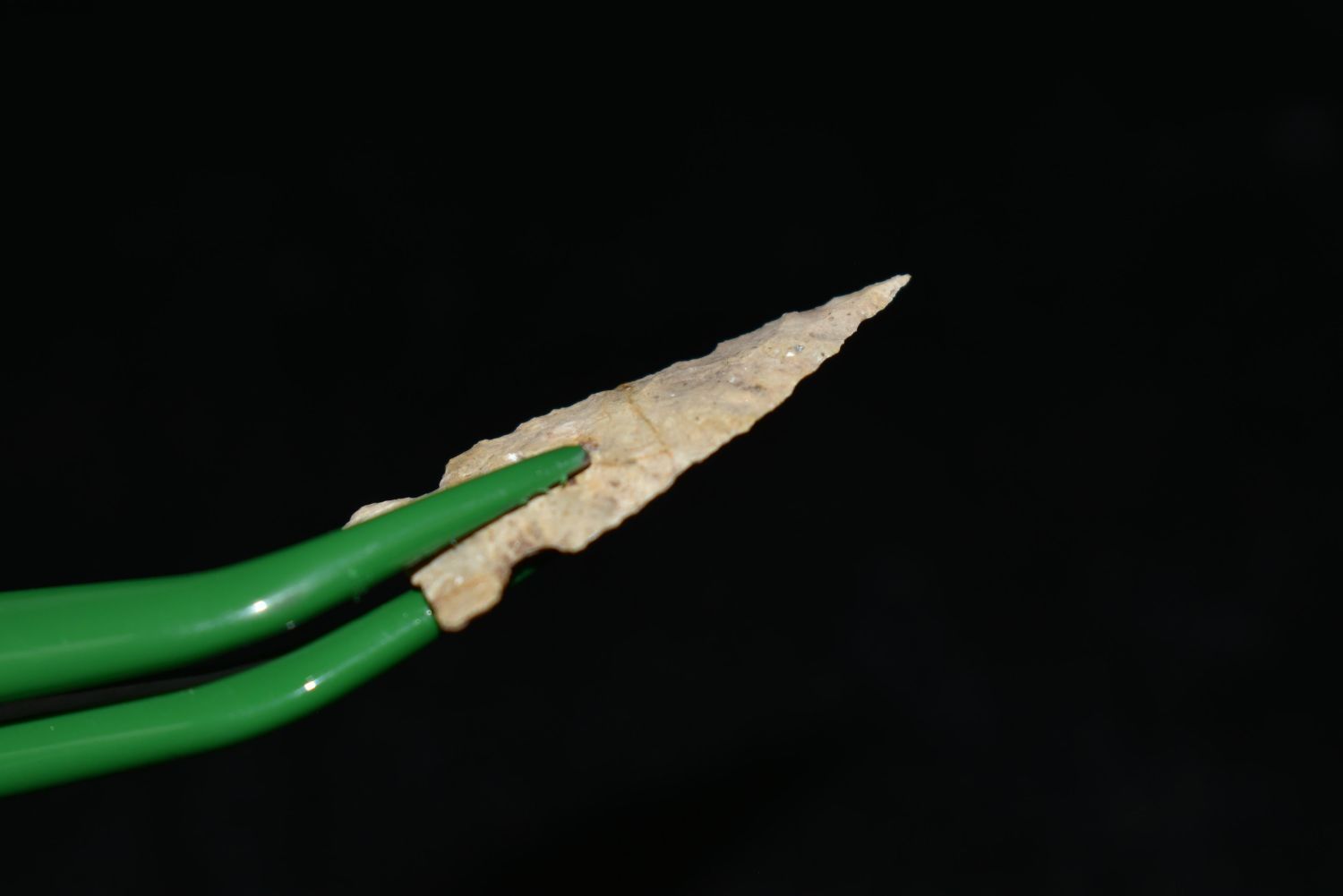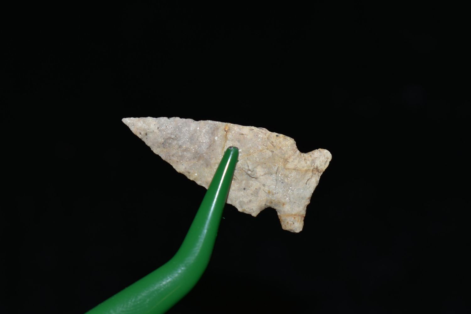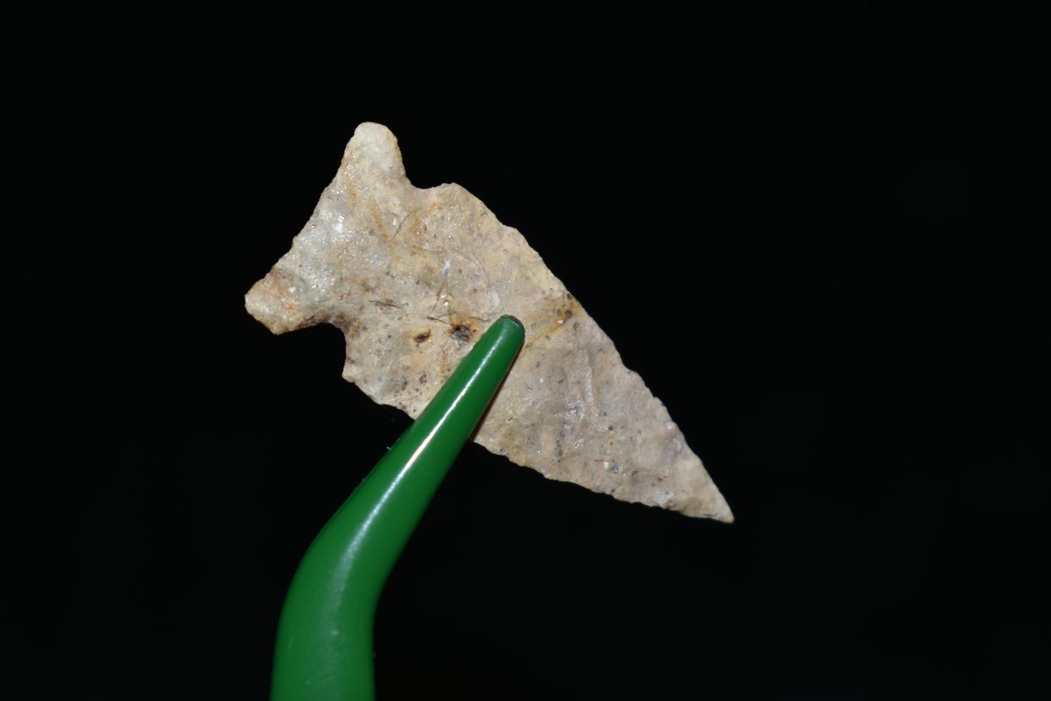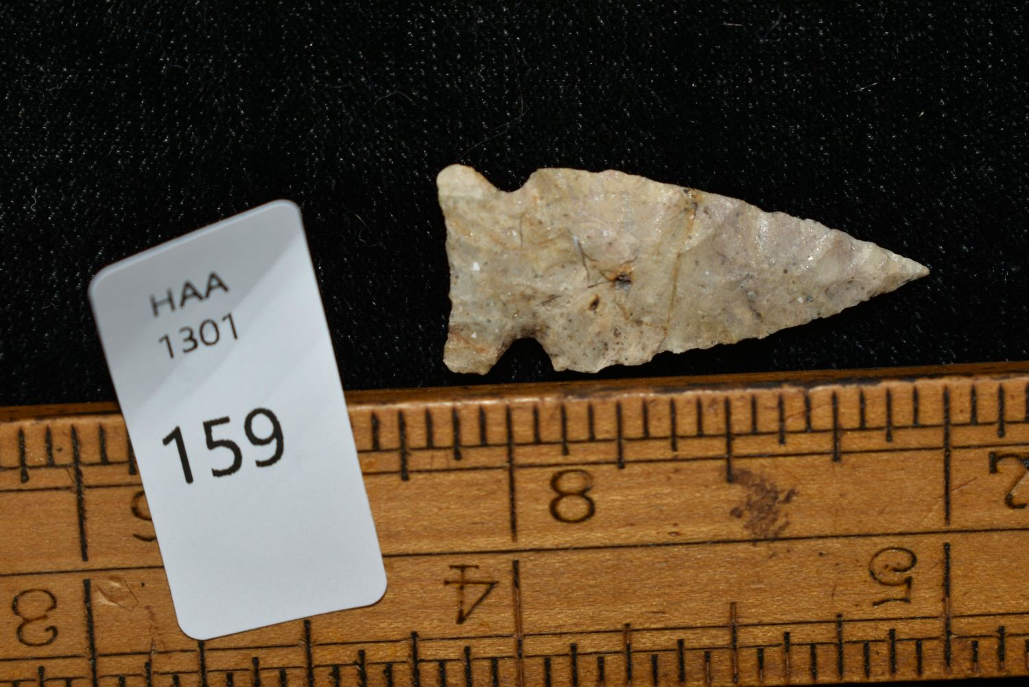 1 1/8" Avonlea point. Found in Musselshell, Montana. Creel Poore was born and raised in Musselshell, Montana where he found his first arrowhead at a very early age. This led Creel on a lifetime search for Montana’s prehistoric past. Creel owned a ranch in Musselshell and collected from sites and in and around the Musselshell River and tributaries. Every piece in Creel’s collection is personally found. He did not purchase pieces, nor did he accept pieces as gifts. He took pride in the fact he found every piece. He also made the cedar frames from cedar trees that were cut on his ranch. Many of the pieces were collected from the buffalo jumps which were plentiful nearby